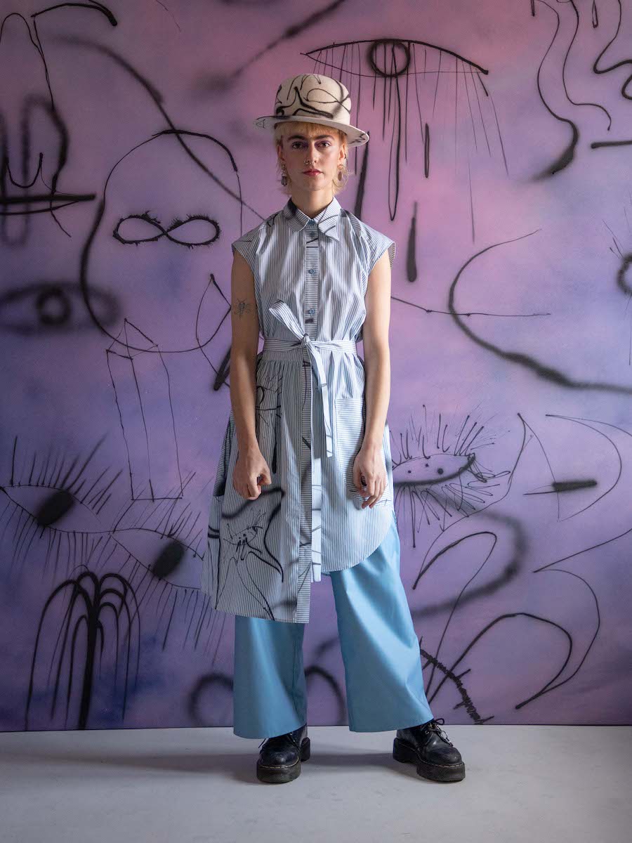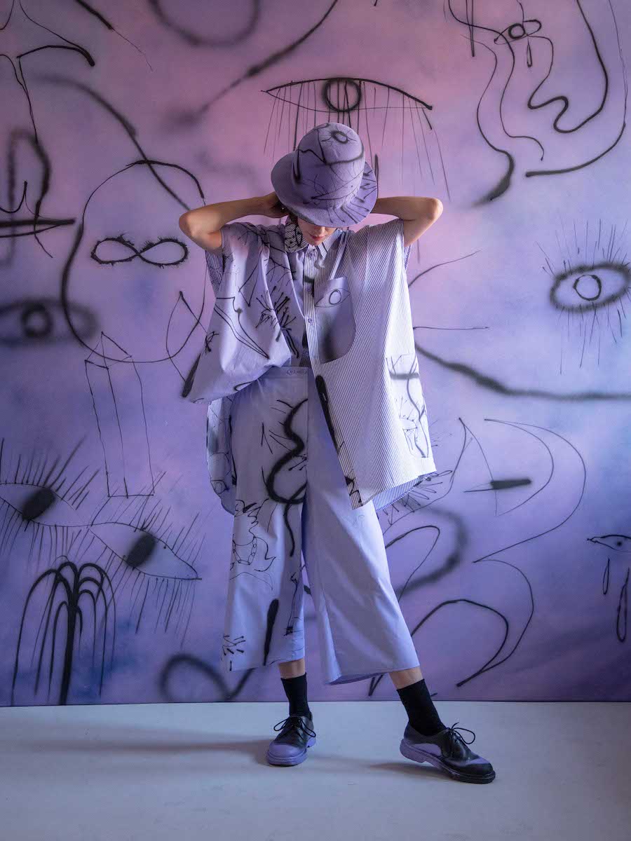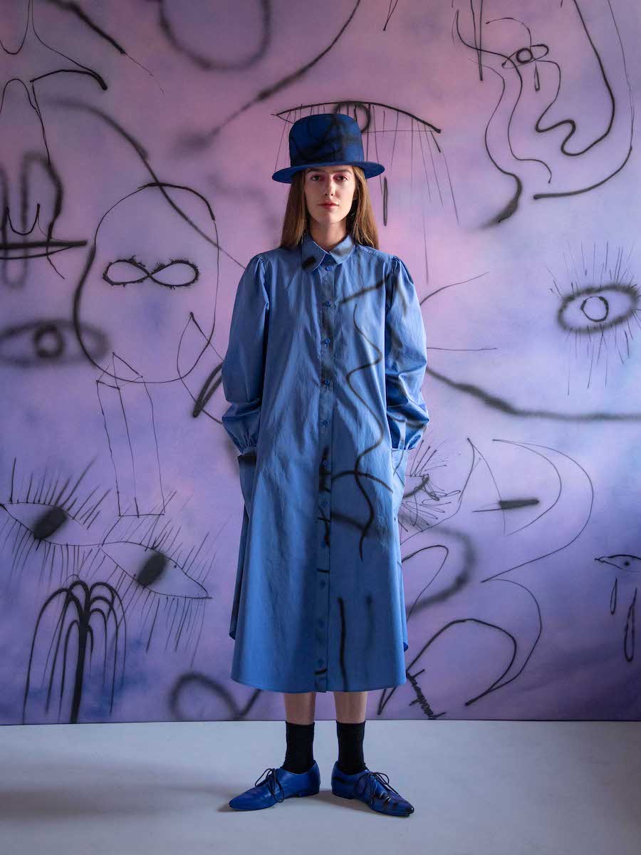 Hana’s organic response to Eva’s stories expressed by abstract illustrations is embodied by asymmetric shapes and sophisticated details. Each shirt or dress is a unique combination of shape, color, and print. The looks are intended to fit various body shapes. The collection DREAMERS was manufactured in Czechia, including fabrics, digital prints and custom buttons.