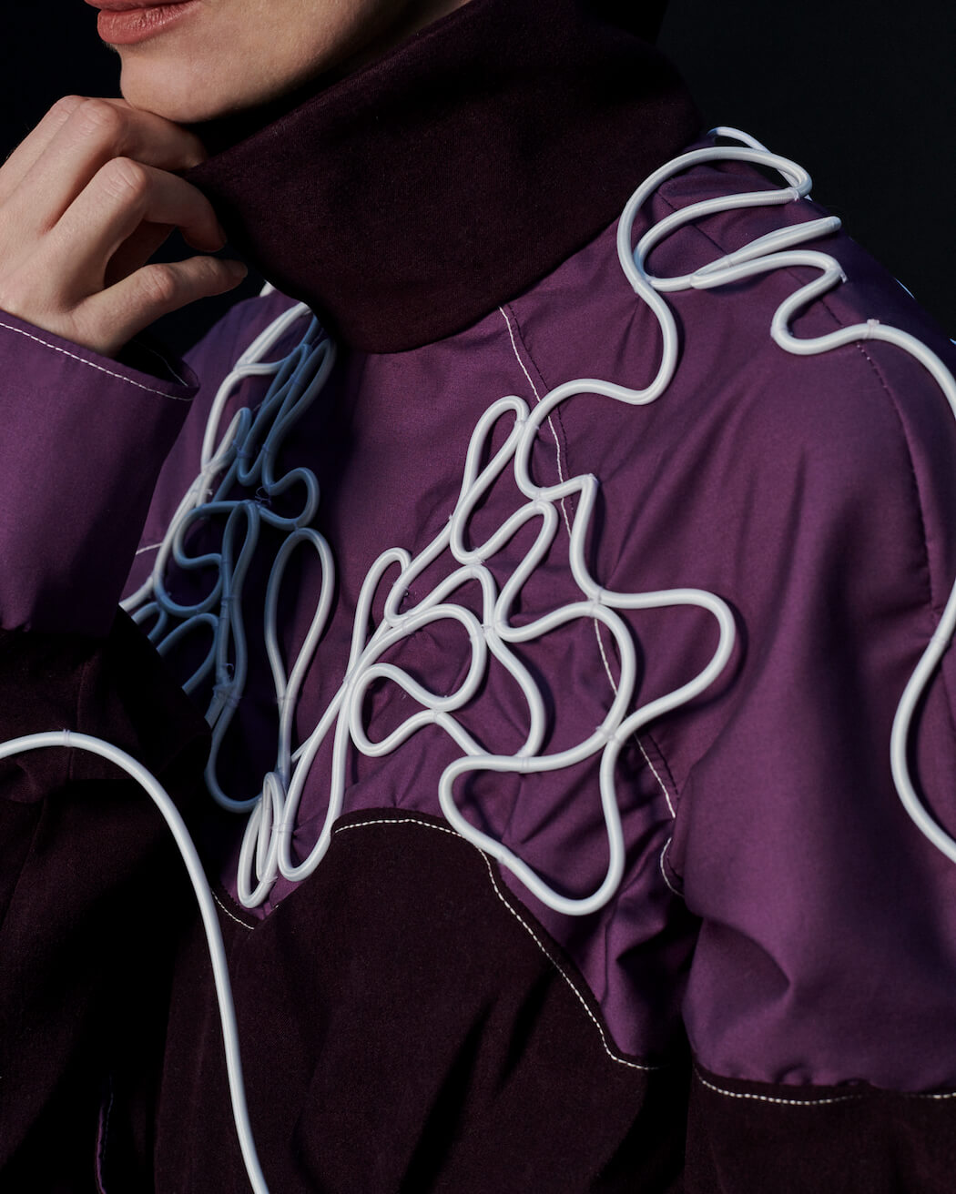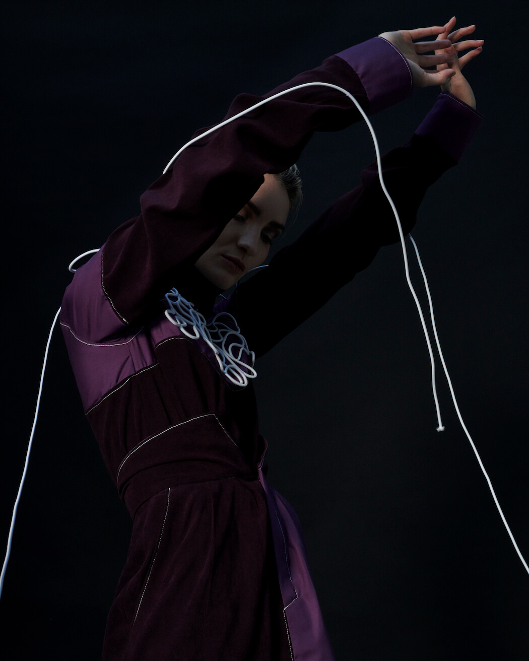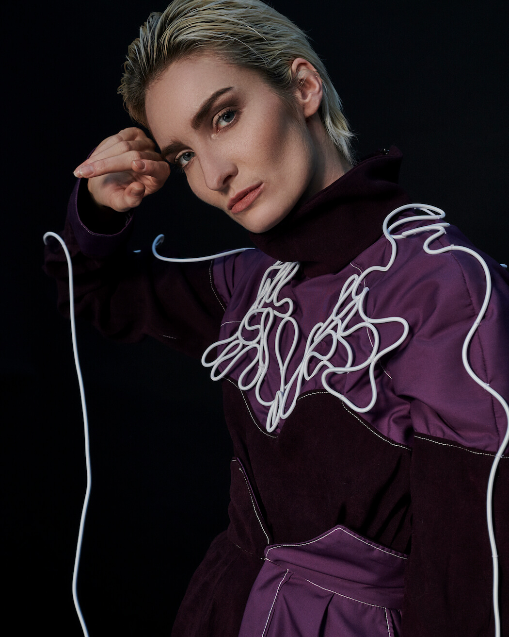 Photographer Quentin Strohmeier captured model Anika Scheibe signed at ps-modelmanagement. All fashion by Hanna Röttinger. Make up by Nina Krüger. Retouching by Kruegerretouching. “My newest collection called “Timbre” dealt with the color-blind artist Neil Harbisson. He is able to hear colors through an implanted antenna. Sound waves represent the different colors. My collection translates the heard and seen into something tangible and combines three senses at the same time: hearing, seeing and feeling. Red is the lowest tone with the largest sound wave and violet the highest tone with the shortest sound wave. My work is an artistic expression of the interaction between science, human perception of colors and fashion.” *Hanna Röttinger
