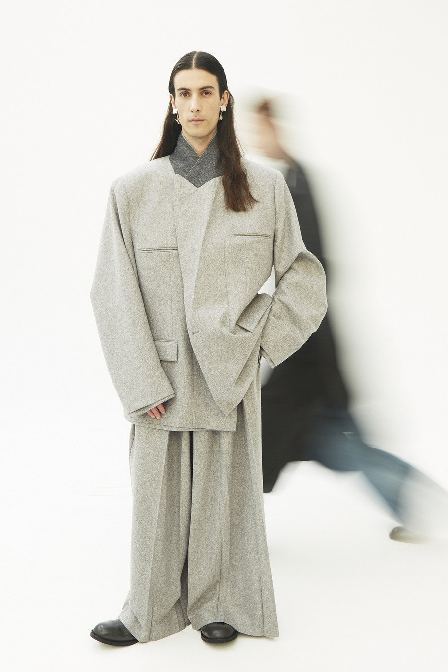 Pinstripe dances with herringbone. Grey flannel melds into bonded twill, washed denim, and biker leather—all become canvases for the Hed Mayner touch. Here, a jacket isn’t just worn; it is inhabited alongside a pullover and track pants—a silent manifesto of self, stripped of the burden of status or intent.