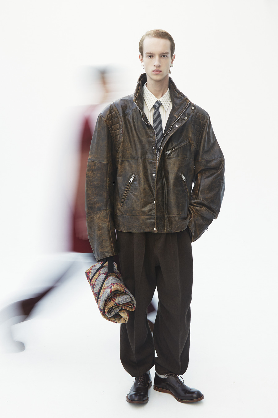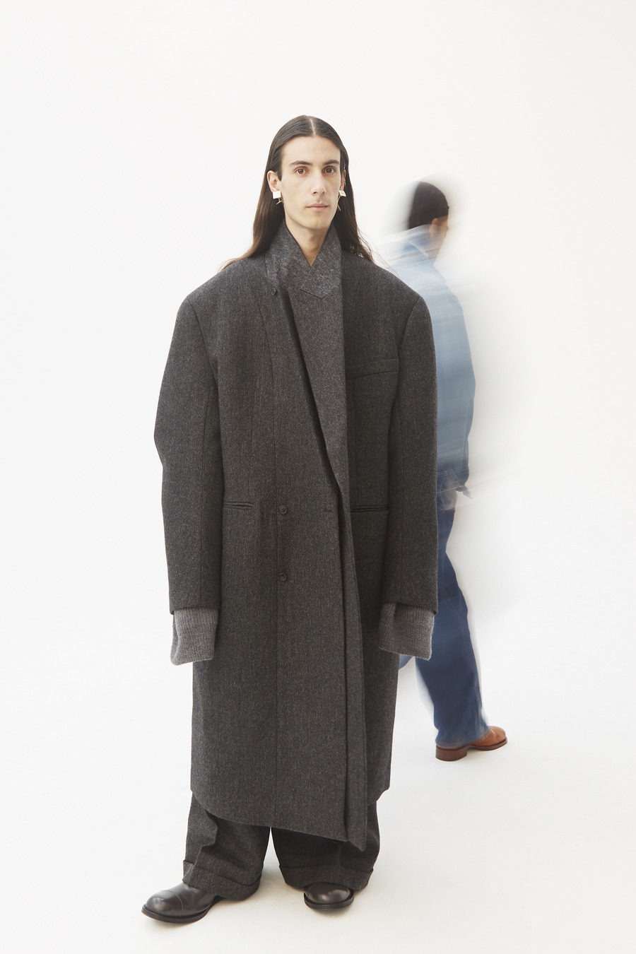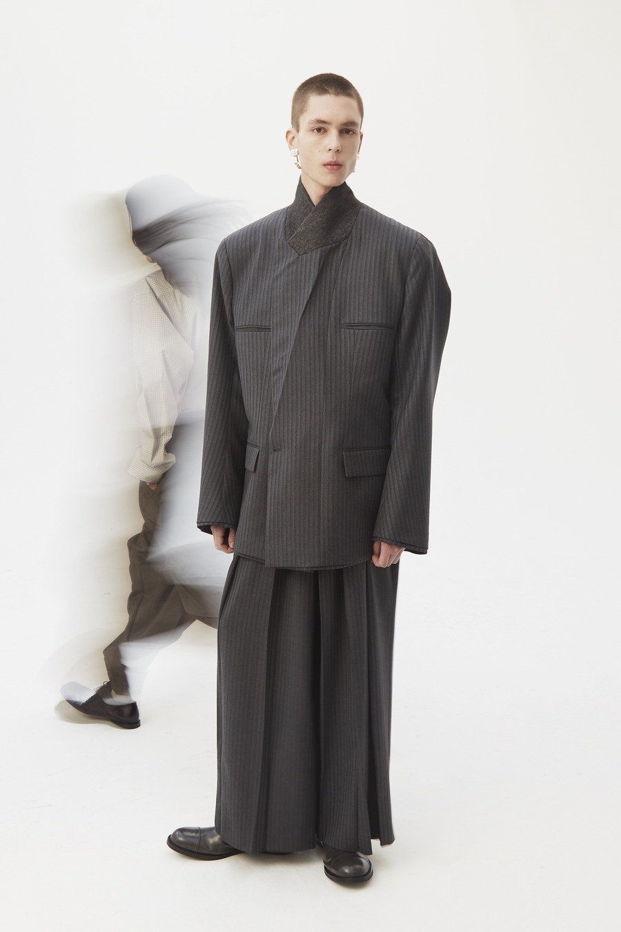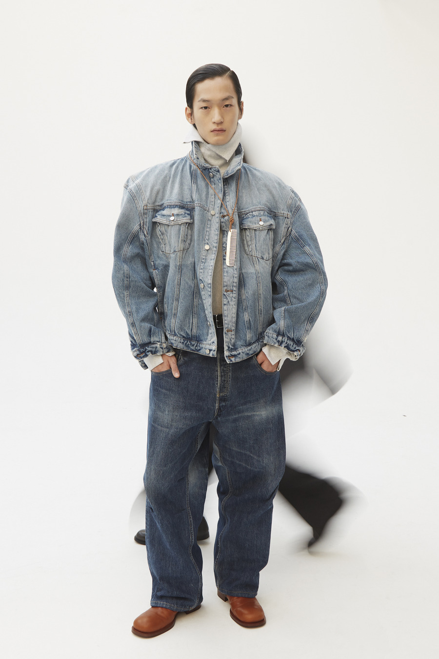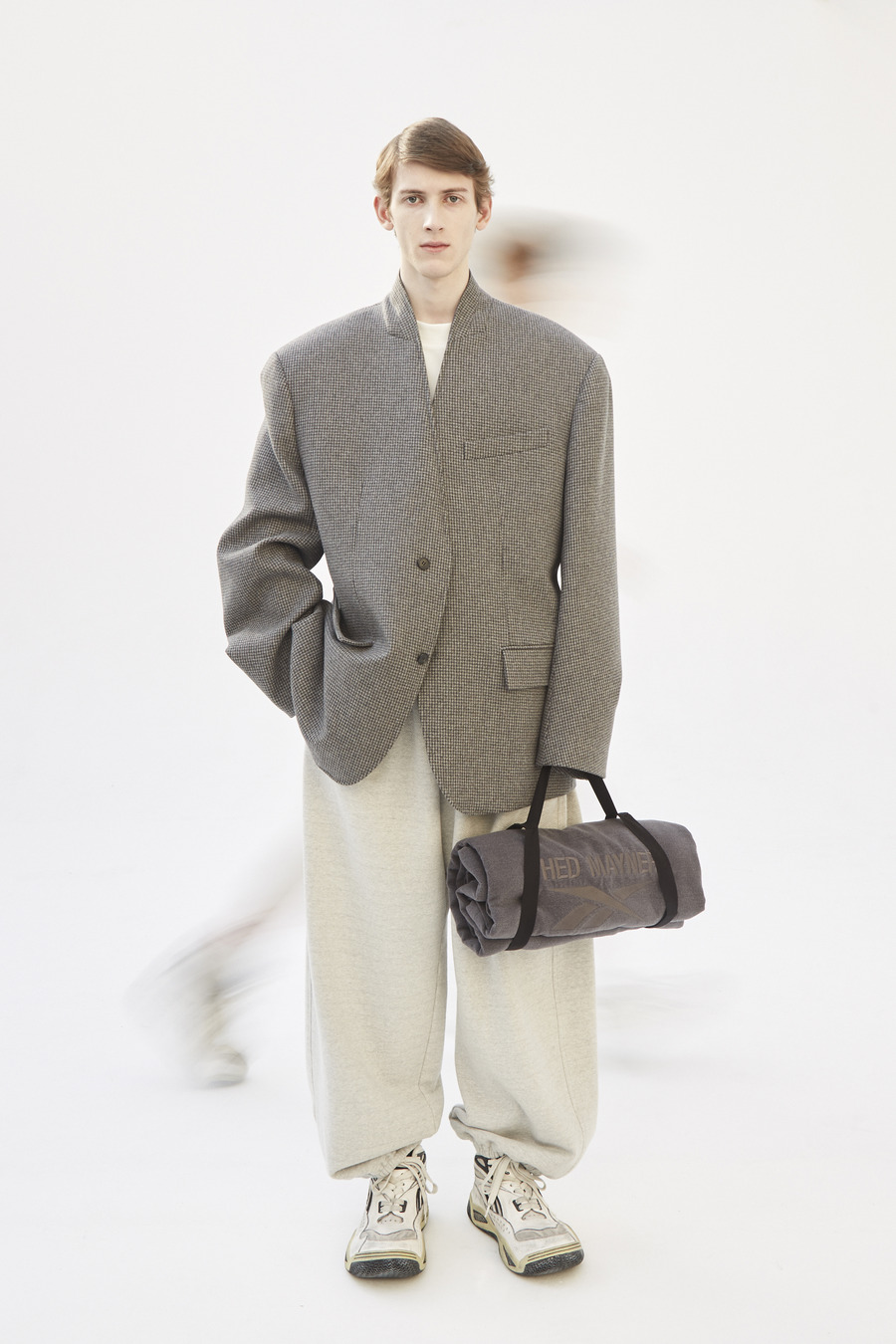 Pinstripe dances with herringbone. Grey flannel melds into bonded twill, washed denim, and biker leather—all become canvases for the Hed Mayner touch. Here, a jacket isn’t just worn; it is inhabited alongside a pullover and track pants—a silent manifesto of self, stripped of the burden of status or intent.