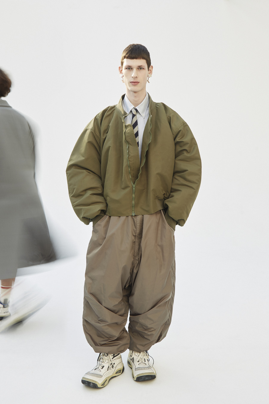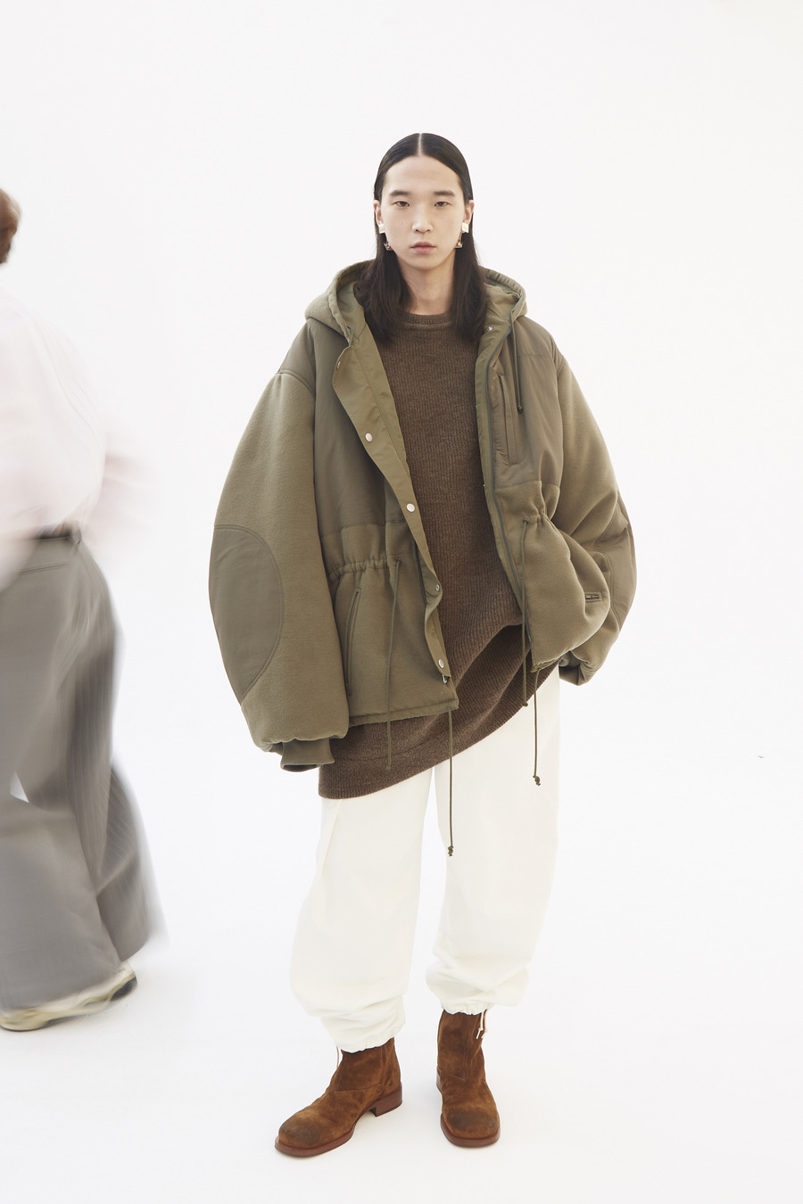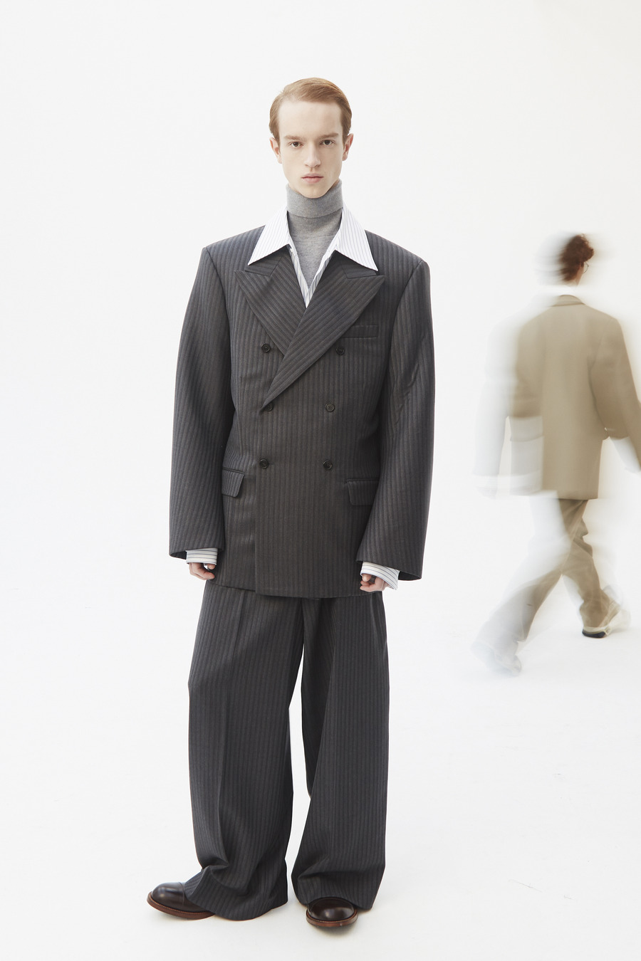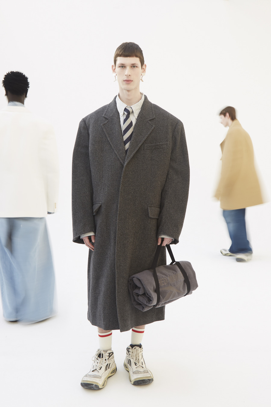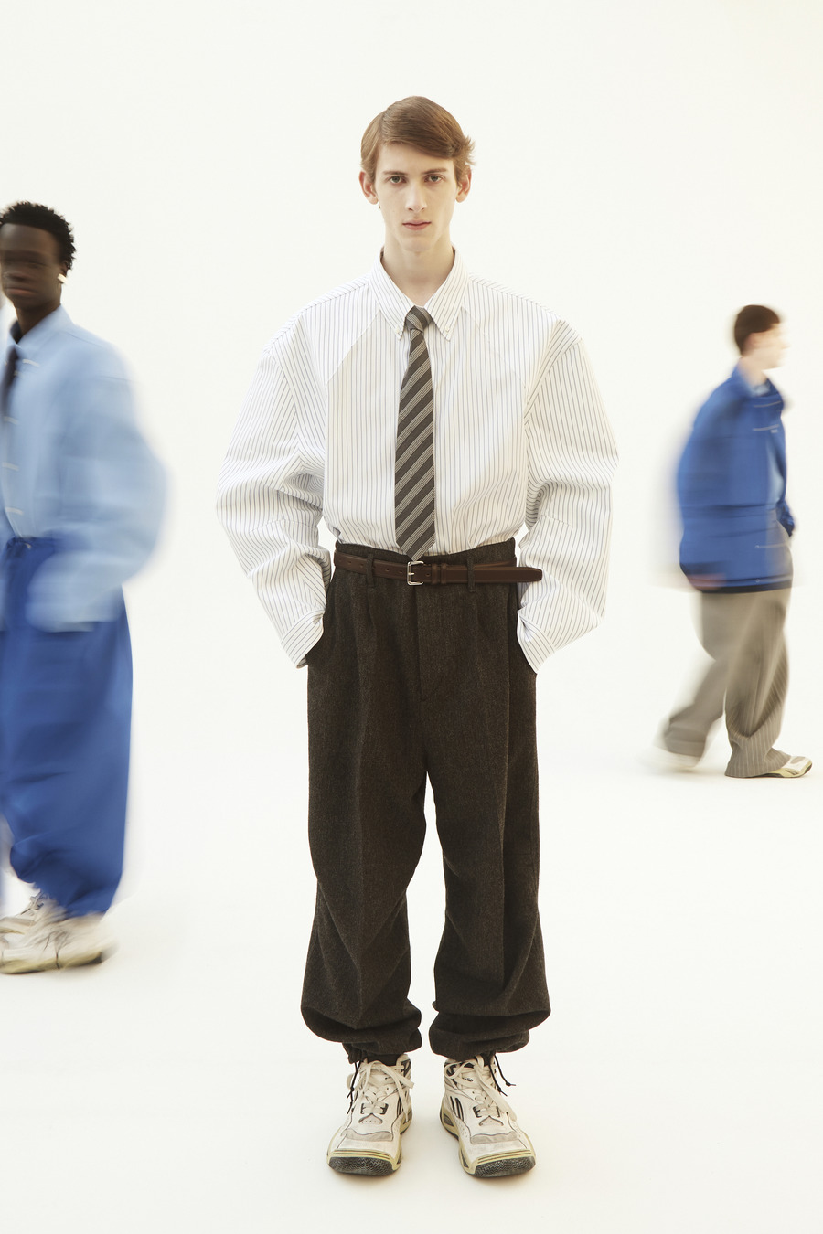 Pinstripe dances with herringbone. Grey flannel melds into bonded twill, washed denim, and biker leather—all become canvases for the Hed Mayner touch. Here, a jacket isn’t just worn; it is inhabited alongside a pullover and track pants—a silent manifesto of self, stripped of the burden of status or intent.