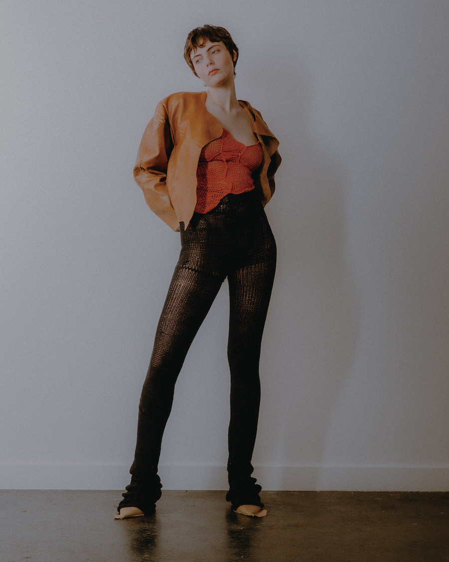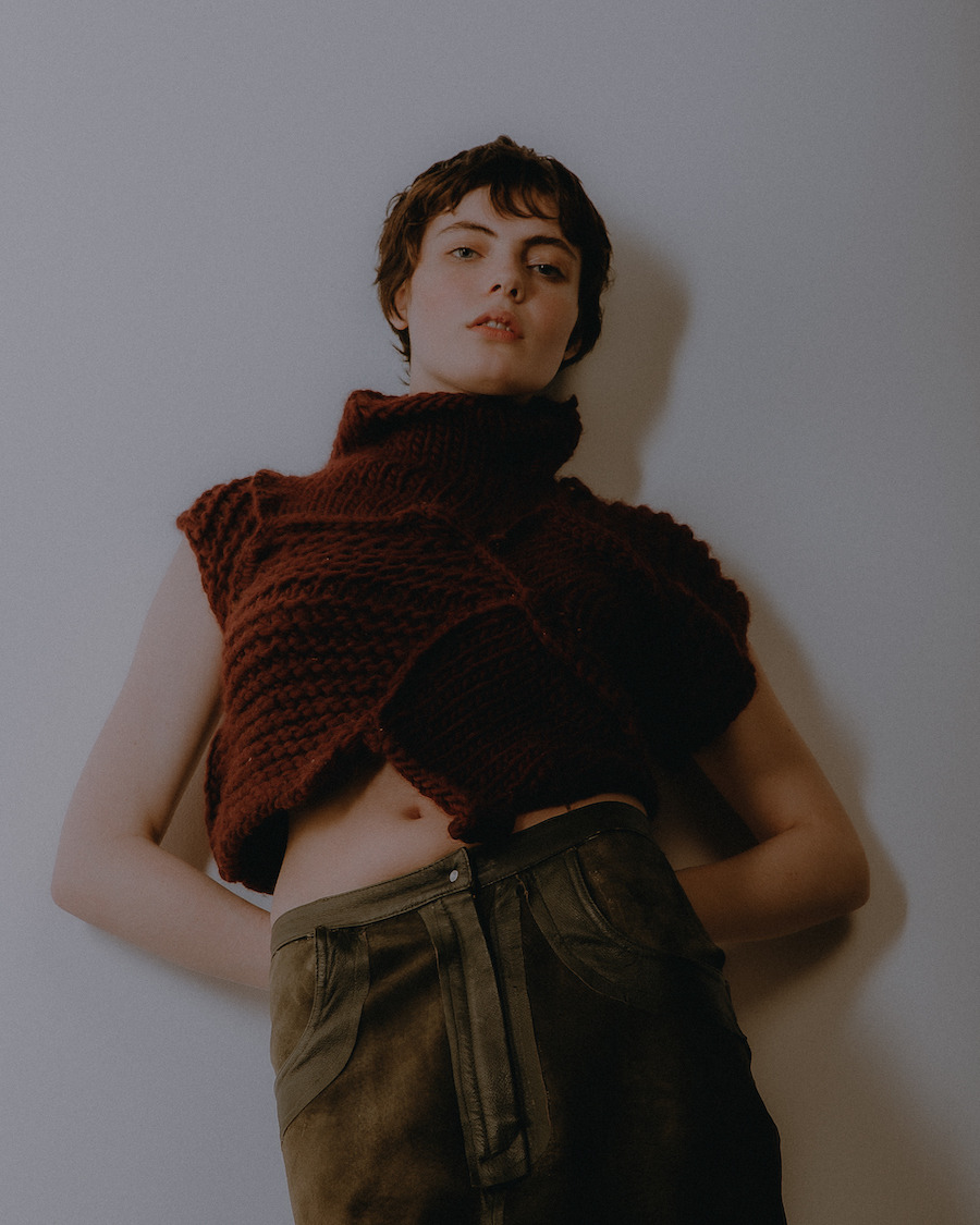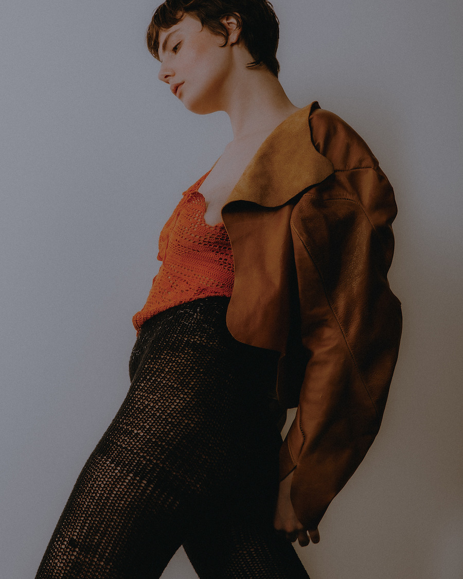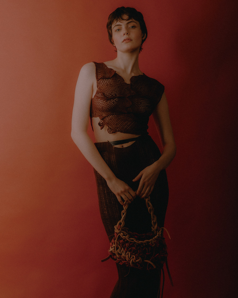 Introducing designer Nadia Maria Marino, who graduated from Central Saint Martins in 2022, is a German-Italian Designer specialising in Knitwear and Leather. Photography by Daniele Fummo. The model is Liv Packard. Art Direction by Edward James Lee. Styling by Paolo Zagoreo. Hair & Make up by Lou Box.