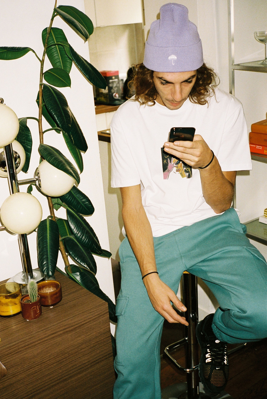 In order to highlight this Winter 22 season, Hélas stays local, capturing the before and after their own baby foot World Cup tournament in Paris. This shoot creates a playful atmosphere, following the clothes as they are worn in a flat before the tournament, during the tournament, and after the tournament skating in the streets.