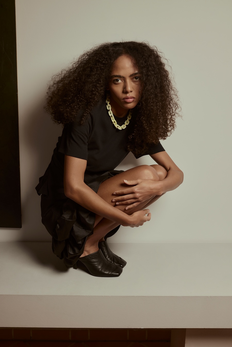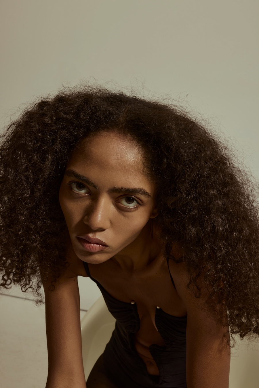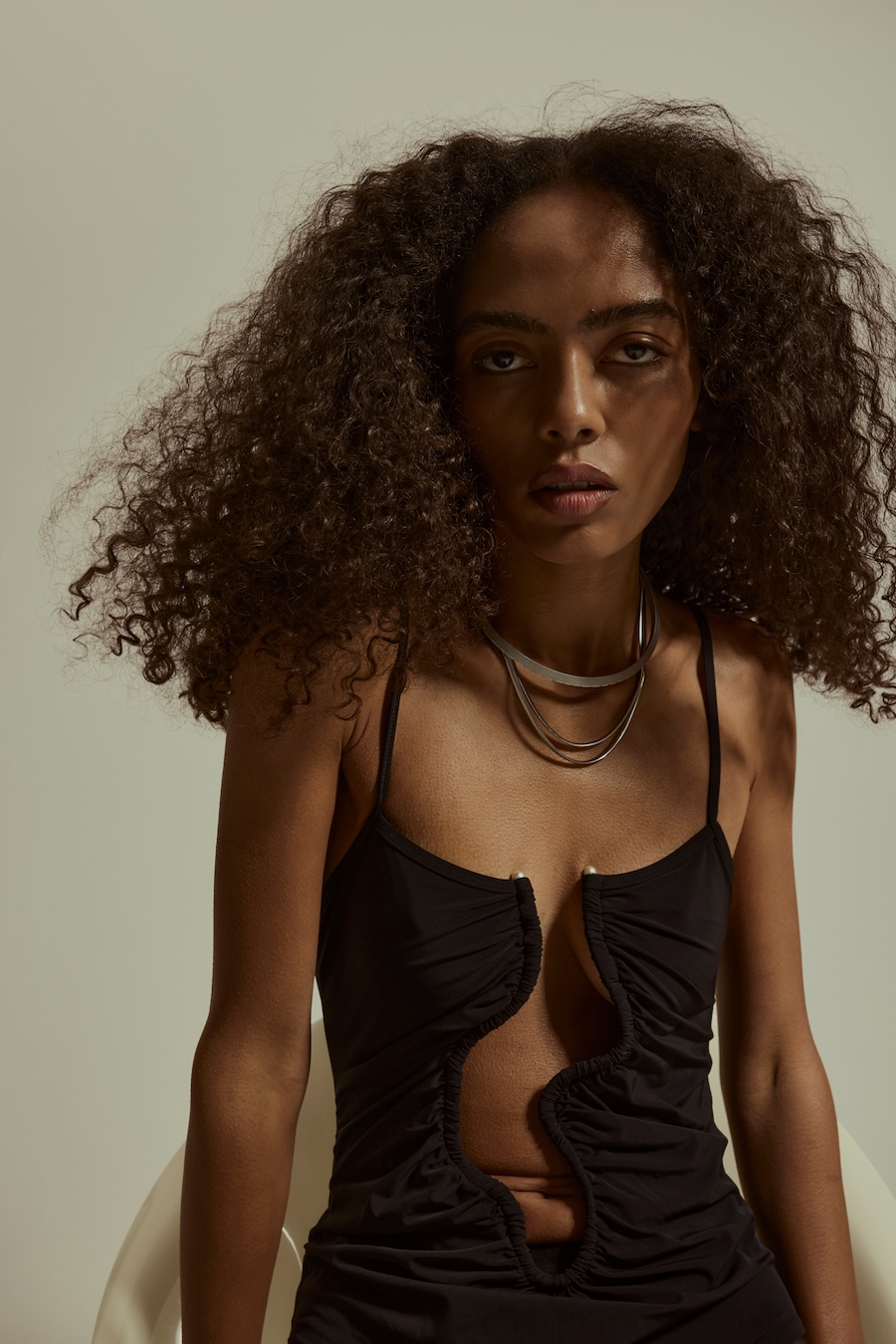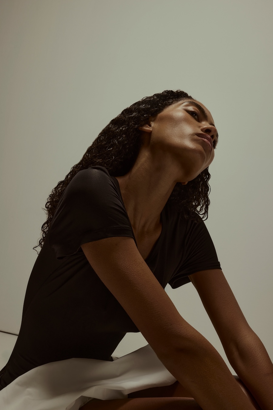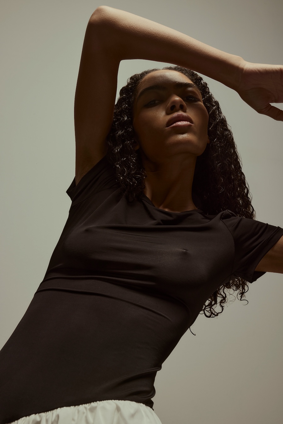 A KALTBLUT exclusive. Photography by Sarah Aurora Kaufmann. The model is Naima Estrella. Make-up by Chiara Arends. Developed with stylist Stella Lukaschewski, Held in Stillness explores the power of quiet presence in an age of constant visibility. The body appears composed and restrained, with subtle yet charged poses balancing tension and softness. Reduced silhouettes, shadow, and texture define the visual language, distilling fashion to form and material. The images capture moments of pause and concentration, presenting stillness and intimacy as expressions of strength.