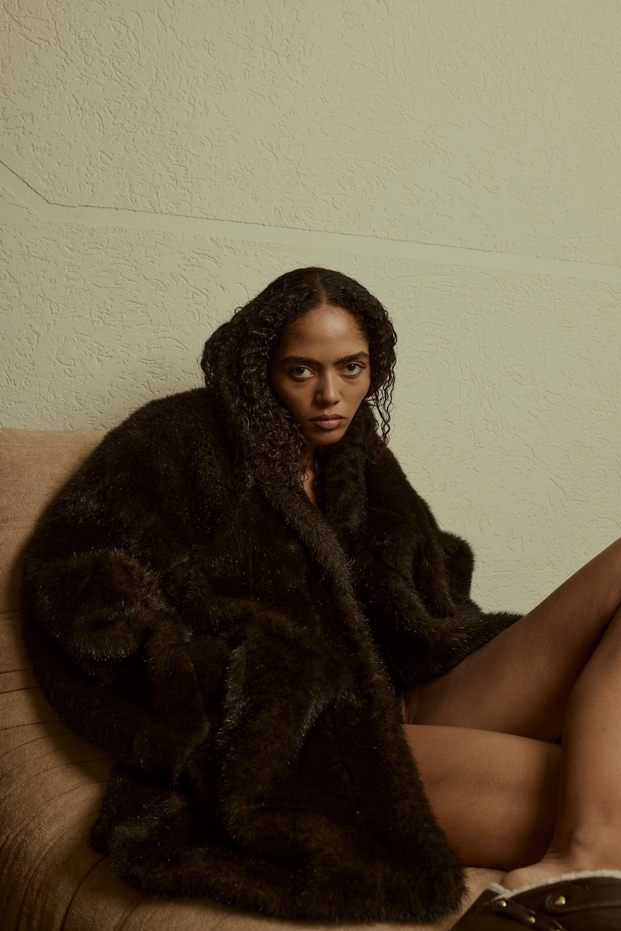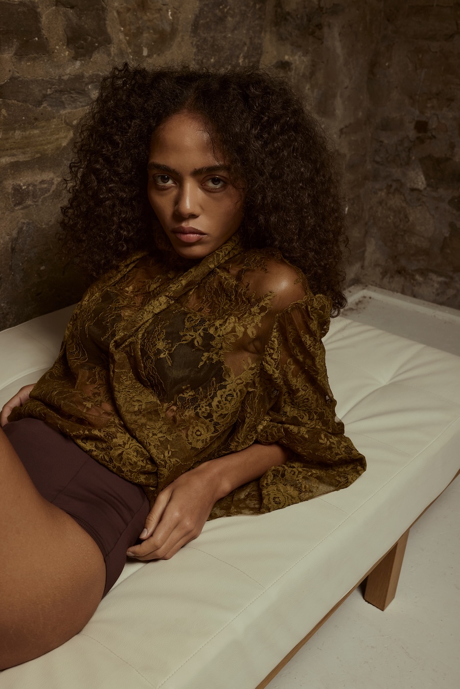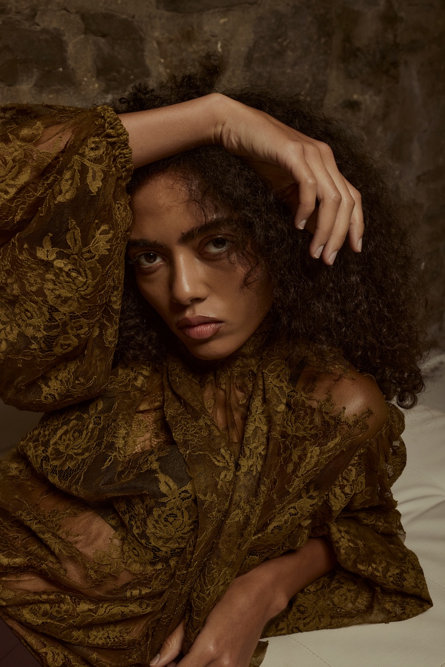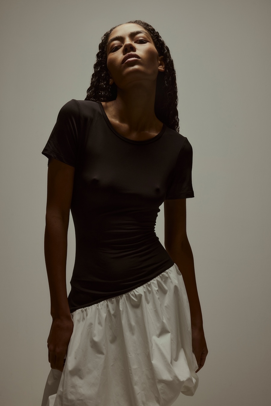 A KALTBLUT exclusive. Photography by Sarah Aurora Kaufmann. The model is Naima Estrella. Make-up by Chiara Arends. Developed with stylist Stella Lukaschewski, Held in Stillness explores the power of quiet presence in an age of constant visibility. The body appears composed and restrained, with subtle yet charged poses balancing tension and softness. Reduced silhouettes, shadow, and texture define the visual language, distilling fashion to form and material. The images capture moments of pause and concentration, presenting stillness and intimacy as expressions of strength.