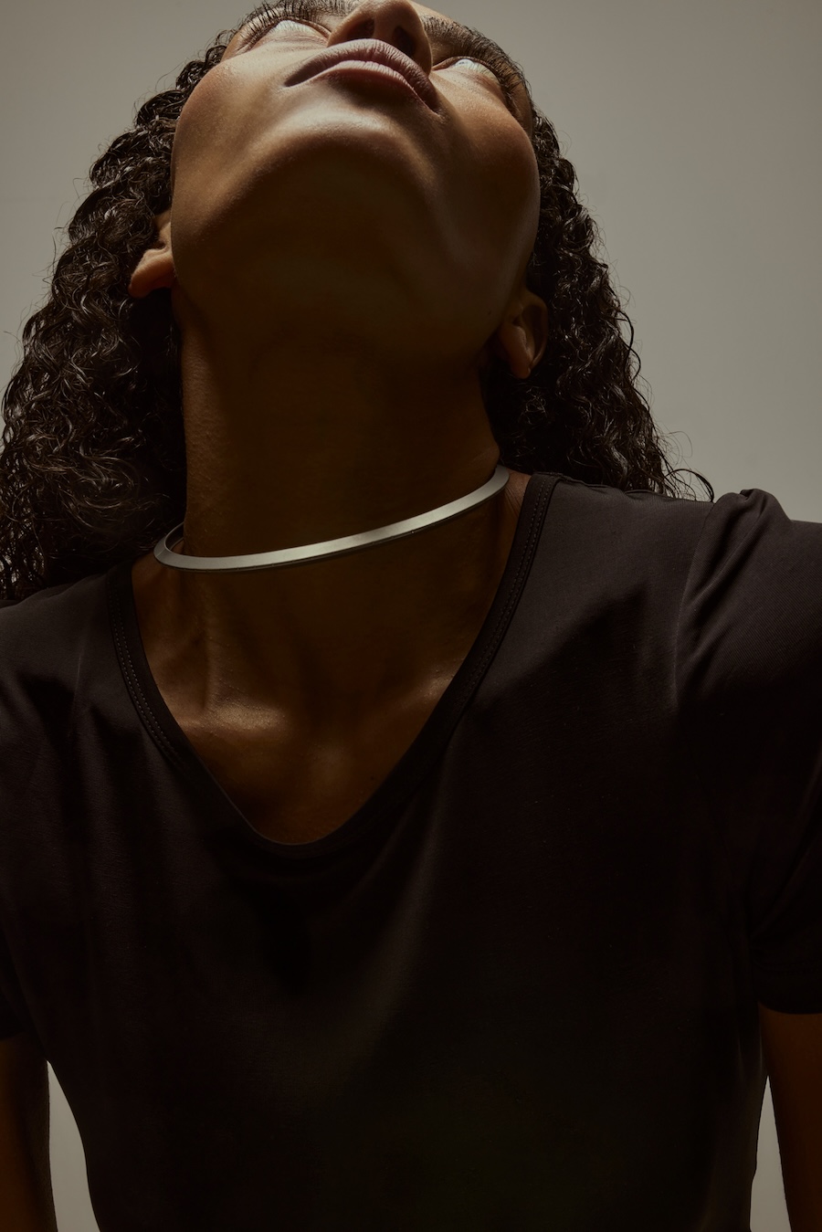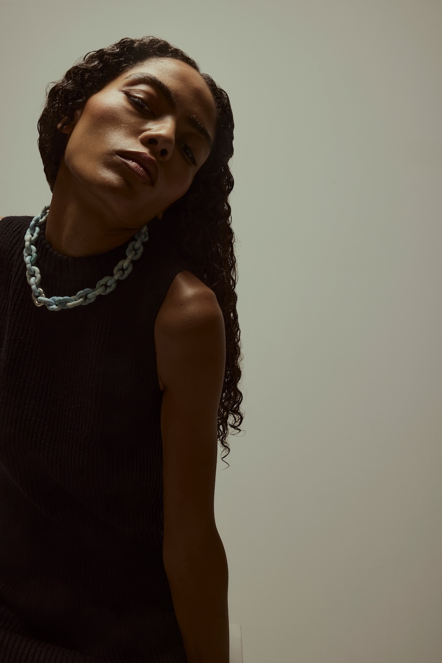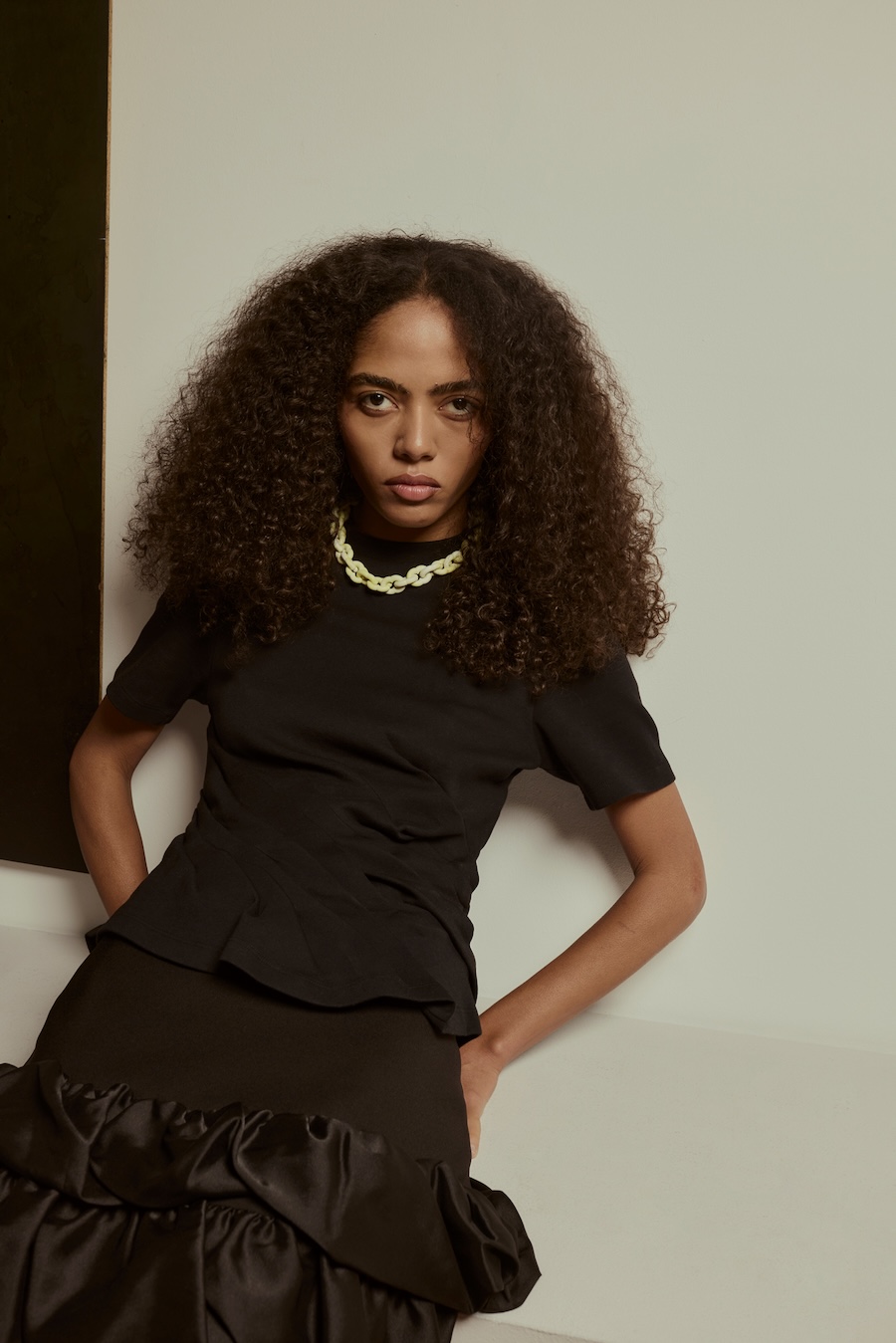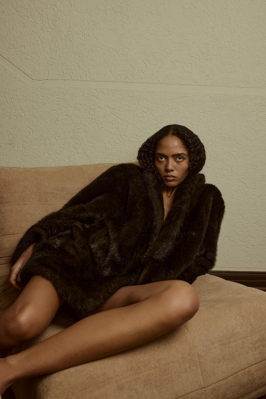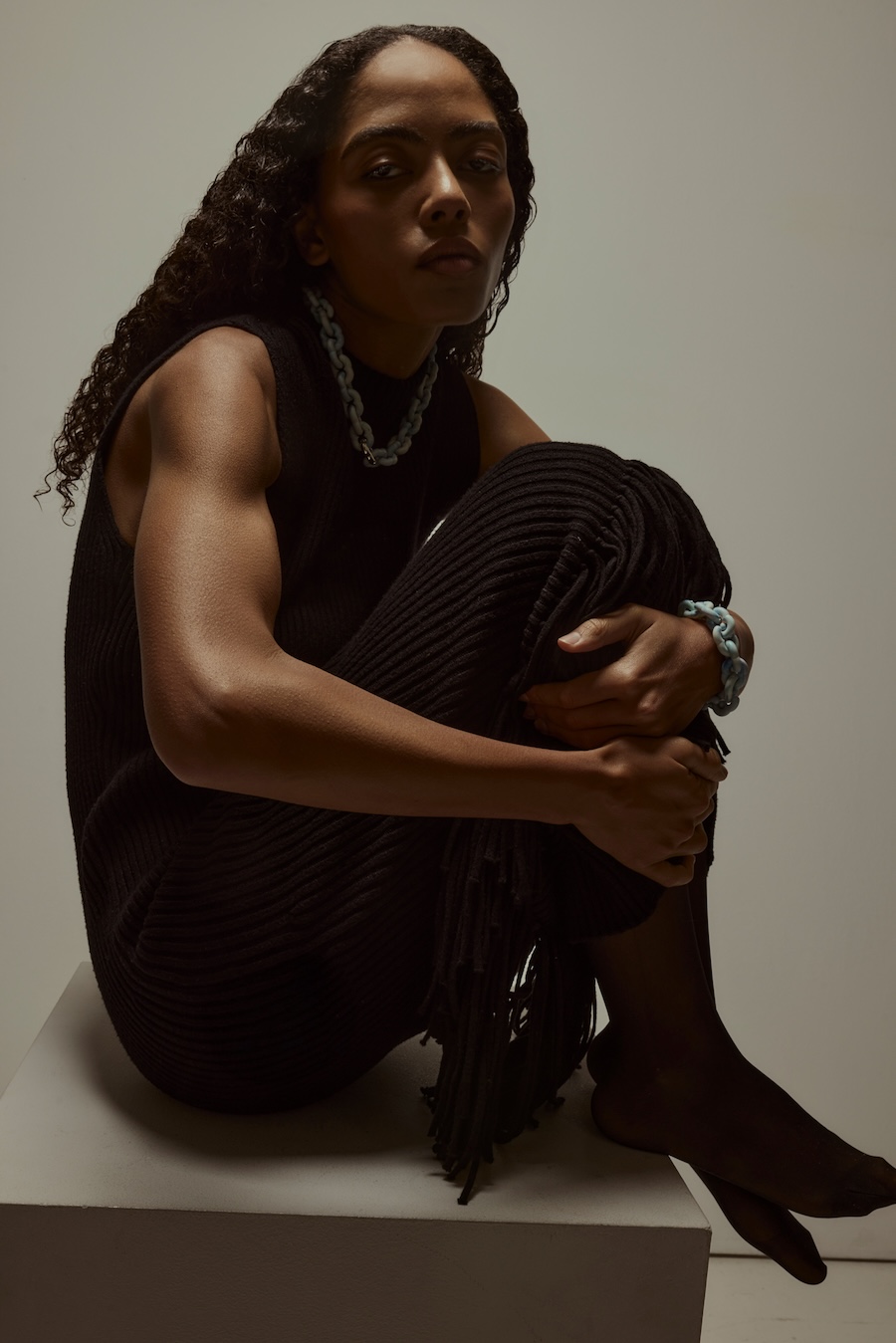 A KALTBLUT exclusive. Photography by Sarah Aurora Kaufmann. The model is Naima Estrella. Make-up by Chiara Arends. Developed with stylist Stella Lukaschewski, Held in Stillness explores the power of quiet presence in an age of constant visibility. The body appears composed and restrained, with subtle yet charged poses balancing tension and softness. Reduced silhouettes, shadow, and texture define the visual language, distilling fashion to form and material. The images capture moments of pause and concentration, presenting stillness and intimacy as expressions of strength.