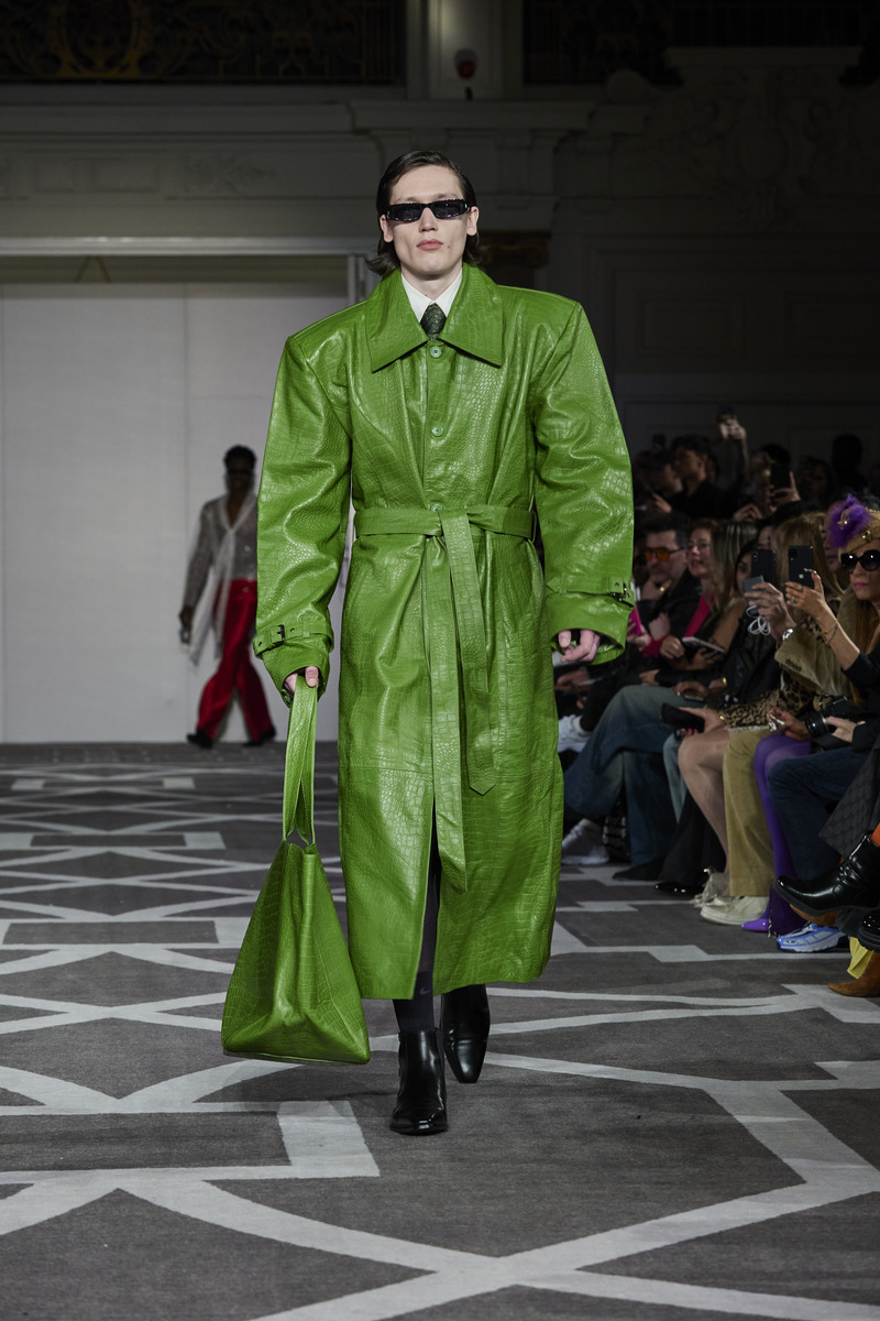 Luxurious fabrics such as cashmere, wool, satin, and mesh have been beautifully rendered into strong tailored silhouettes, from voluminous long coats to short-cropped styles via flared trousers and oversized bags. With hand-knitted multi-coloured crochet details from the brand’s collaboration with Yorkshire-based Laxtons Yarn, the collection at once champions the heritage of fine tailoring while also pushing its envelope.