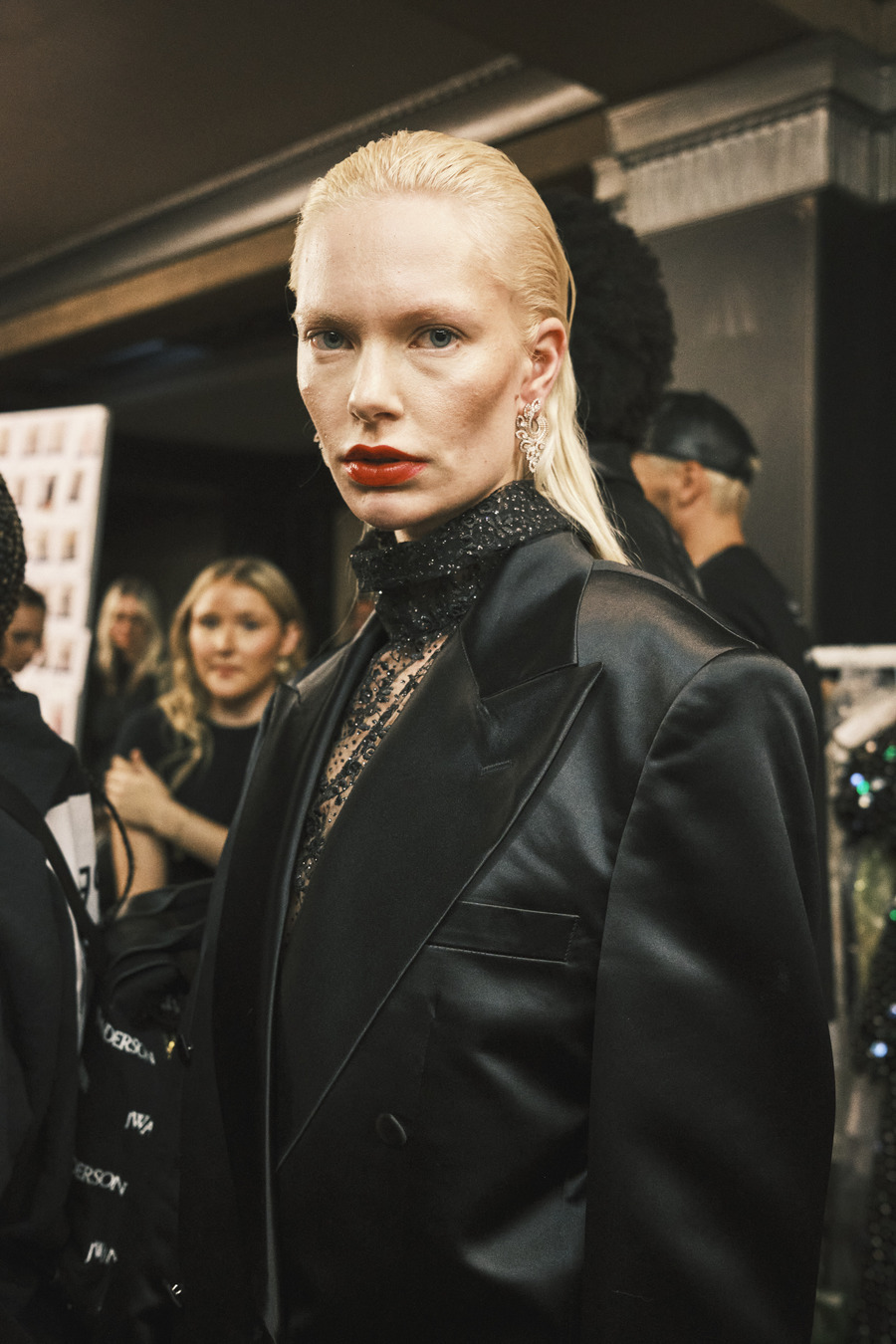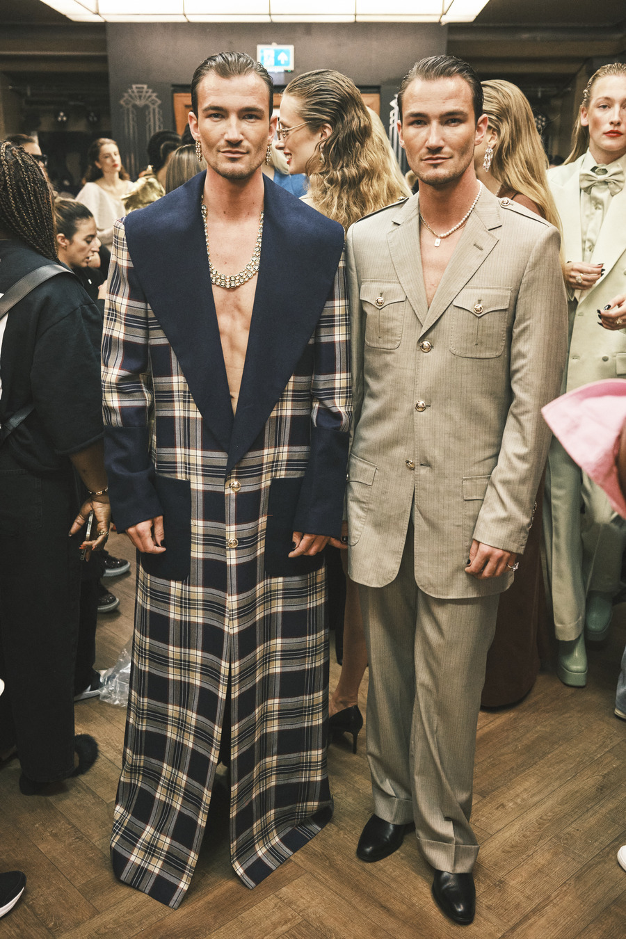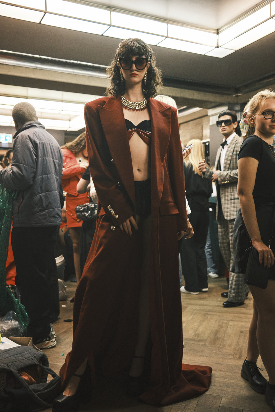 The collection also boasts impeccably well-structured and oversized floor-length overcoats and broad-shouldered blazers, reflecting yet again the re-occurring theme of empowerment, coinciding with flowing, low-cut maxi dresses with elegant tails alongside striking suits and powerful tuxedos. Playing with height and length, adding both high and low-waisted trousers and long and short skirts to add an element of playfulness to razor-sharp British tailoring. A collection that dares to be different, pushing boundaries and allowing the wearer to own any room, all whilst feeling strong and seen.