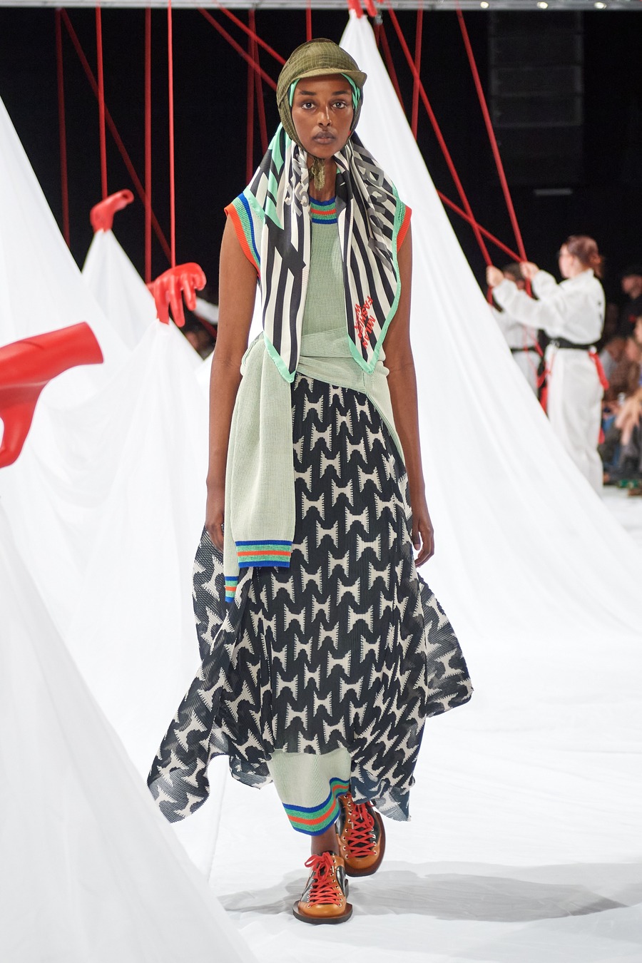 Amidst large red digitally-printed hands suspended from the ceiling alongside ropes and padded belts, white-suited assistants began manipulating these grand appendages as if they were marionettes, lifting drapery in undulating patterns that created a dreamlike atmosphere. This surreal dance emphasized a theme of fluidity—a motif Vibskov skillfully wove through the collection with curved cuts and dynamic patterns.