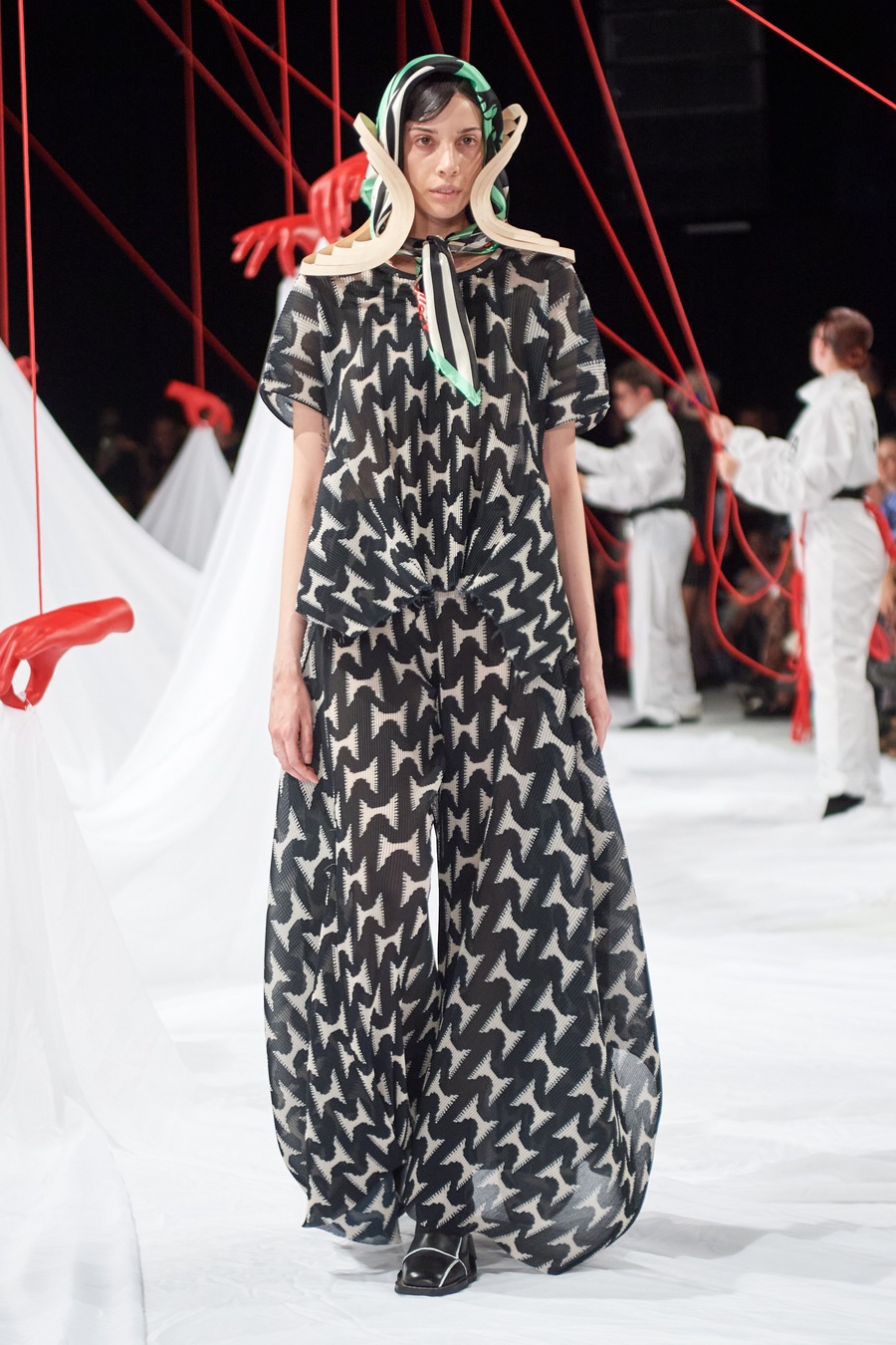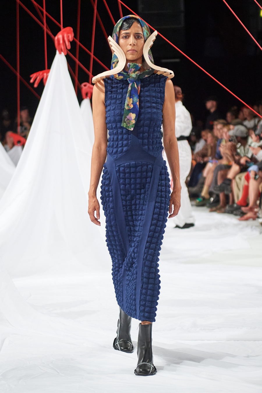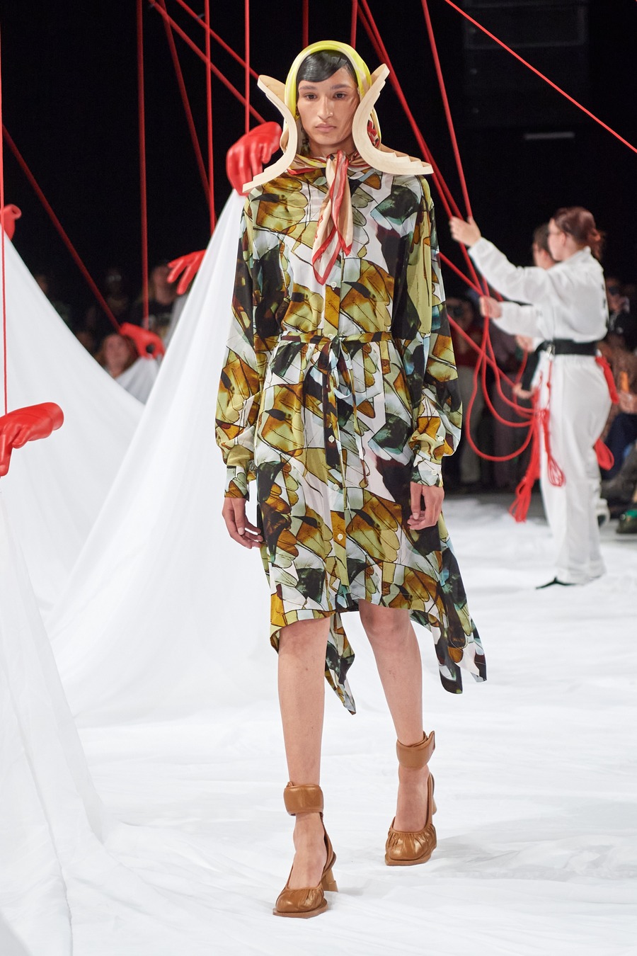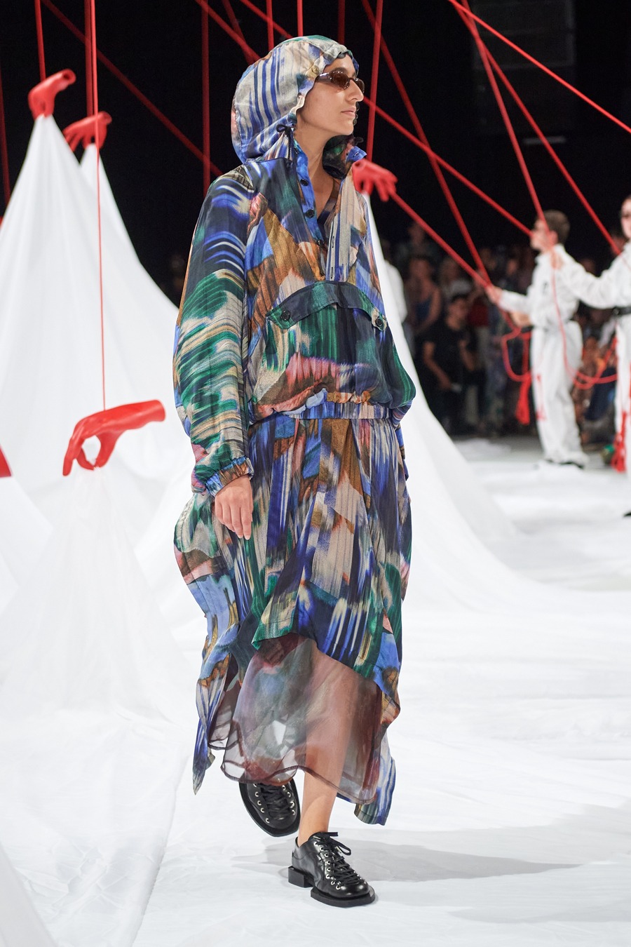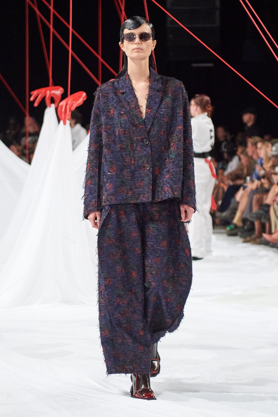 Amidst large red digitally-printed hands suspended from the ceiling alongside ropes and padded belts, white-suited assistants began manipulating these grand appendages as if they were marionettes, lifting drapery in undulating patterns that created a dreamlike atmosphere. This surreal dance emphasized a theme of fluidity—a motif Vibskov skillfully wove through the collection with curved cuts and dynamic patterns.
