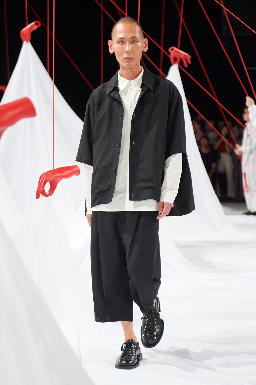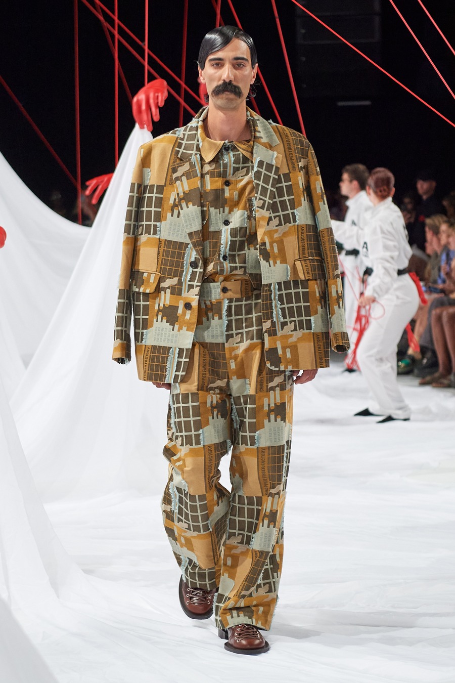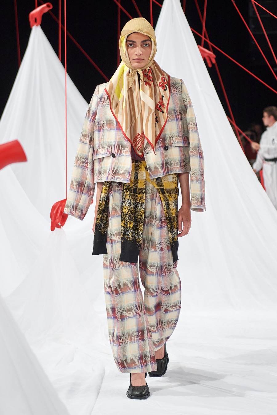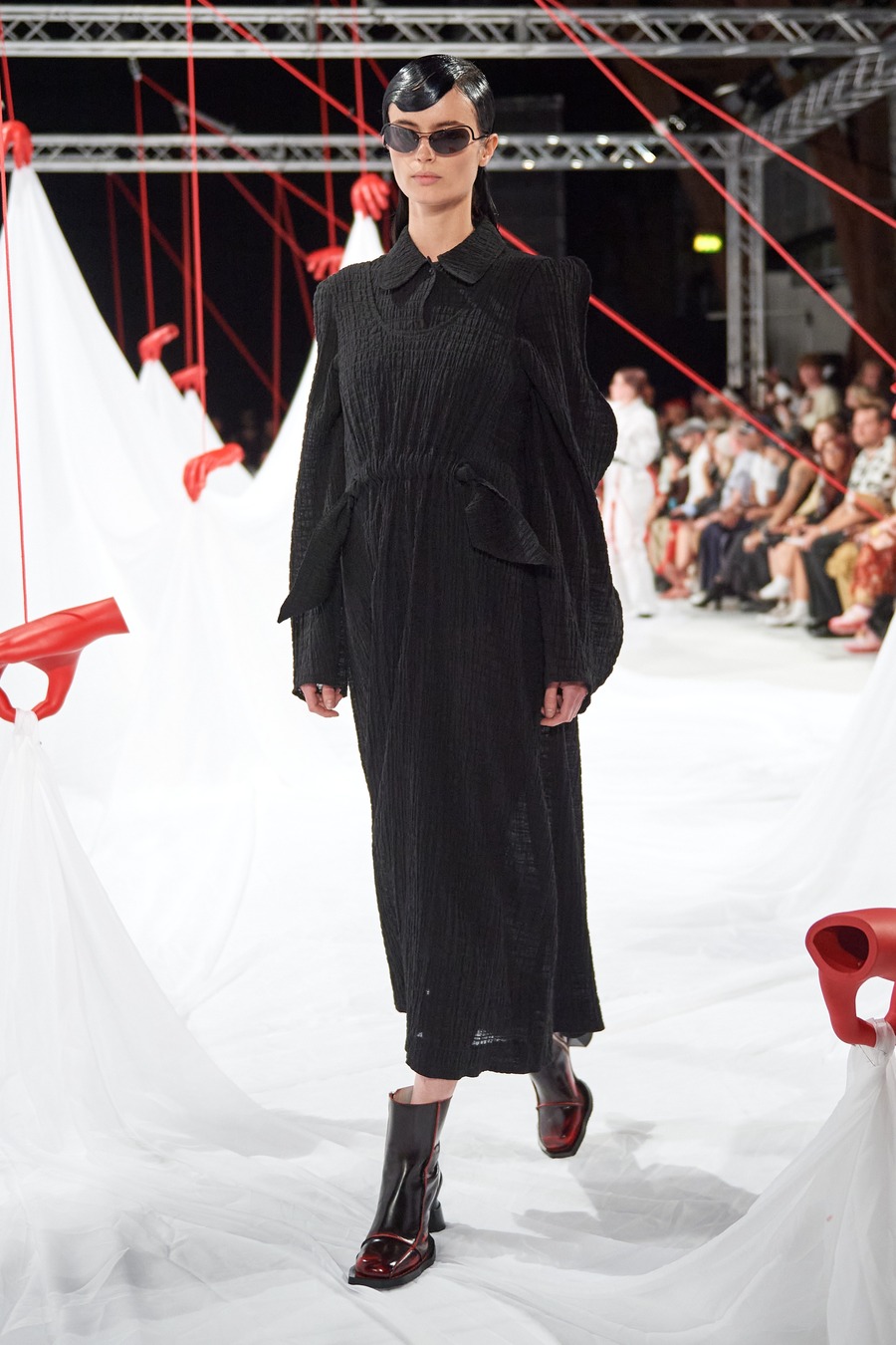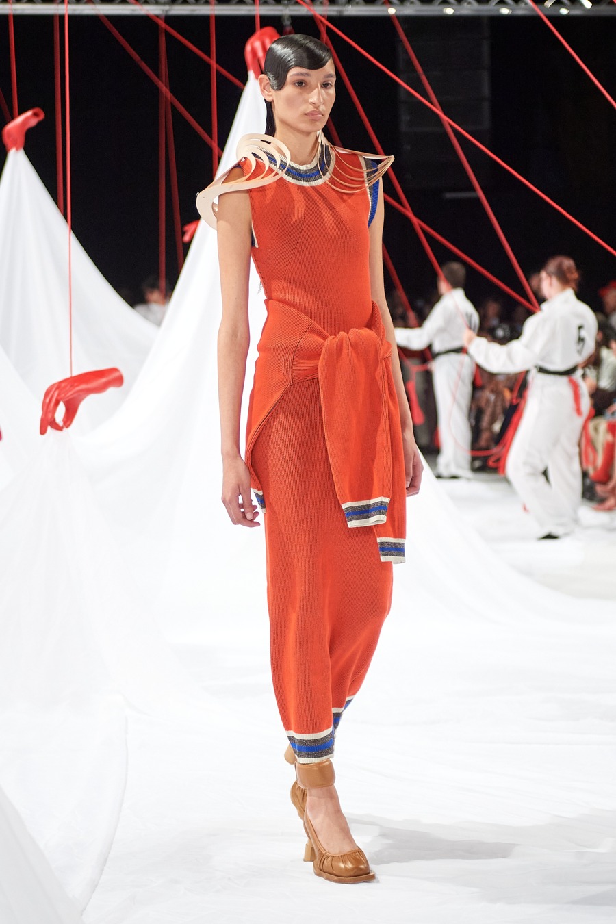 Amidst large red digitally-printed hands suspended from the ceiling alongside ropes and padded belts, white-suited assistants began manipulating these grand appendages as if they were marionettes, lifting drapery in undulating patterns that created a dreamlike atmosphere. This surreal dance emphasized a theme of fluidity—a motif Vibskov skillfully wove through the collection with curved cuts and dynamic patterns.