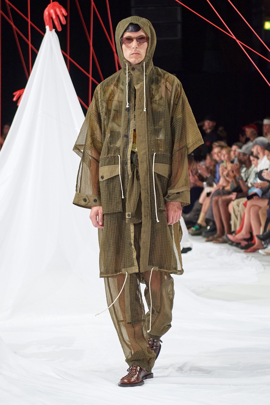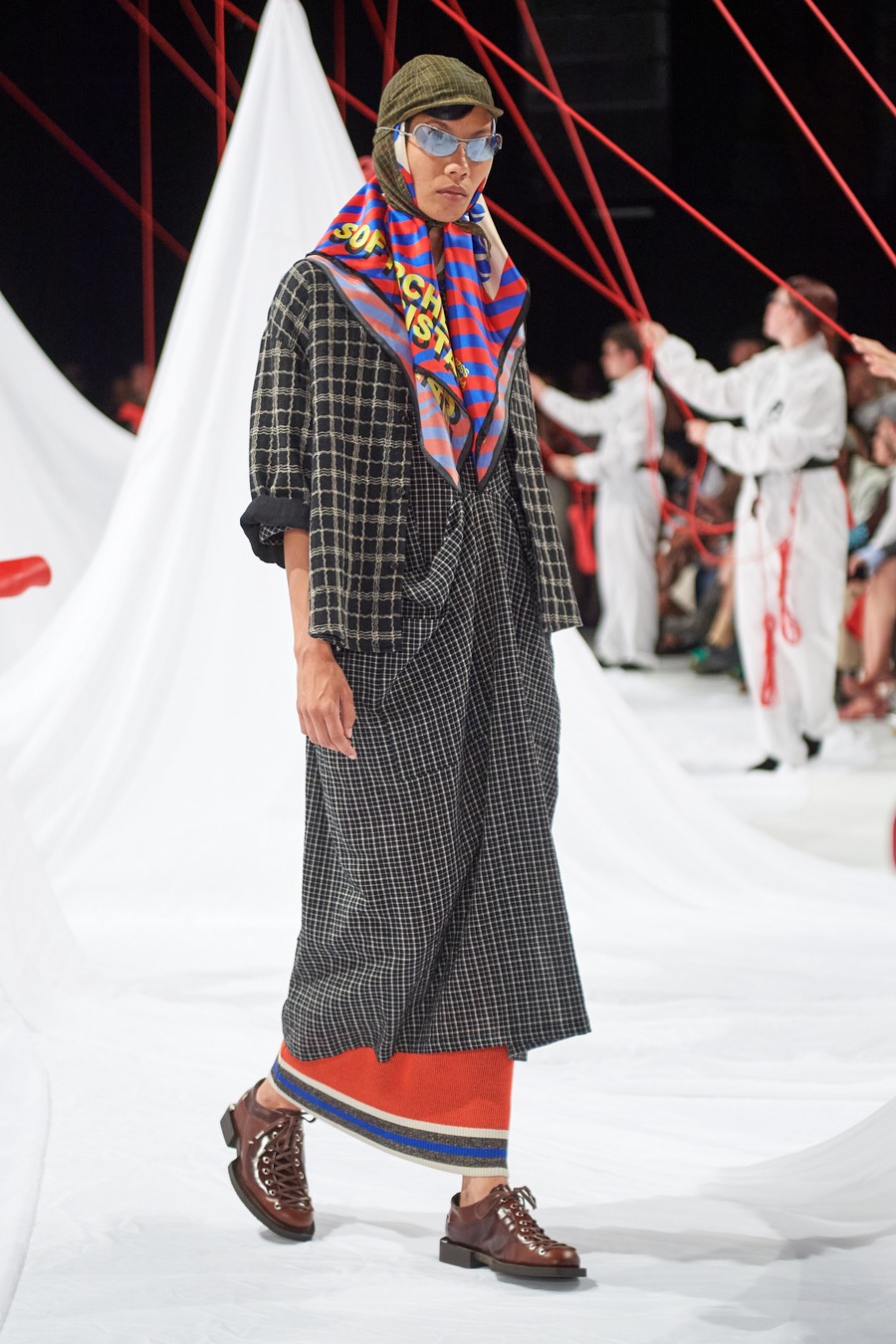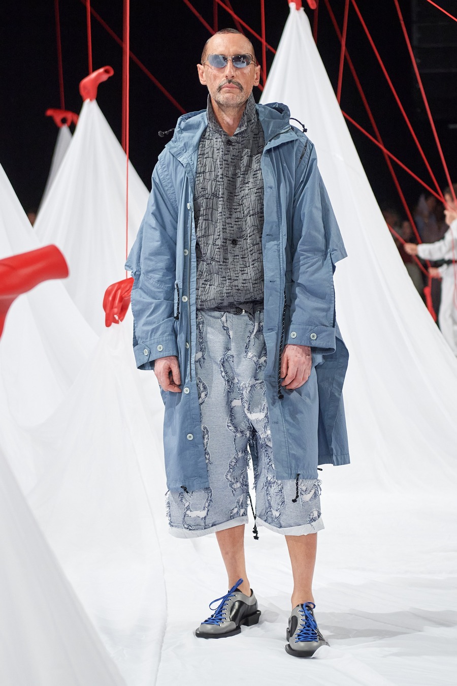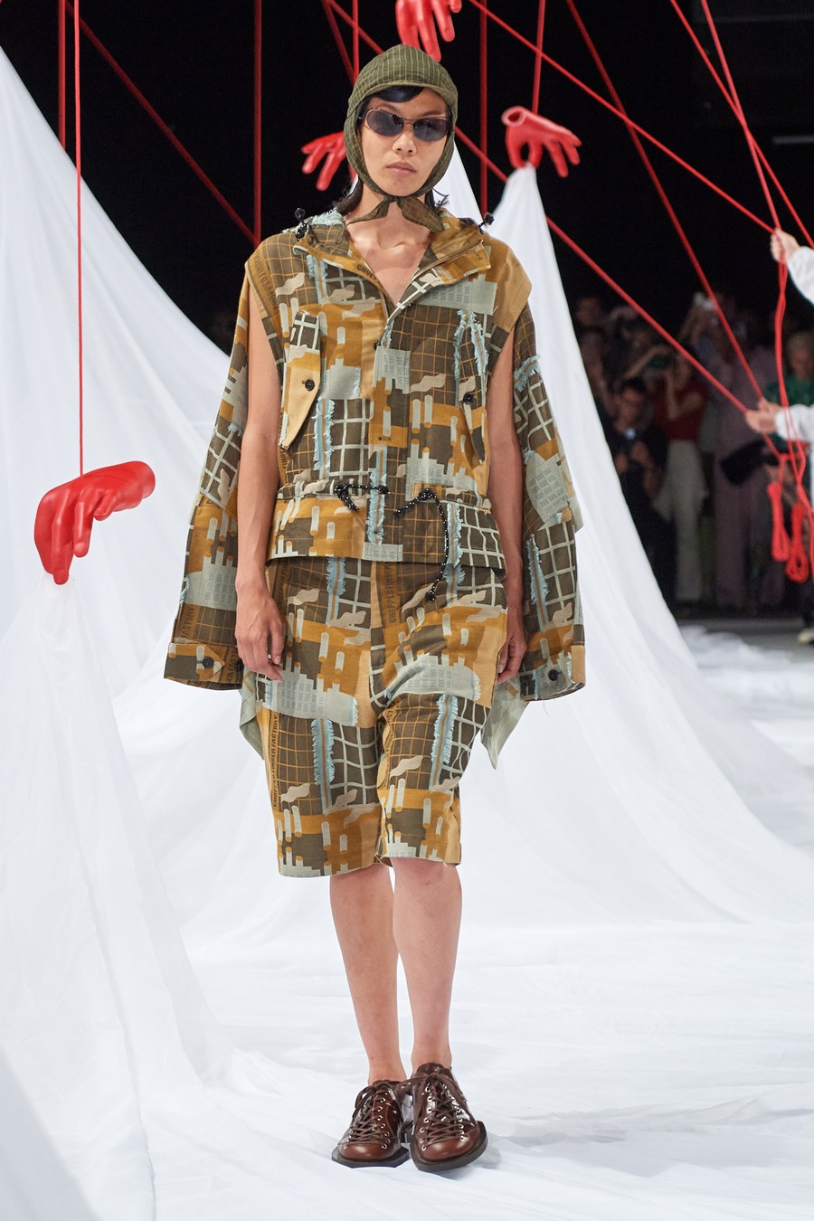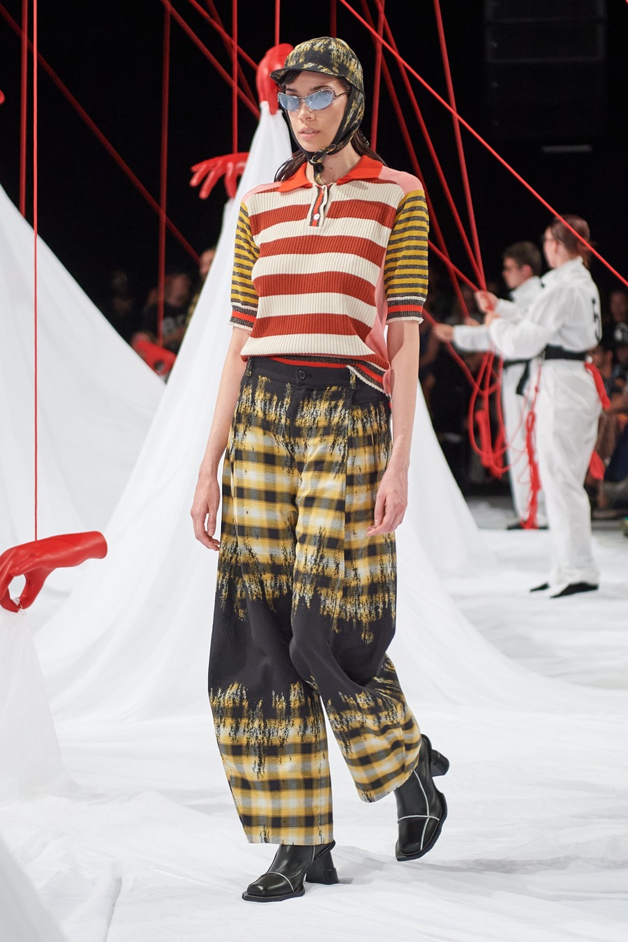 Amidst large red digitally-printed hands suspended from the ceiling alongside ropes and padded belts, white-suited assistants began manipulating these grand appendages as if they were marionettes, lifting drapery in undulating patterns that created a dreamlike atmosphere. This surreal dance emphasized a theme of fluidity—a motif Vibskov skillfully wove through the collection with curved cuts and dynamic patterns.
