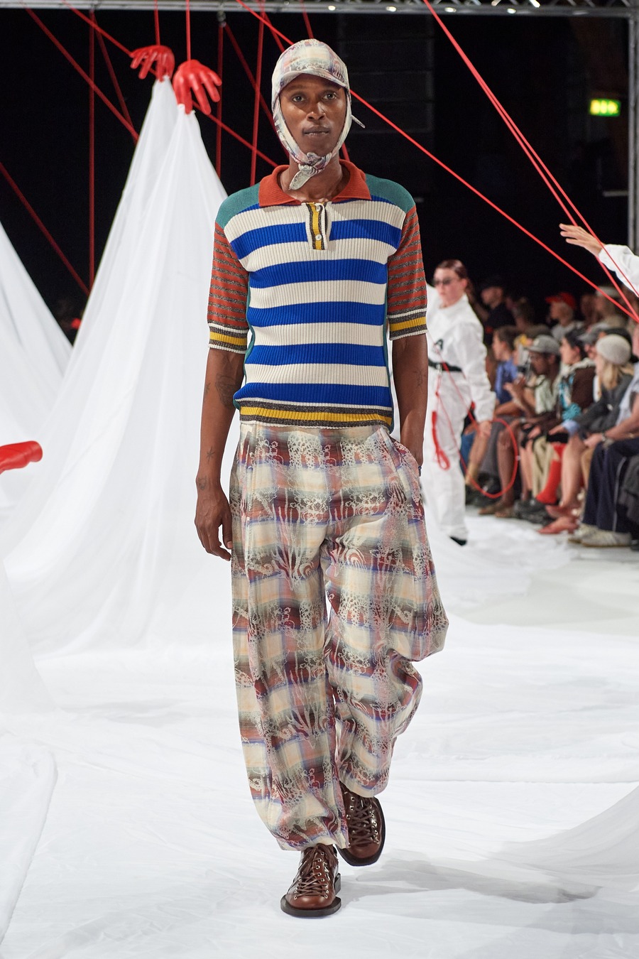 This season, Vibskov’s presentation was nothing short of a spectacle. Staged in a large, dark venue in Christiania, the collection, The Orchestra of the Soft Assistance, was more than a fashion show—it was an exhilarating performance. Vibskov, a true virtuoso of interdisciplinary artistry, showcased his music, theatre, and fashion talents.