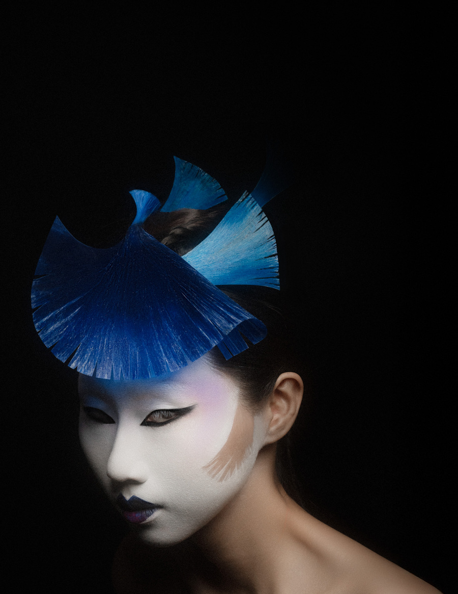 A KALTBLUT exclusive editorial inspired by the theatre Nô and traditional Japanese hairstyles, “We wanted to tell the tale of ancestral beauty techniques in a modern way.” Photography by Baylee. The model is Joelle Tzuyilyn. Art Direction, Make up and Nails by Emma Hoareau. Hair by James Fang and Jae Yt. Set Design by Lee Nien Tsz.