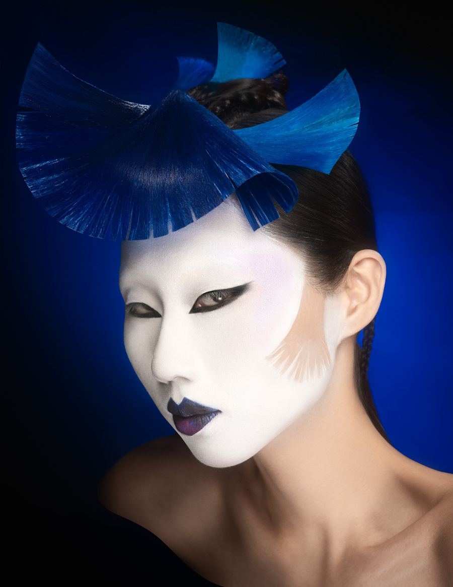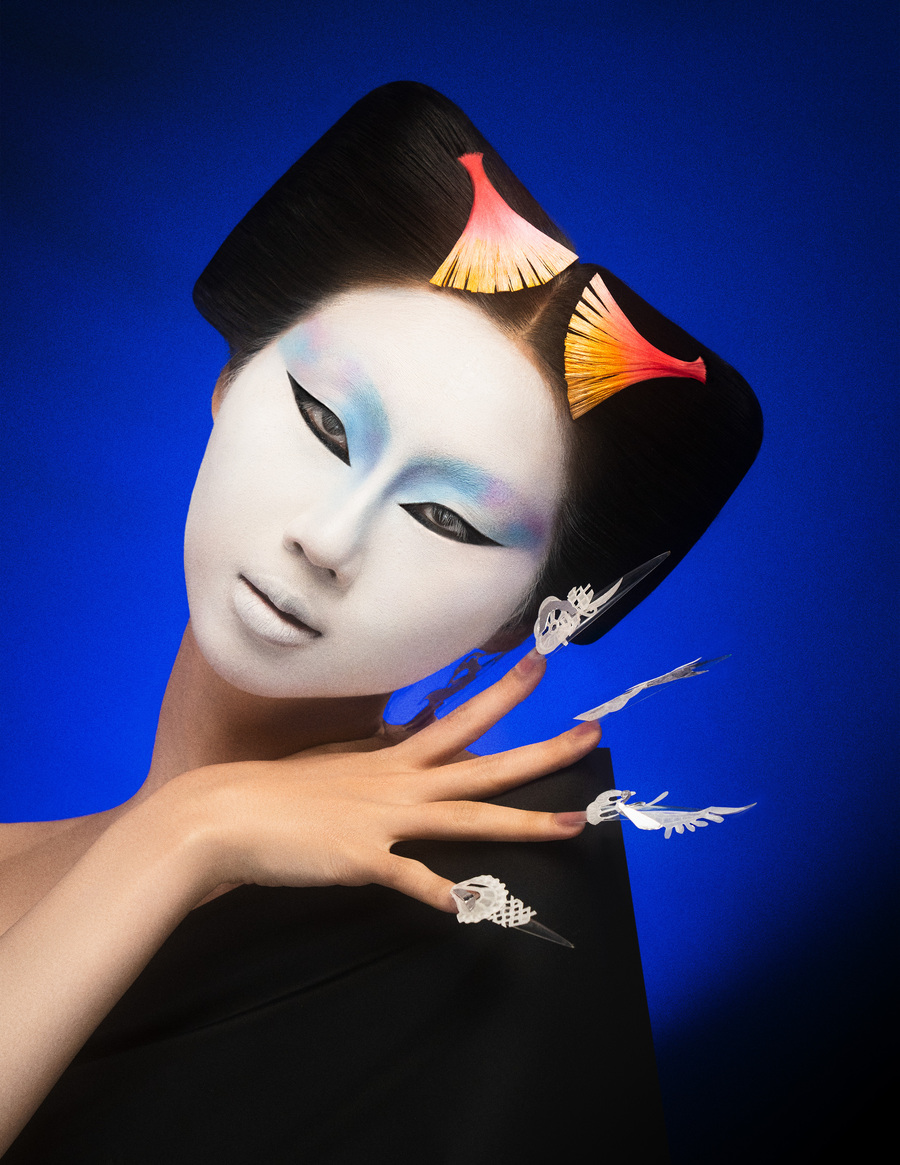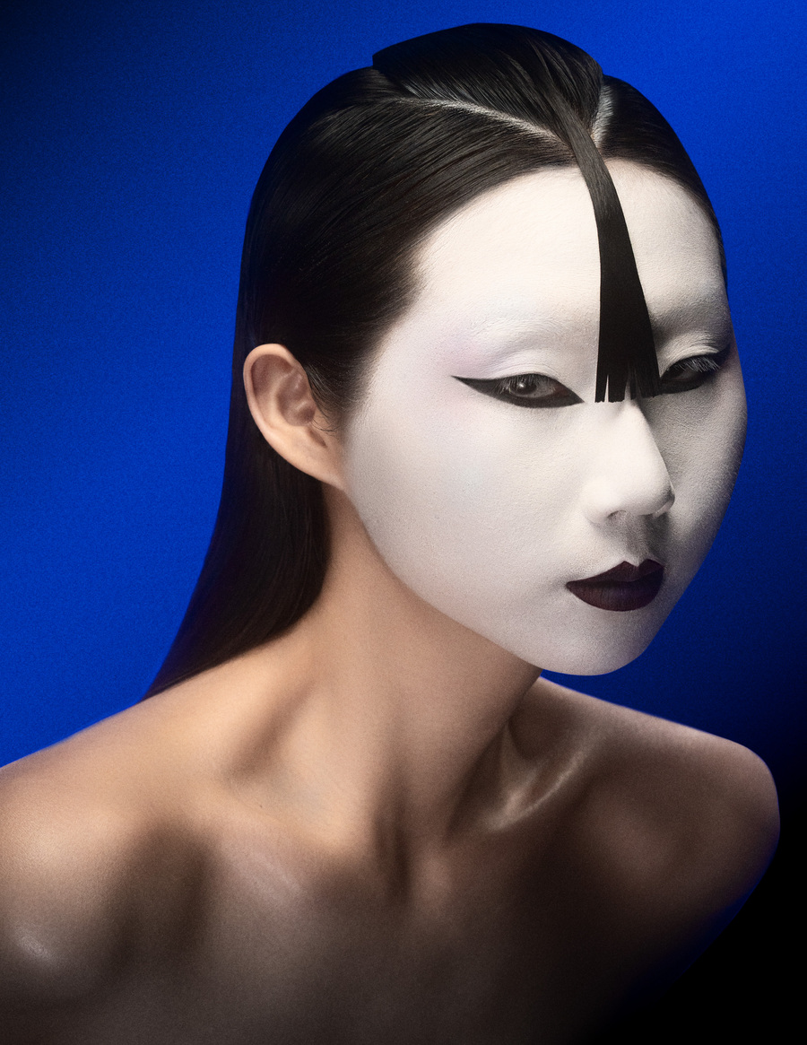 A KALTBLUT exclusive editorial inspired by the theatre Nô and traditional Japanese hairstyles, “We wanted to tell the tale of ancestral beauty techniques in a modern way.” Photography by Baylee. The model is Joelle Tzuyilyn. Art Direction, Make up and Nails by Emma Hoareau. Hair by James Fang and Jae Yt. Set Design by Lee Nien Tsz.