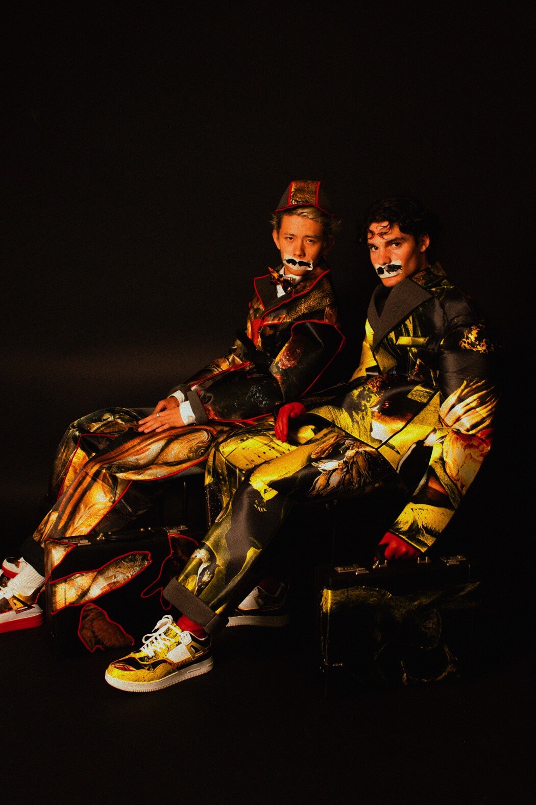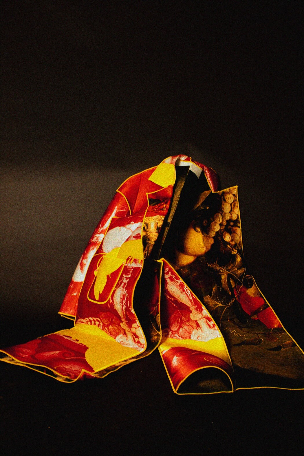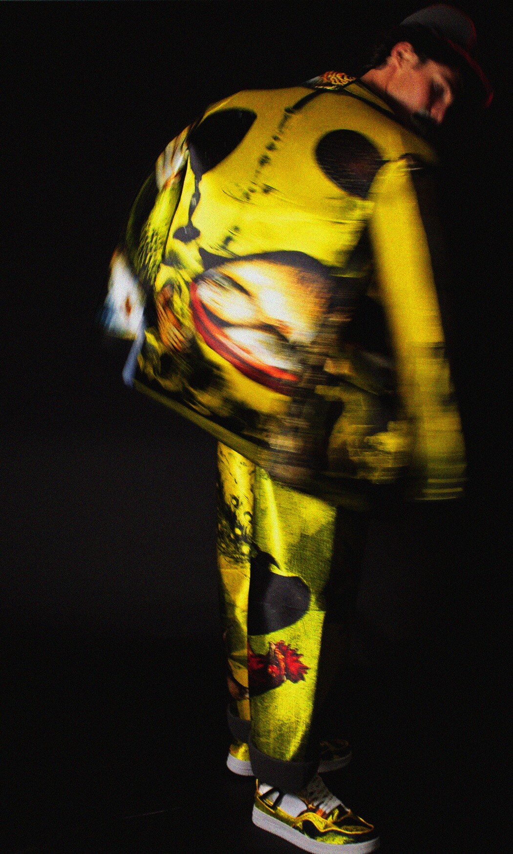 The love for construction is what mostly informed the whole work, where classical menswear finds new tailoring features in foam suits layered with flemish still life prints from XVII century. Foam garments become both a protection and an obstacle to the movement, while still-lifes, reworked in vivid unnatural colours, remind our belonging to the “herd” and our common fate.