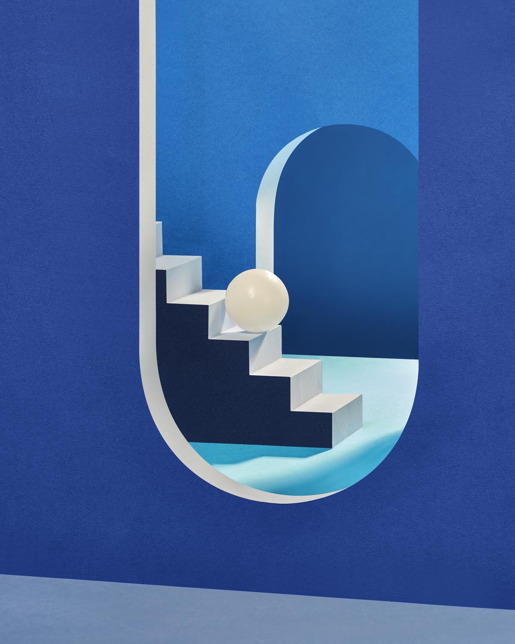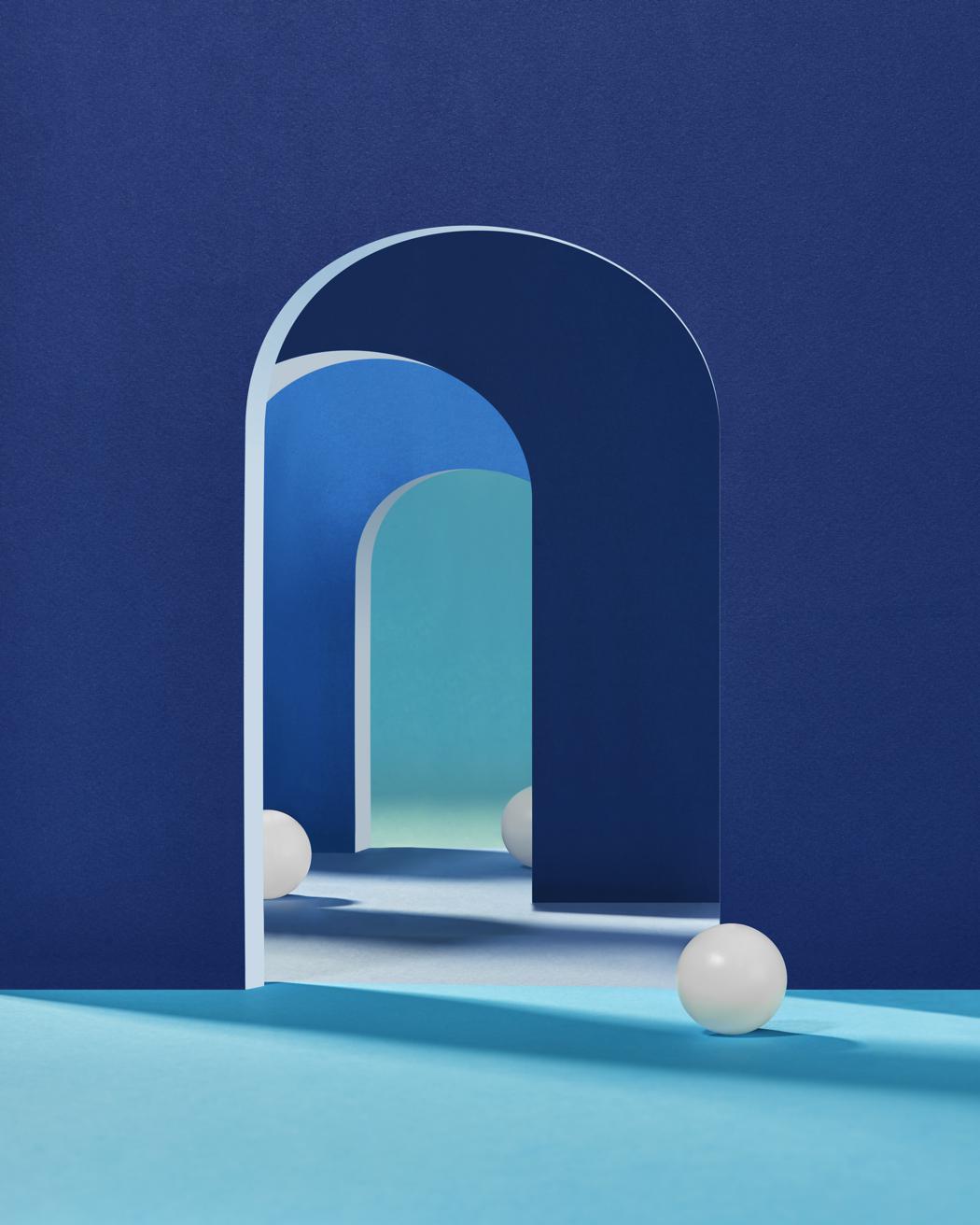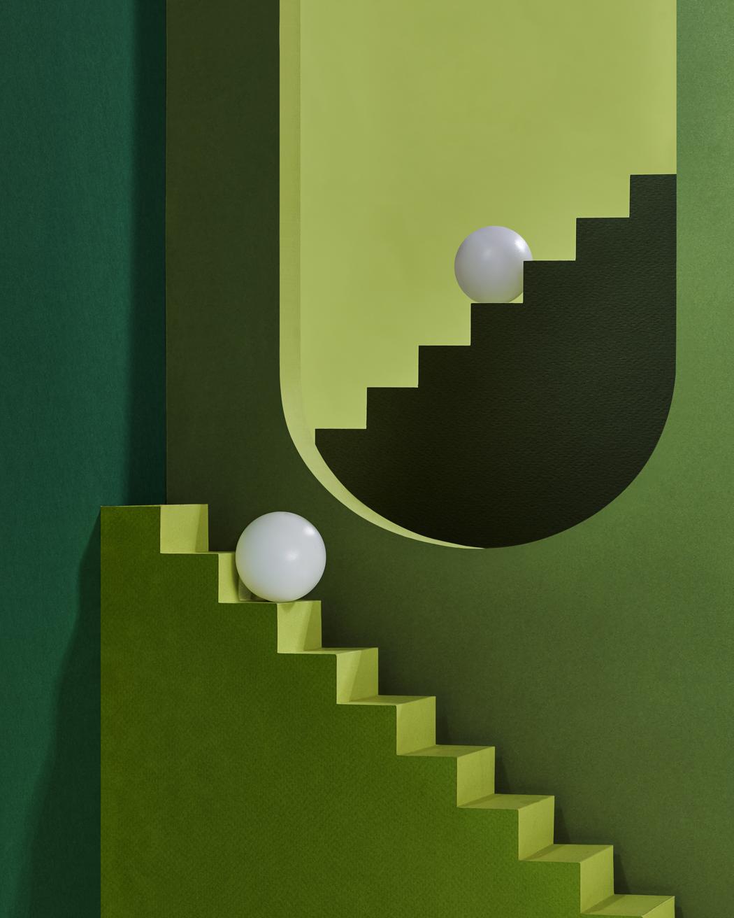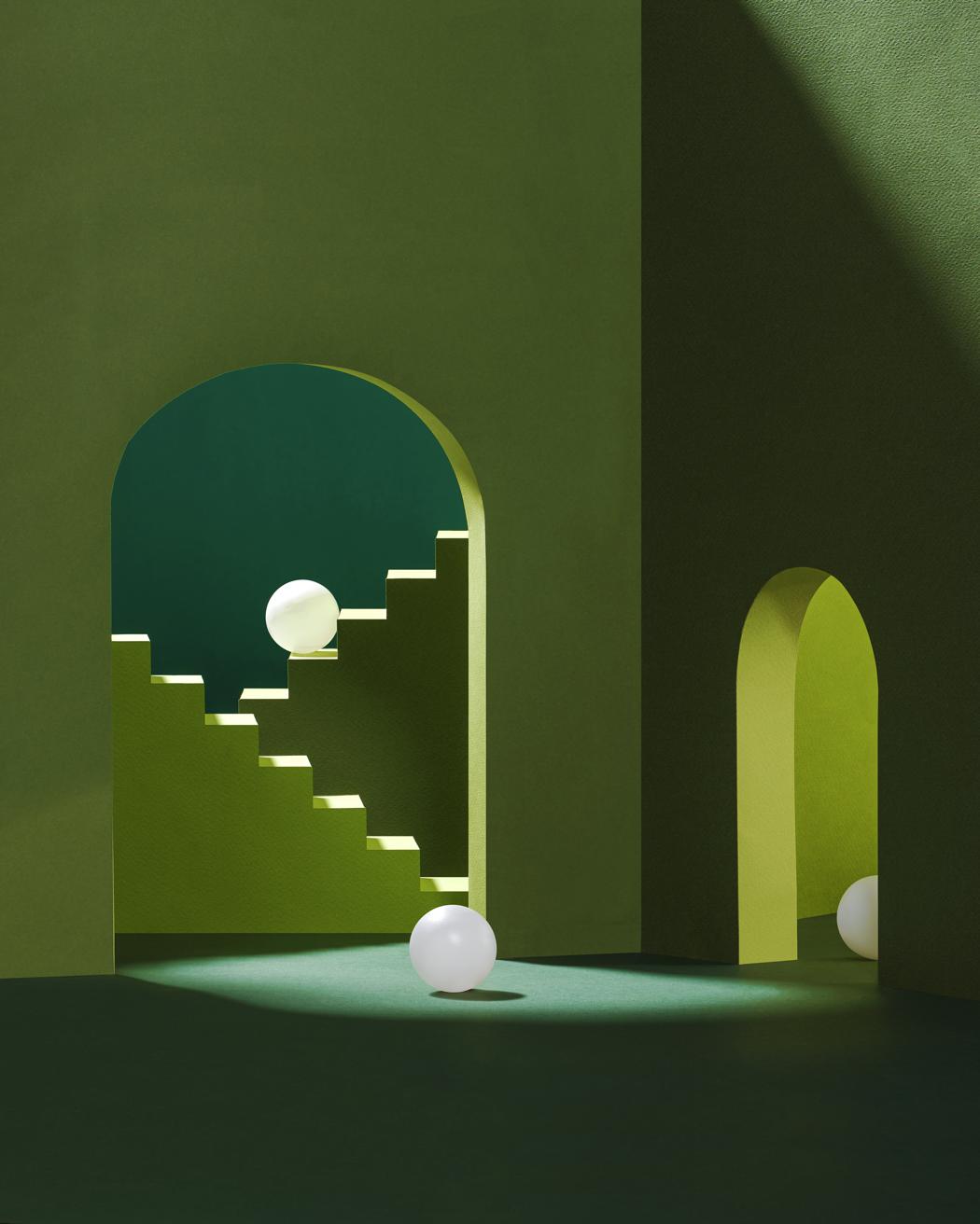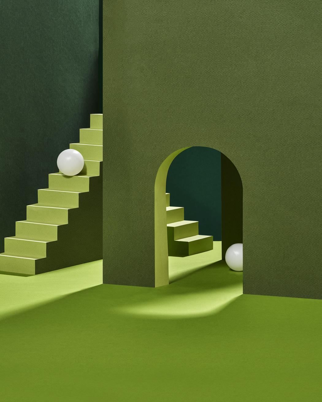 The paper sets play with light & shadow, adding depth and creating interesting contrasts of color on the floor, walls, and corners of the room. Small white balls playfully interact with the architecture and seem to be playing hide and seek behind arches, on top of staircases and in the alcoves of meandering corridors. Dive in and explore!”