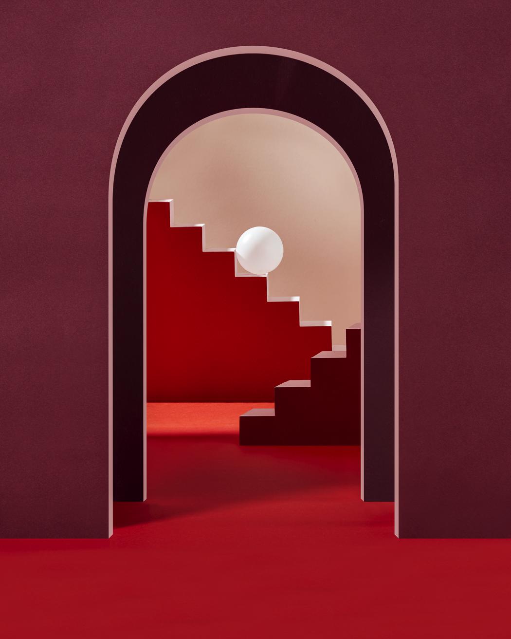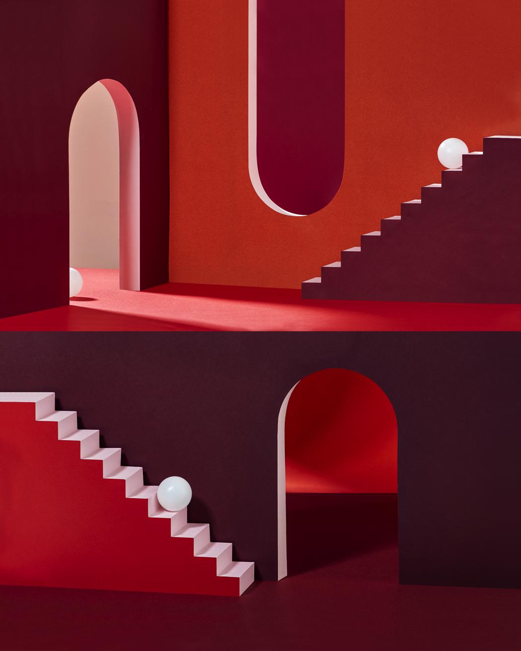 “Taking influences from M.C. Escher & Ricardo Bofill, with hints to 3D rendered images and a nod to old fashioned children’s wooden toy blocks, “Hide and Seek” invites you to dive in and explore a range of bold and colorful rooms. The warm, open spaces are made in a monochrome palette, each representing one of the three primary colors of light: Red, Green & Blue.