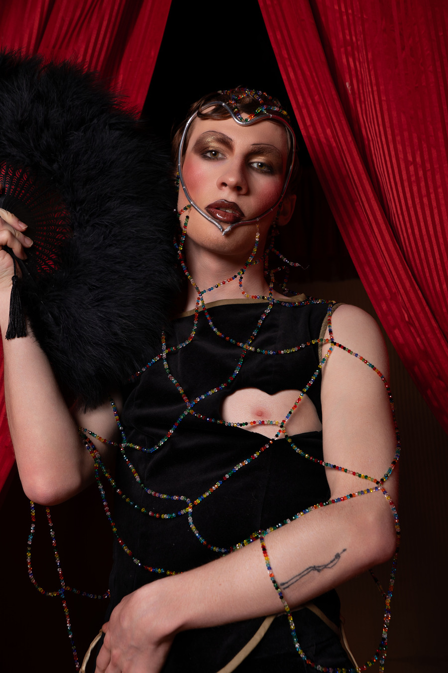 With the photoshoot for my collection, my dedicated photographer Caroline Gerst and I, along with our entire amazing team worked together to depict the story of a soldier going to a drag bar before returning to war. In my mind, he has been home for a few days, and the end of the war is approaching. He heard from a friend about a bar which not only is secretly open at war times but is open for queer people to express themselves within the walls of the bar. On his last evening before returning to the battlefield, he packs more extravagant clothing which he later combines with his soldier’s uniform and heads off to explore this place. He feels the end of the war is approaching but he knows these last battles won’t be easy, so he wants to let loose one last time. After watching all the interesting characters in the bar for a while, he sits down and reads a card from an old friend. That’s when he sees the drag king. They immediately lock eyes and walk towards one another. They spend an evening in companionship. Both of them feel the chemistry but other than some flirting, neither of them acts on the attraction. At the end of the night, they exchange goodbyes instead of contact information. Neither of them knows whether the other one is going to survive the next months but in this moment, they are infinite.