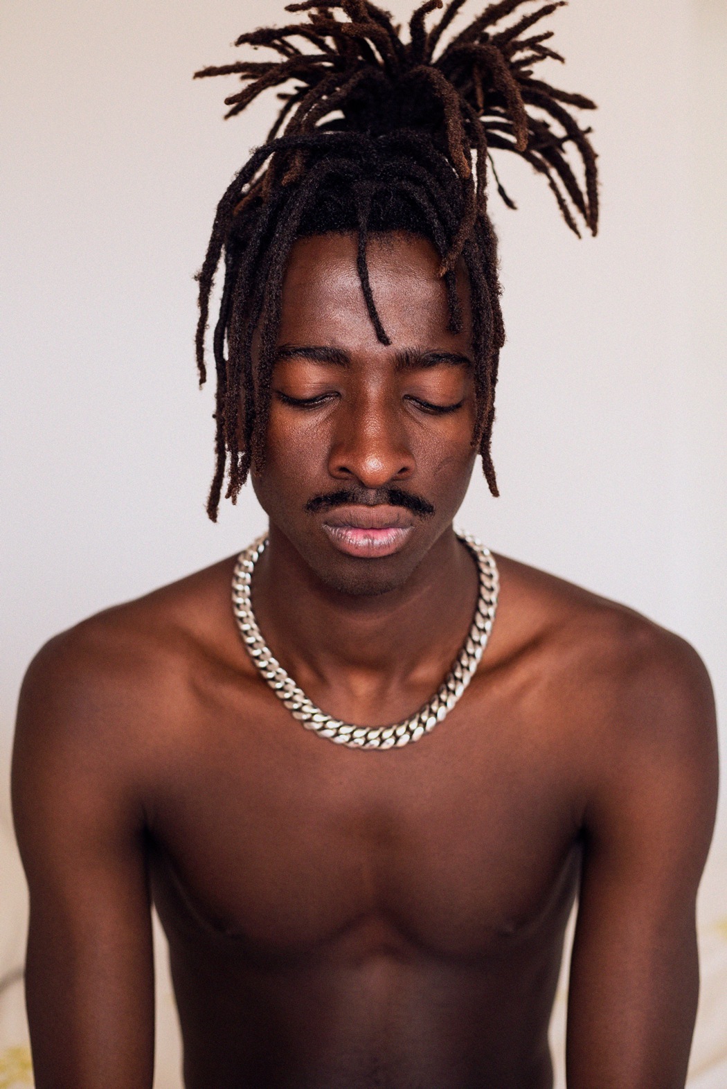A KALTBLUT exclusive menswear editorial. Photography by Ramiro Valdez. Model is Soribah Ceesay signed at Fifth Models. Styling by Marina Pujol using fashion from Alexander Wang, Calvin Klein and Nala by Nala Desi.