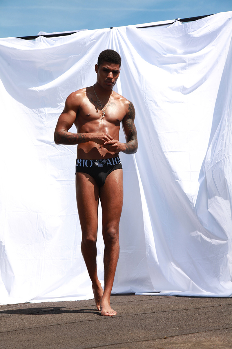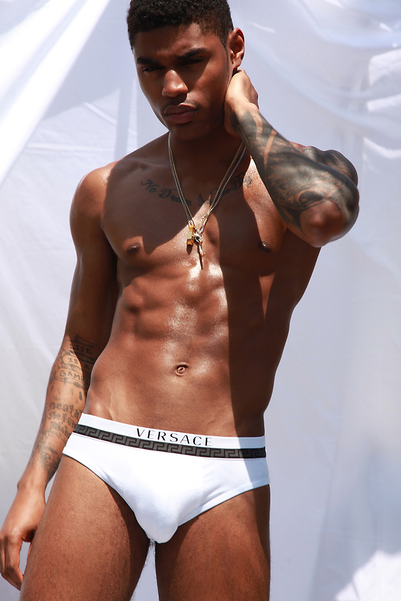 A KALTBLUT exclusive men underwear editorial. Photographer Karl Slater captured Karon Alik Byers, signed at First Models for us. Styled by Kennedy Silver using D.Hedral, Modus Vivendi, Emporio Armani, Addicted and Versace. Grooming by Carlie Siroko using Kiehl’s and Living Proof products.
