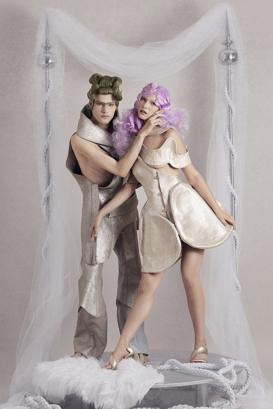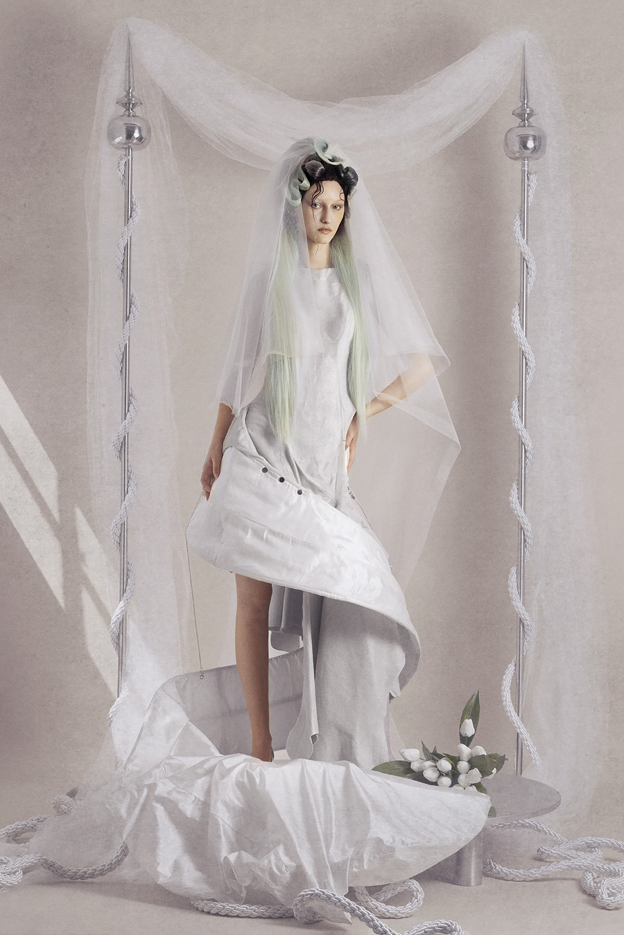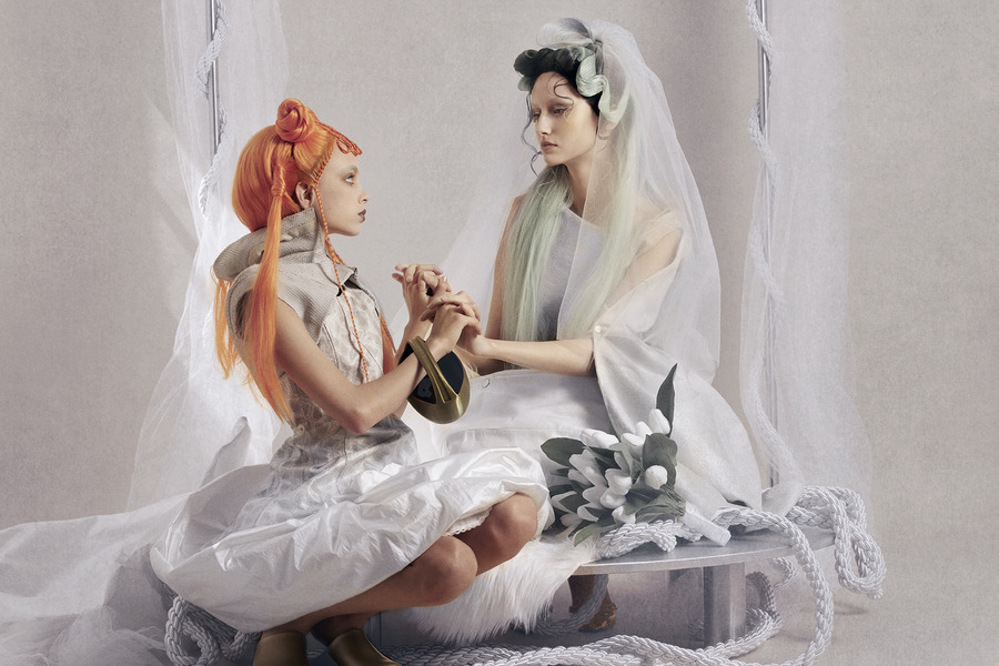 By incorporating innovative materials such as water-molded leather and industrial, military-inspired textiles, the sculptural silhouettes shape the body while reflecting the tension between individuality and ceremonial attire. The editorial encapsulates themes of love, collapse, and hyper-capitalist culture, questioning why wedding culture thrives in times of crisis.”