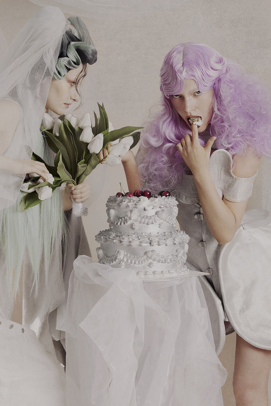 This vision was brought to life through collaboration with a talented creative team, including a custom wig designer, a wedding cake artist, and photographer Adi Admoni. Admoni’s monochromatic editing style emphasizes emotional detachment while enhancing the polished glamour of the wedding world, reinforcing the collection’s thought-provoking and subversive aesthetic.”