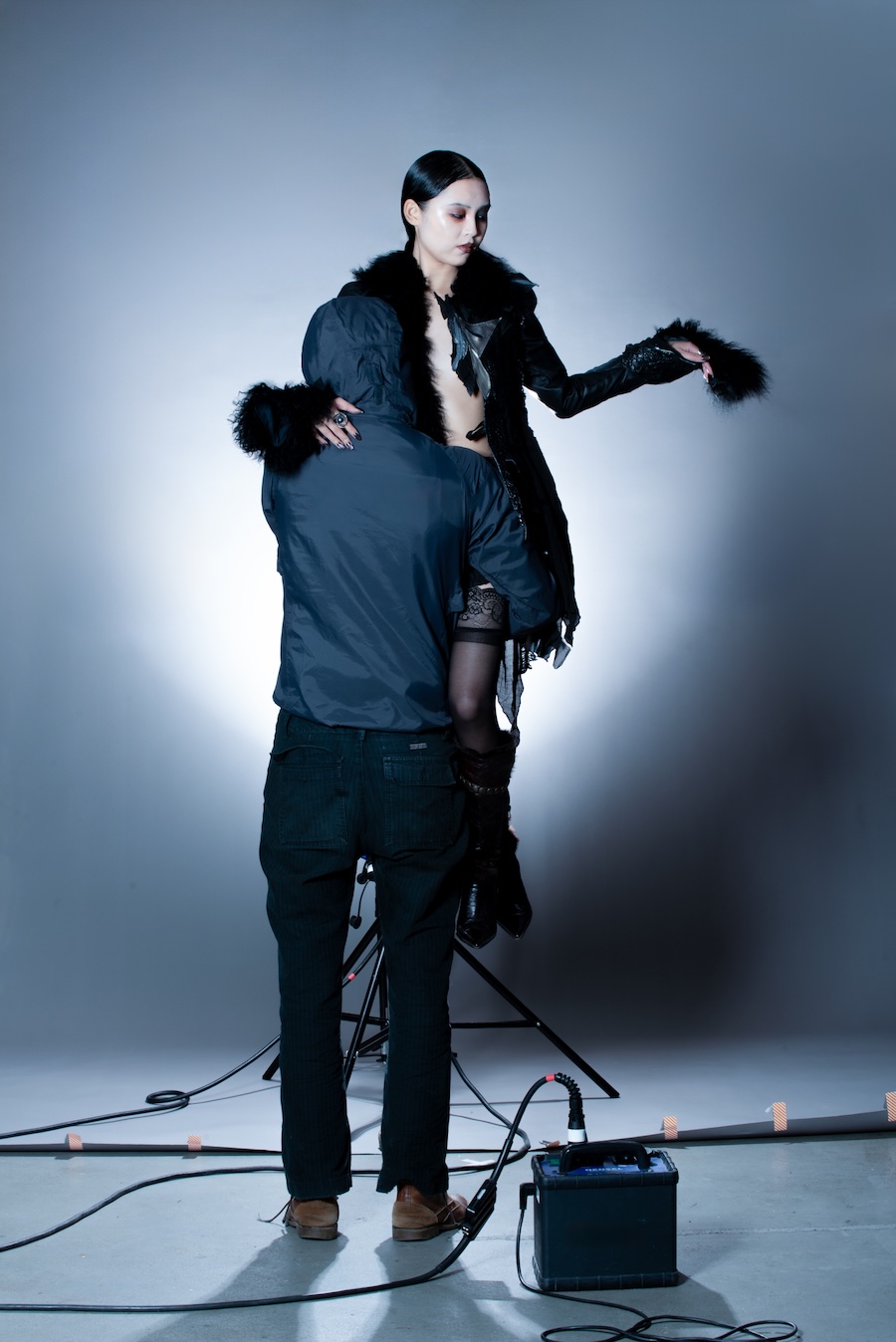 A KALTBLUT exclusive. The model is Lulu. Photography and creative direction by Elena Sohmen. Make up and hair by Hugo Trix. Photo assistants are Carl Raabe and Kaiche Li. The fashion brand used is H.W. ewigewiederkunf. “This series proposes a play of mirrors between intimacy and technical construction, where personal narrative intertwines with the visible scaffolding of the photographic image. The model occupies the centre of the scene, yet her relationship with the photo assistant introduces an unexpected tension: a romance that shifts the focus and subverts the traditional hierarchy between protagonist and crew.”