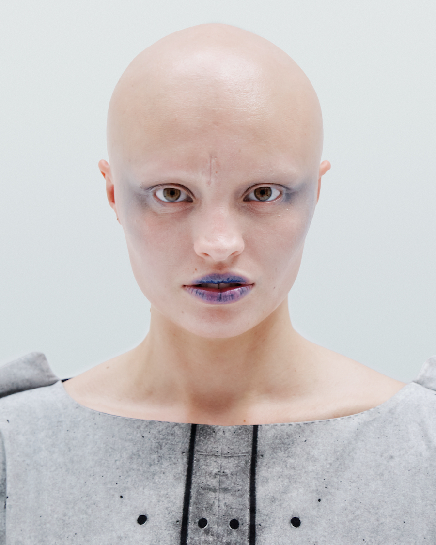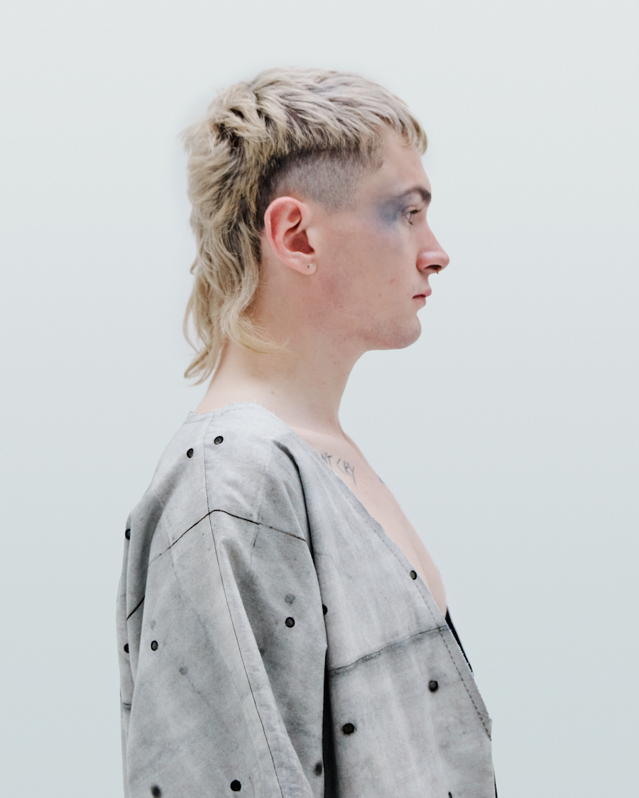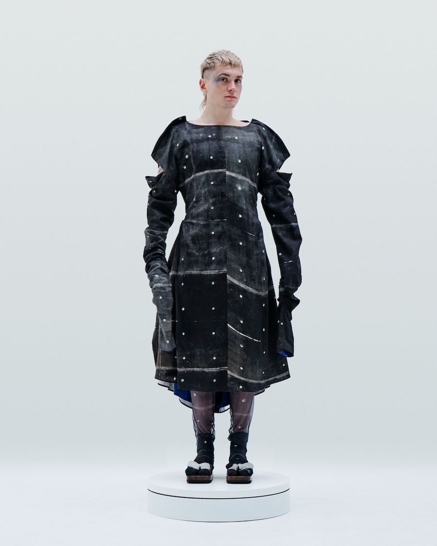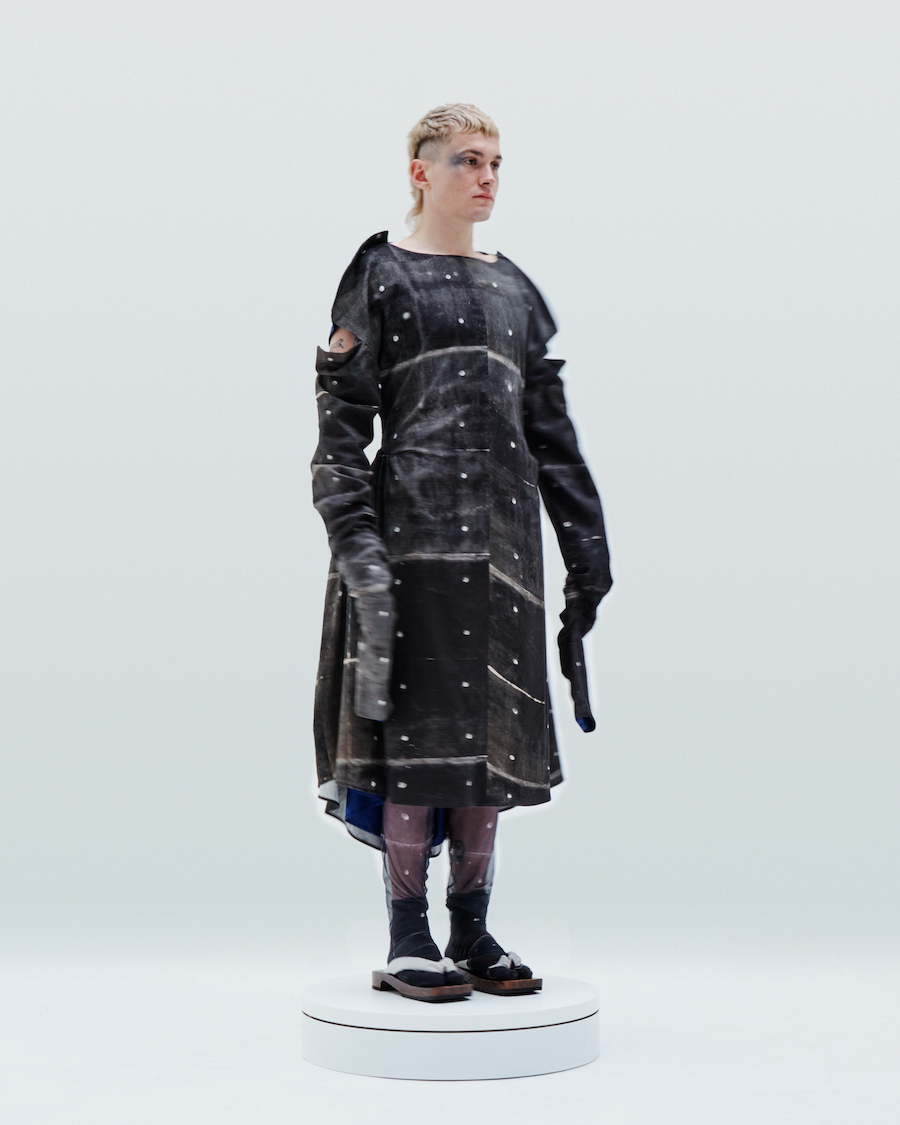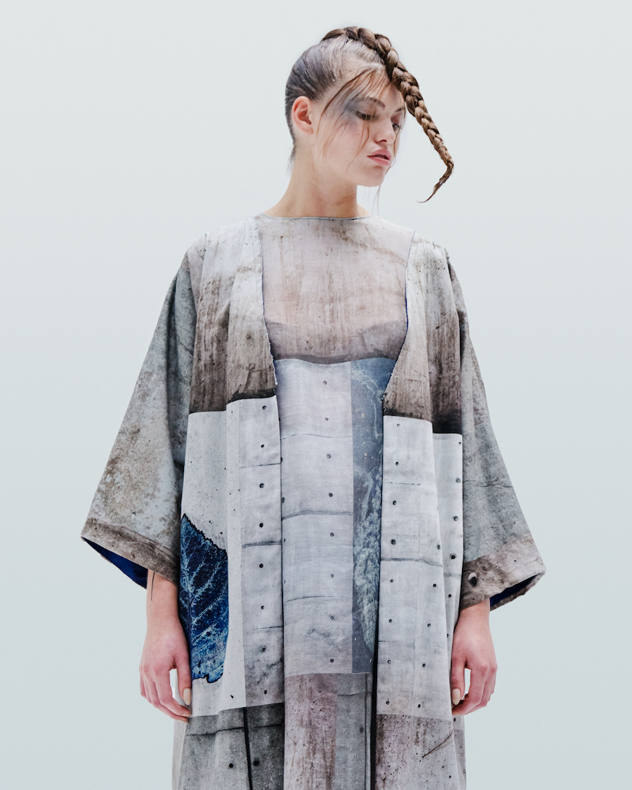 IA London’s founder and self-taught designer Ira Iceberg applies this idea to garments’ making and creates (almost) weightless “Concrete” by printing concrete reinforced wall’s texture on fabrics. Constructing the garments from this “Concrete” fabric, Ira follows clean geometric lines. Deep cuts on the “Concrete” surface of some of the garments are there to create contrasts of light and darkness.