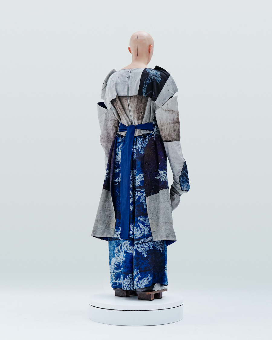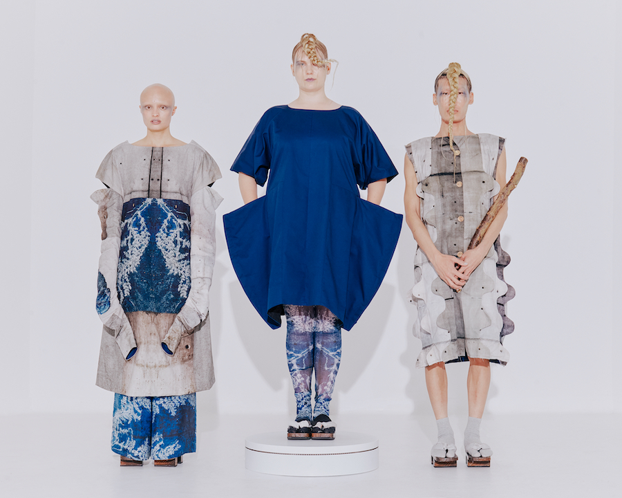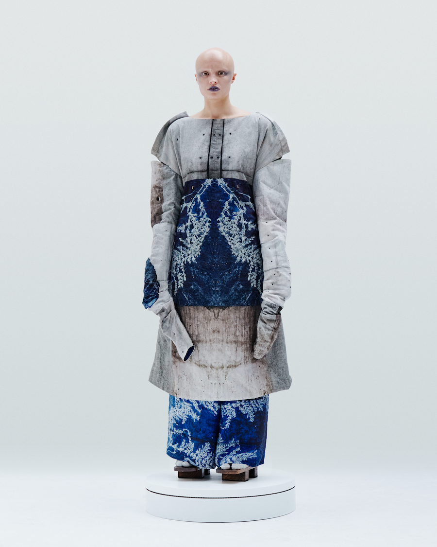 Blue Fossil and Wild Rice print (created by glueing rice flakes one by one on a fabric surface to make an initial pattern) complete the collection, bringing a sense of connection with nature.