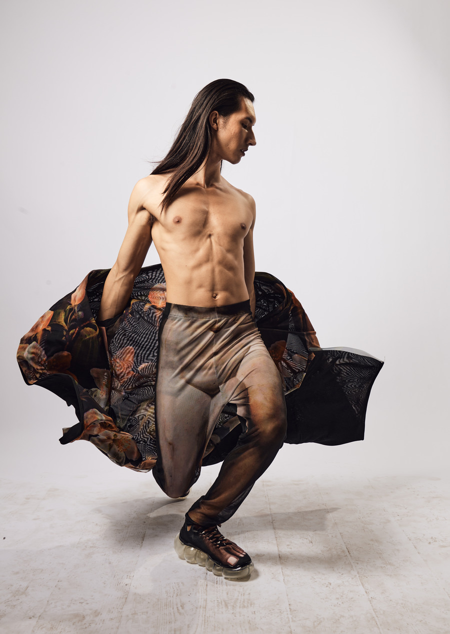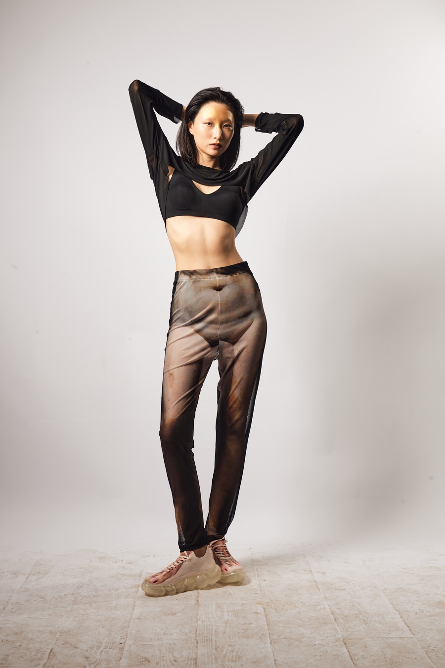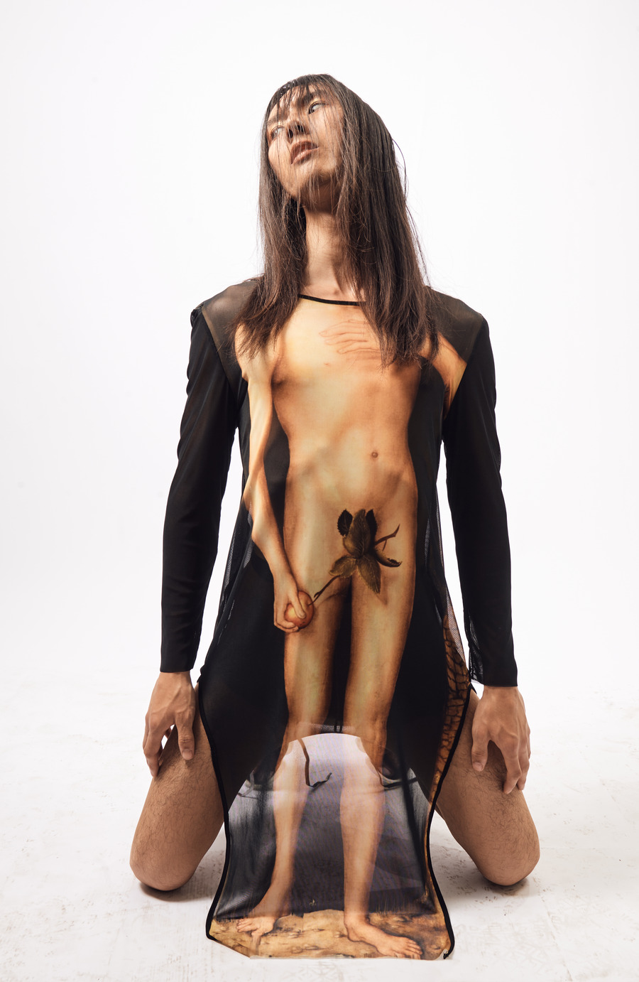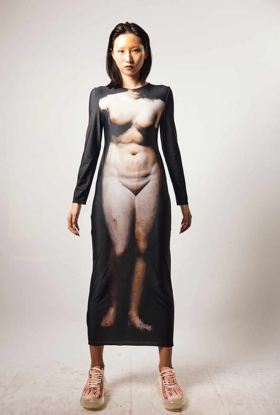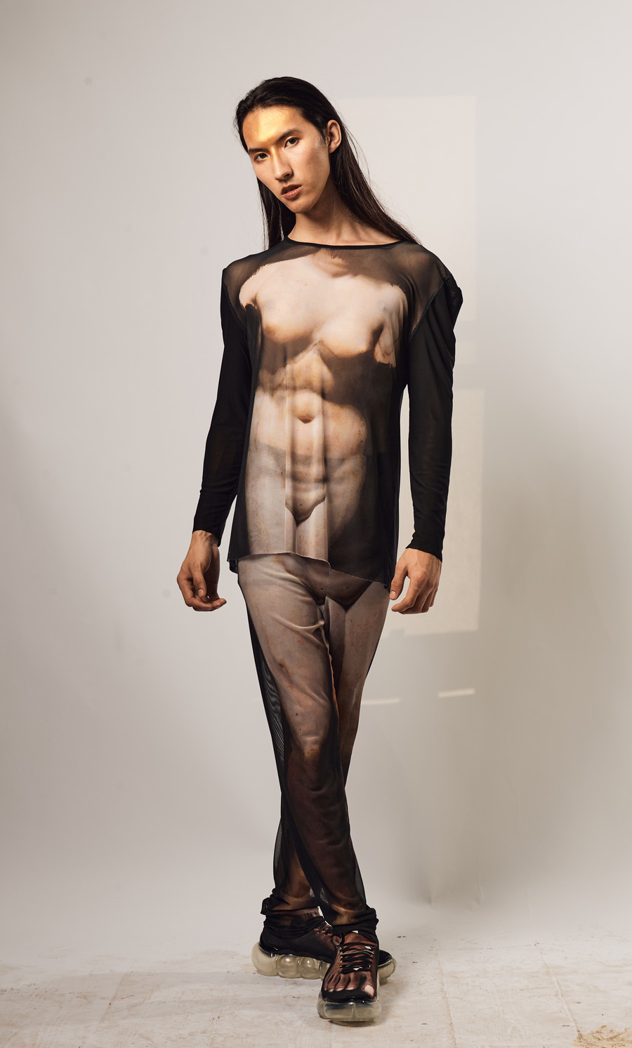 The collection proposes newness via bodycon dresses, tops and leggings printed on soft semi-transparent Italian mesh and printed with images of artistic nudity, male and female, and full-body harnesses. Almost all garments are “played” on male and female models, inviting openness toward traditional gender roles. In line with IA London’s ideology of timeless and responsible fashion, the new collection shows just enough to deliver its new artistic vision for this season.