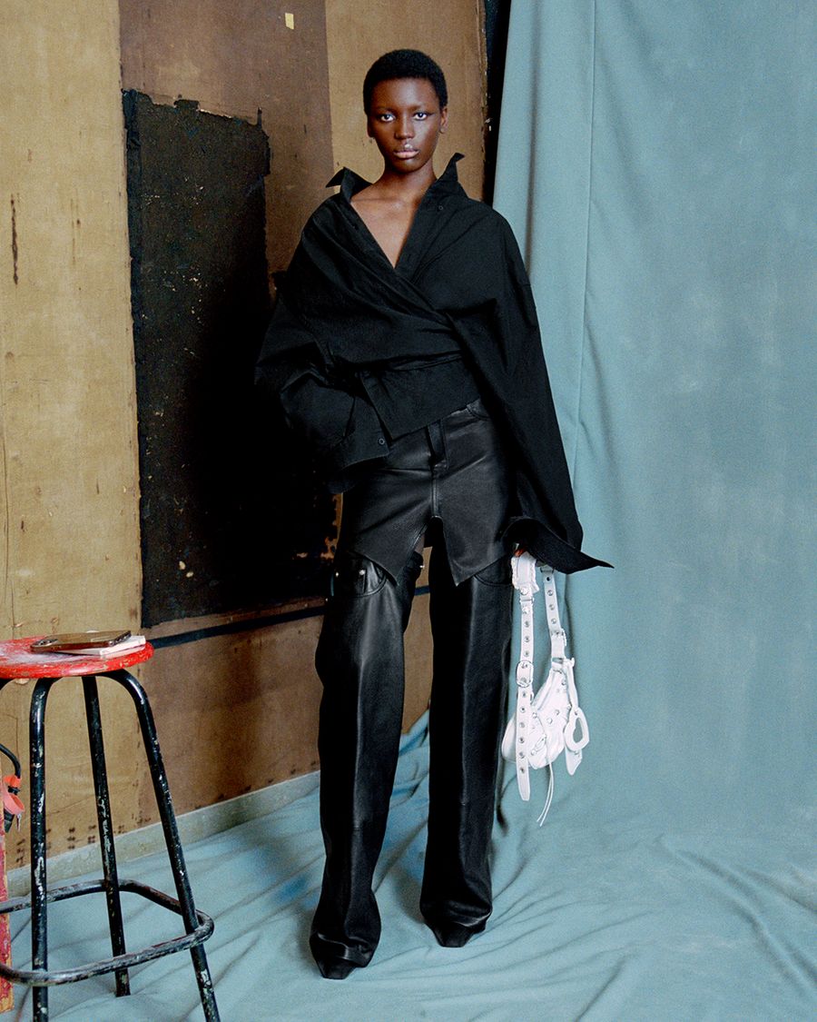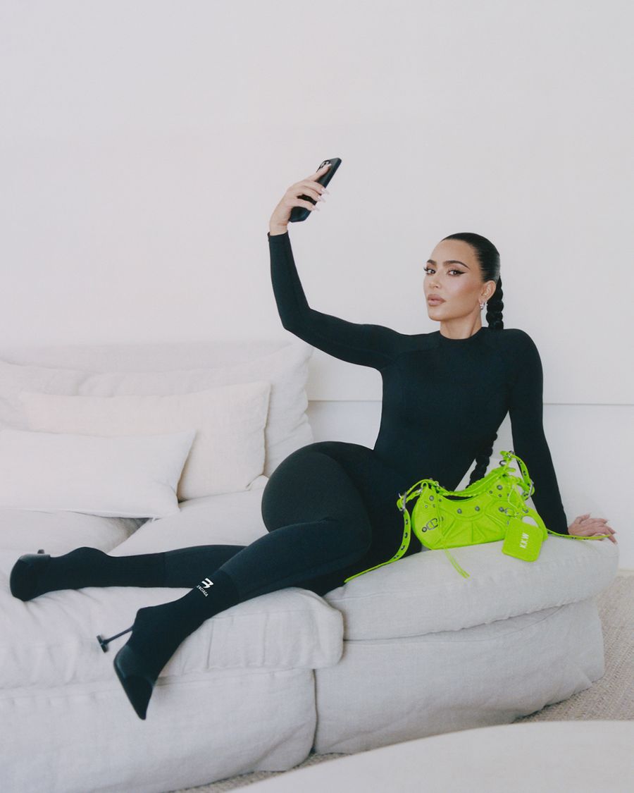 All are dressed in ready-to-wear and accessories that represent Balenciaga’s signature silhouettes and pieces, which include iconic Hourglass bag styles, Le Cagole bags and boots; Triple S, Track, and Defender sneakers; Pantaleggings and the Falkon Bodysuit; Twisted and Hourglass tailoring; Cut earrings; and casual separates like oversized T-shirts and fitted hoodies. New classics include Bistro, Lady, and Jumbo Tote bags; stretch knee pants; and Bat, Stretch, and Wrap sunglasses.