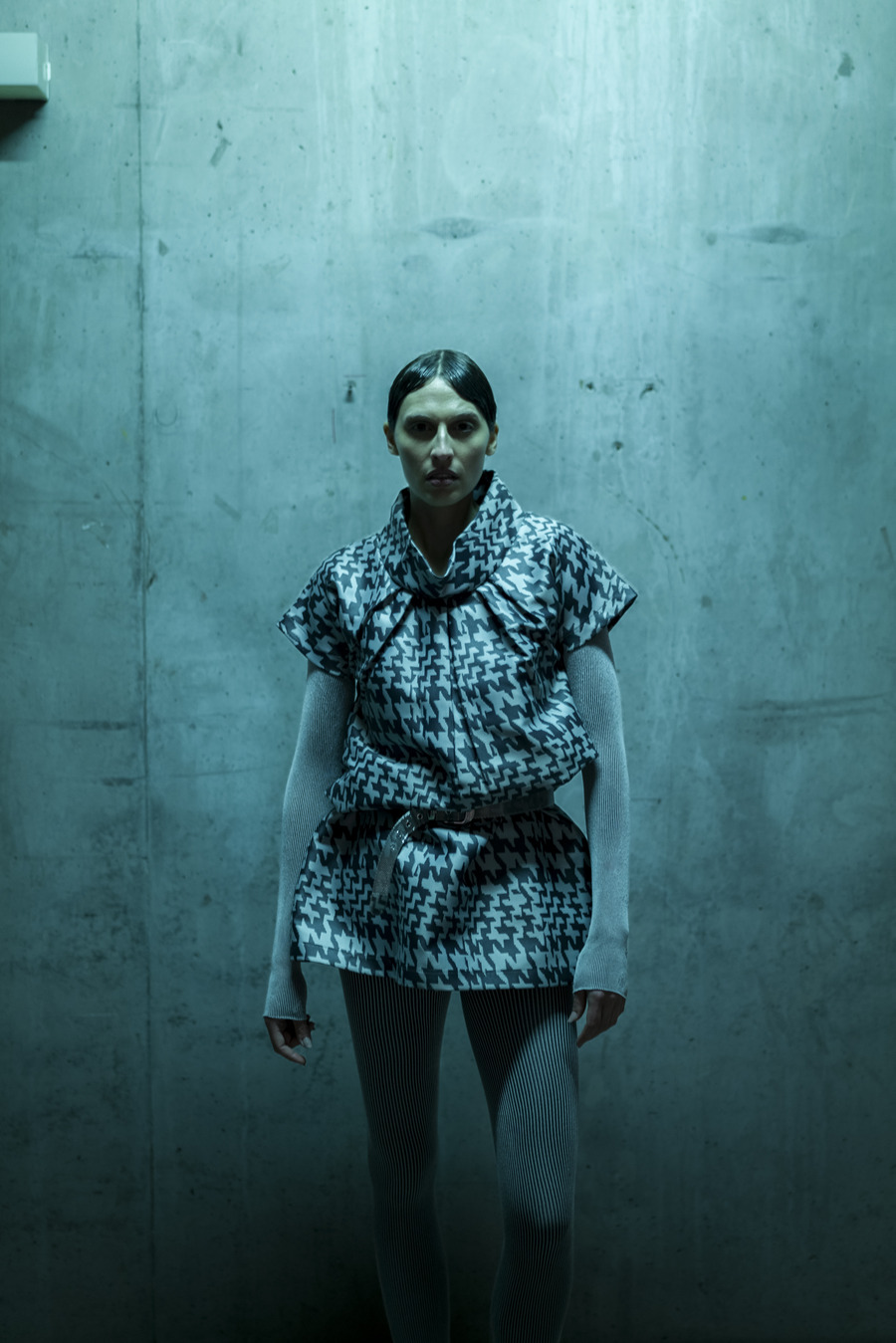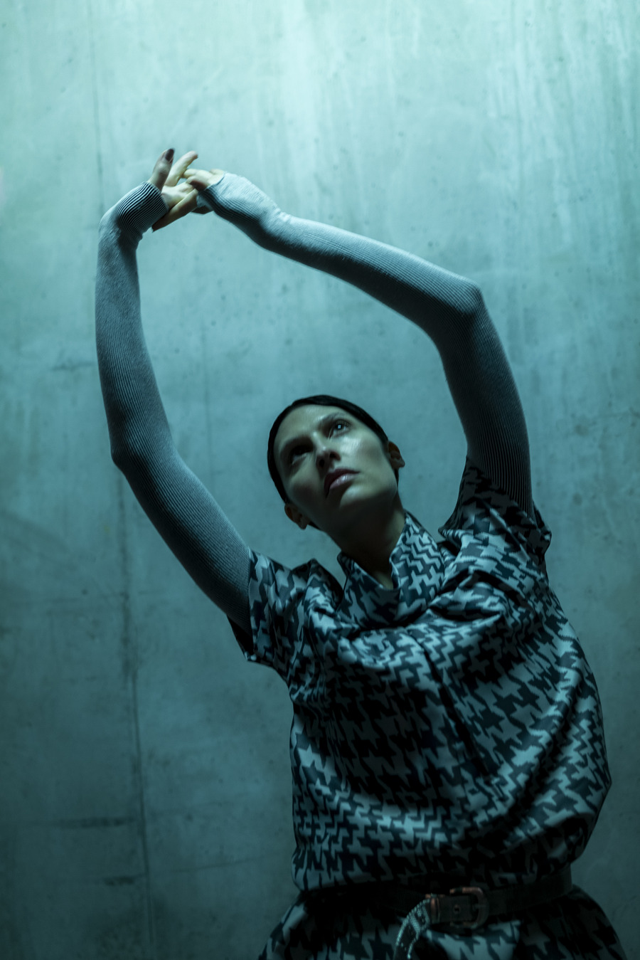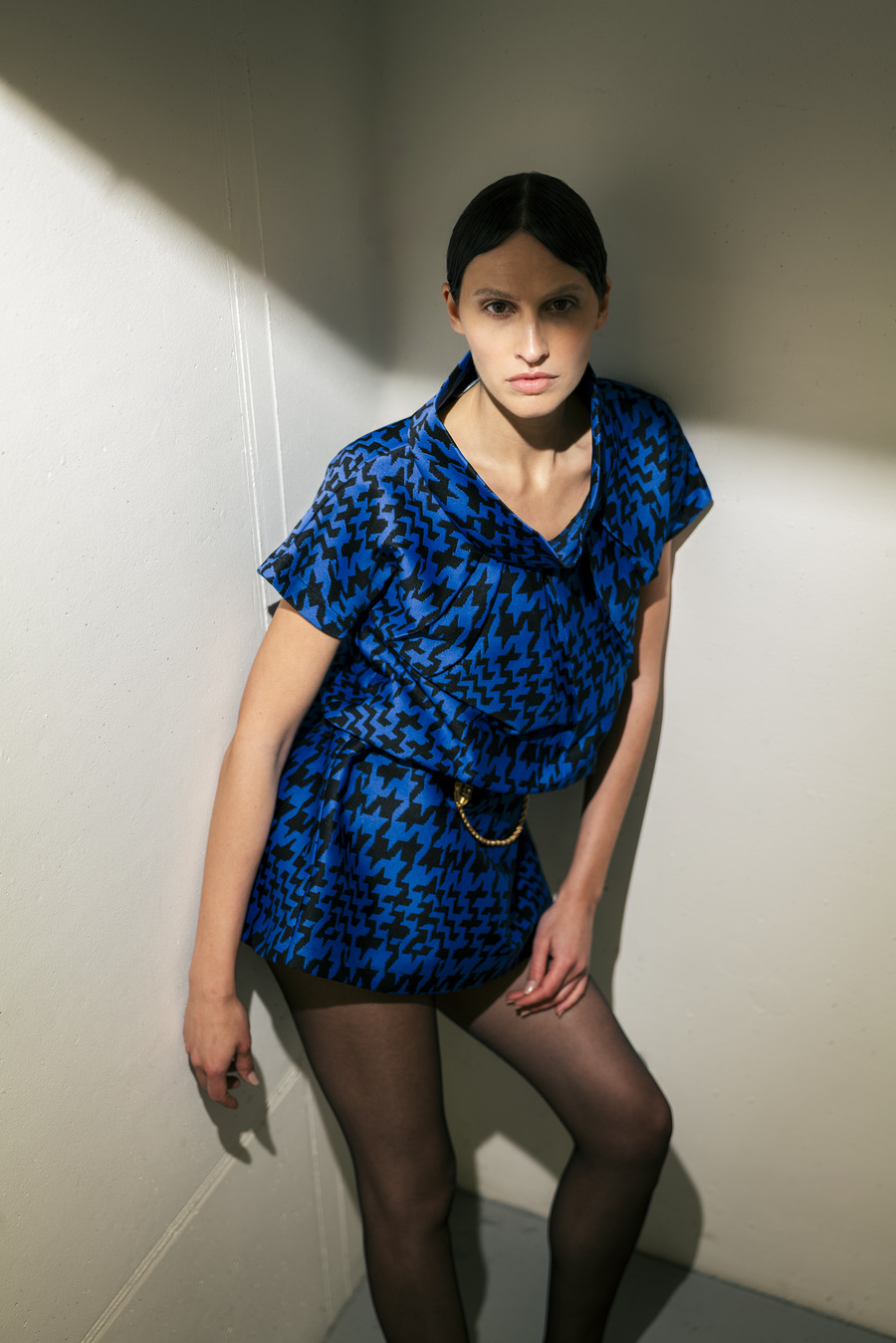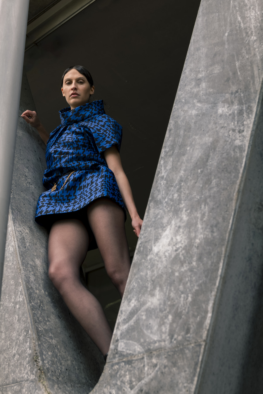 A KALTBLUT exclusive editorial. Photography by Ken Kodak. The model is Julie Balzeau. Make-up & Hair by Nina Gossling. Director of Photography by Jan Schünke. Styling by Vera Witthaut. Illusion Effect is all about houndstooth prints, bold colours, and structured silhouettes – acts like a second skin. Vera Witthaut worked with dresses by Iranian designer Bahar Fazeli.
