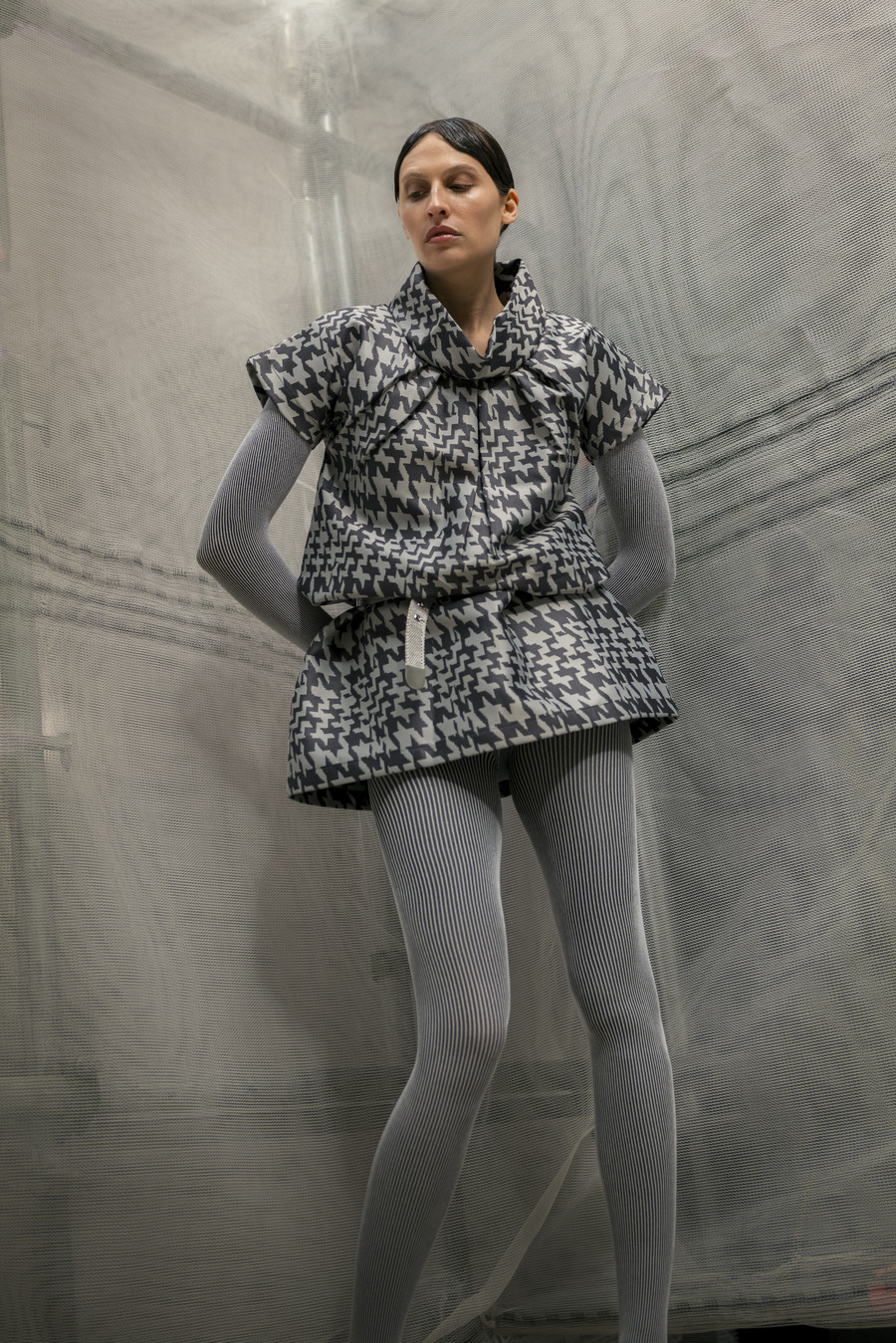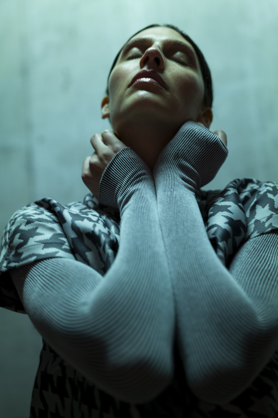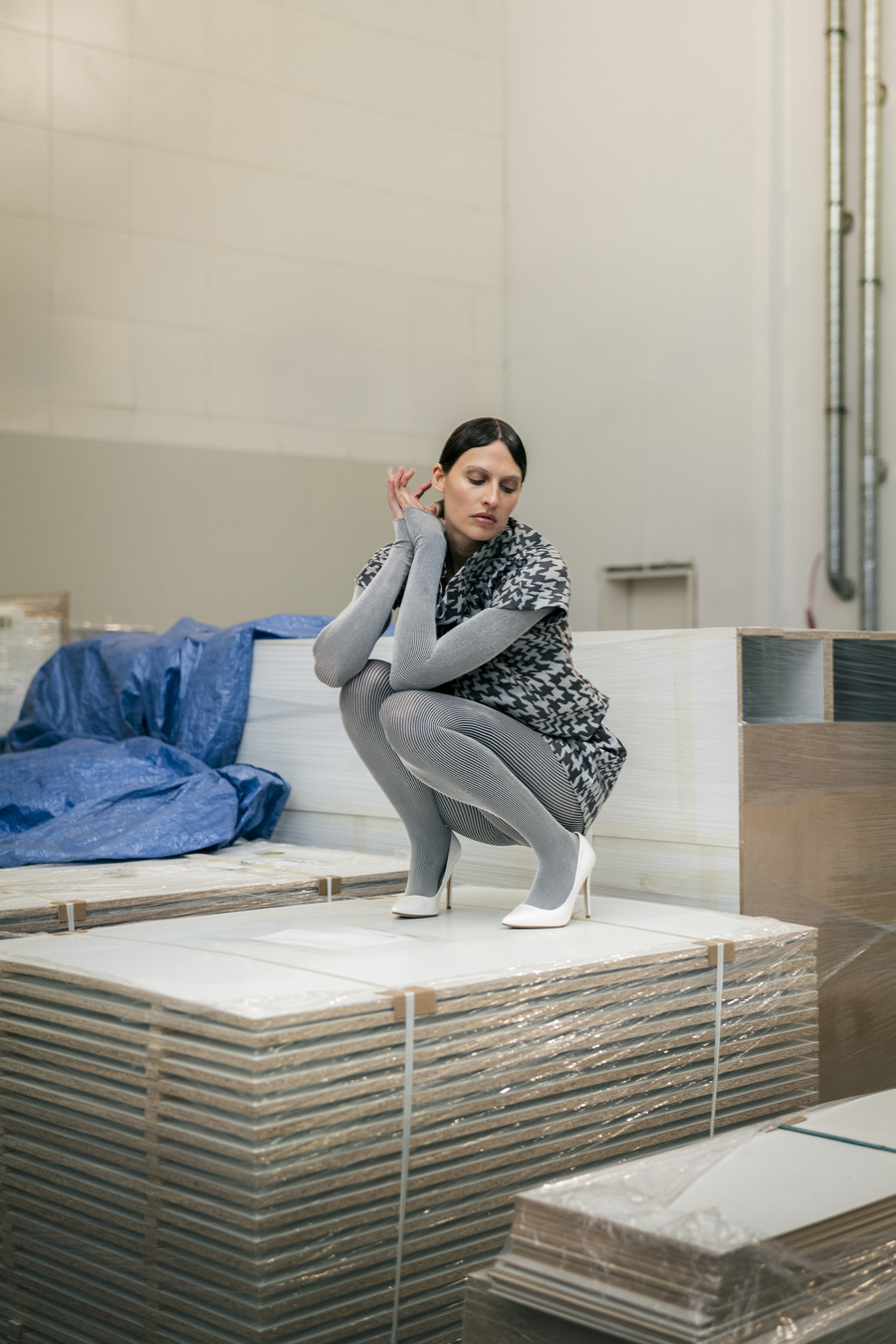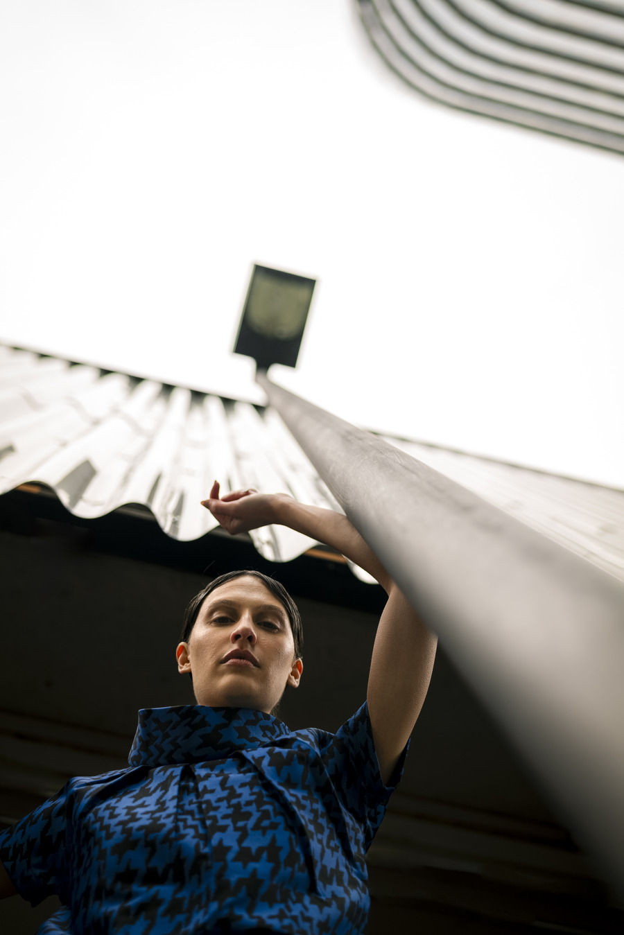 A KALTBLUT exclusive editorial. Photography by Ken Kodak. The model is Julie Balzeau. Make-up & Hair by Nina Gossling. Director of Photography by Jan Schünke. Styling by Vera Witthaut. Illusion Effect is all about houndstooth prints, bold colours, and structured silhouettes – acts like a second skin. Vera Witthaut worked with dresses by Iranian designer Bahar Fazeli.