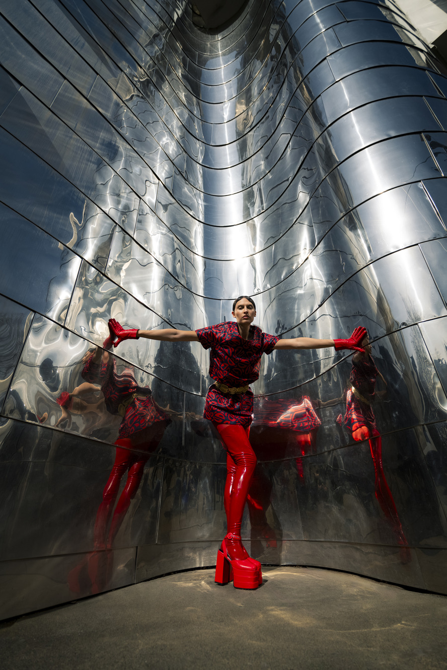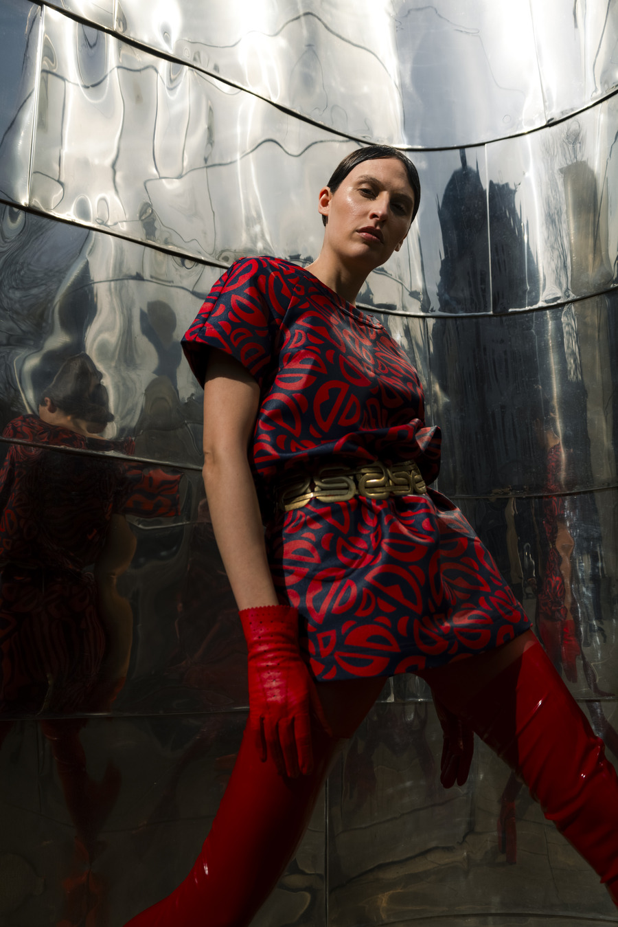 This editorial takes the viewer on a surreal journey where fashion and environment merge into a deceptive unity, blurring the line between reality and fiction. The fashion – houndstooth prints, bold colours, and structured silhouettes – acts like a second skin, a layer that conceals the inner self while simultaneously projecting something outward. The interplay of strong reds and cool blue-grey shades makes the outfits look like reflections as if they are part of the surrounding architecture.