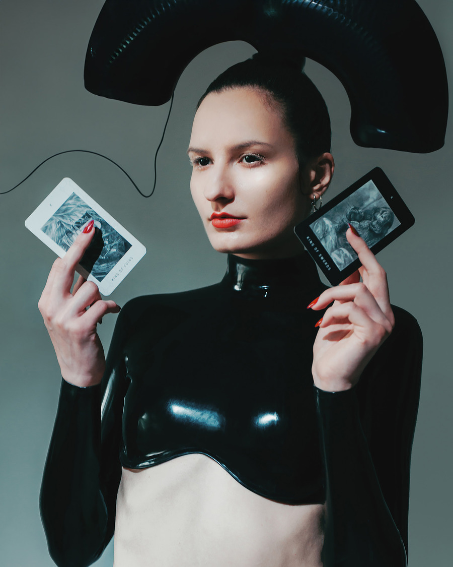 Magda’s intimate involvement is portrayed as she models with her tarot set, reflecting the countless hours invested in each motif, painstakingly drawn and brought to life through coal before finding its place on the cards, designed and photographed by me.