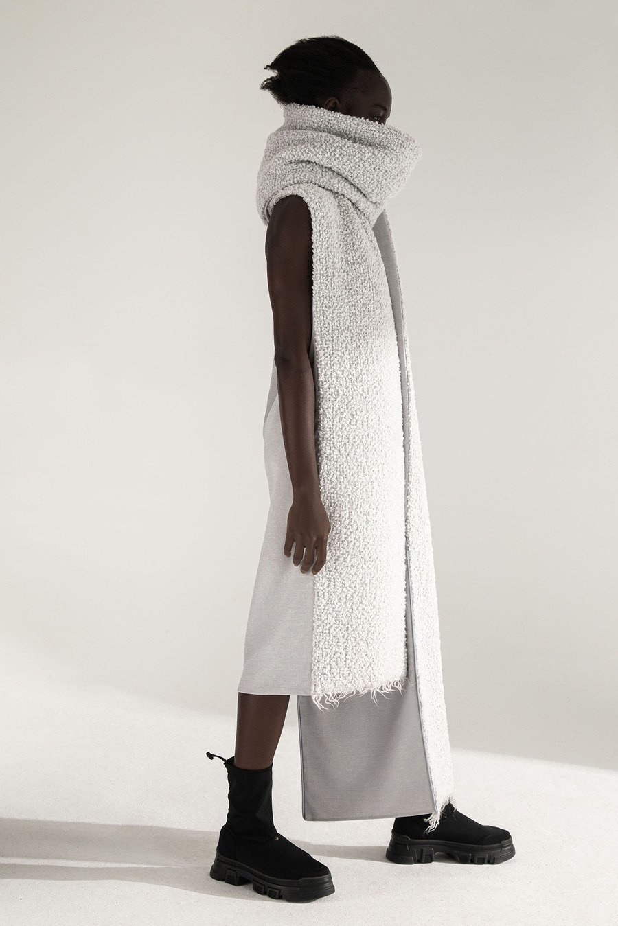 Some of the outfits offer a transformation from an exaggeratedly utilitarian unisex silhouette into a fragile feminine look and vice versa. That is an allusion to the inevitable change of a personality under the influence of force majeure circumstances, often demanding heart-breaking decisions. The key piece of the collection is a bulletproof-vest-inspired overall turning into a colossal coat with a sheer hood, referring to an angel protector of the unbreakable nation.