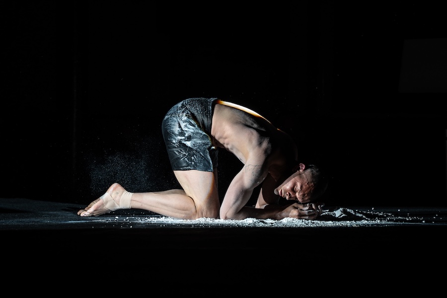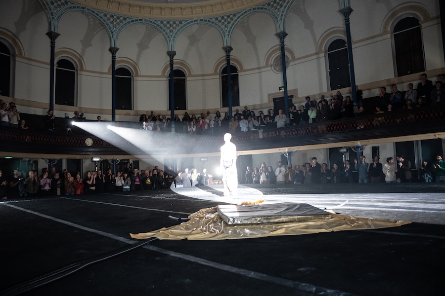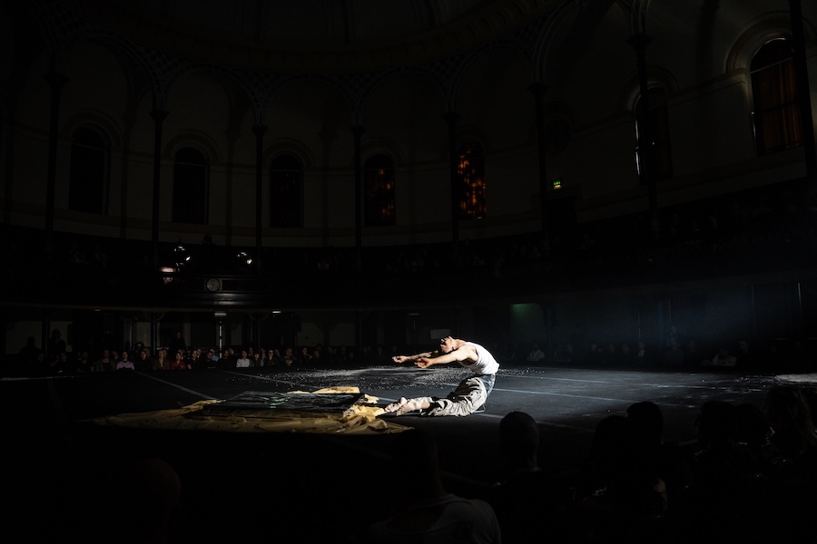 Within Bornsick, I was inspired by gymnastics warm-ups and a specific conditioning routine called Ventsi Conditioning, named after one of my Bulgarian coaches, Ventsi, which we would do religiously every Friday evening between 8 PM – 9 PM. It was experienced by generations of athletes whom he coached, and is famously known as the hardest and most gruelling experience, usually resulting in us waddling into training the morning after. In the show, I perform movements which follow the circumference of the floor, which naturally evolve and progressively get more challenging. This represents the layering or downloading of information onto the body, and by the end of this conditioning, the body is built and prepared. I believe that nothing is owned, everything is shared, and our experience is unique, but completely borrowed from everything and everyone around us. The layering of movement is the layering of identity, perhaps, building a character, piece by piece, only to discover we are just products of our surroundings and lineage.