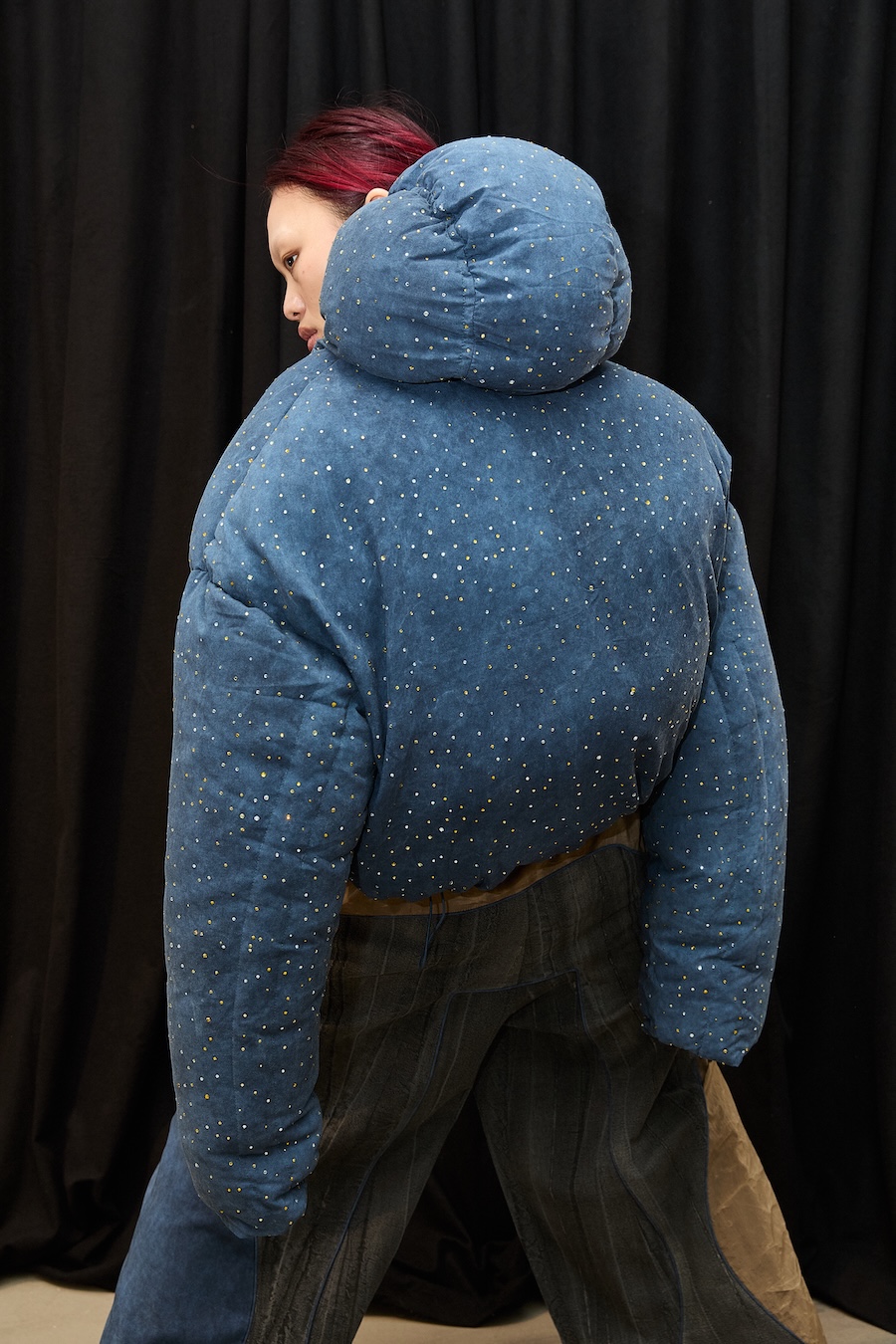 One of my friends recently said, ‘You’re a thinker. You’re a poet. An artist.’ I said, ‘Yeah, but I make puffer jackets.’ I think this piece is perhaps an example of my mind and my working toolbox. During autumn 2025, we had incredible Supermoons. I haven’t travelled, and I miss that so much. Yet I thank myself for my ability to ‘mind-travel’. I’ve worked with embellishment before, so I had this deep-dyed blue recycled rayon. I looked at those beautiful skies during the Supermoon and thought I could capture that and bring a piece of it down to the streets.