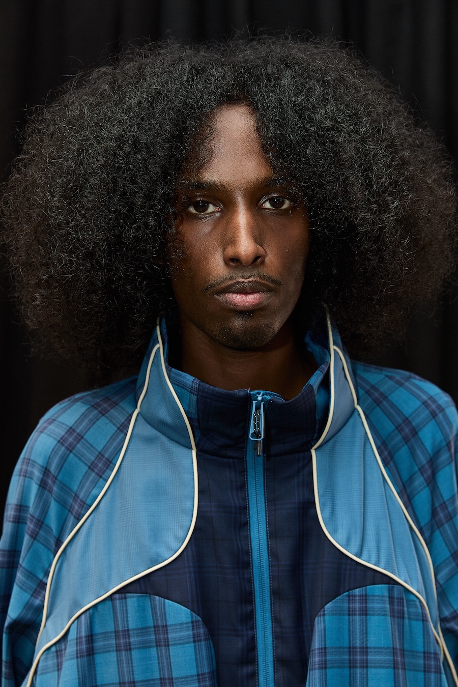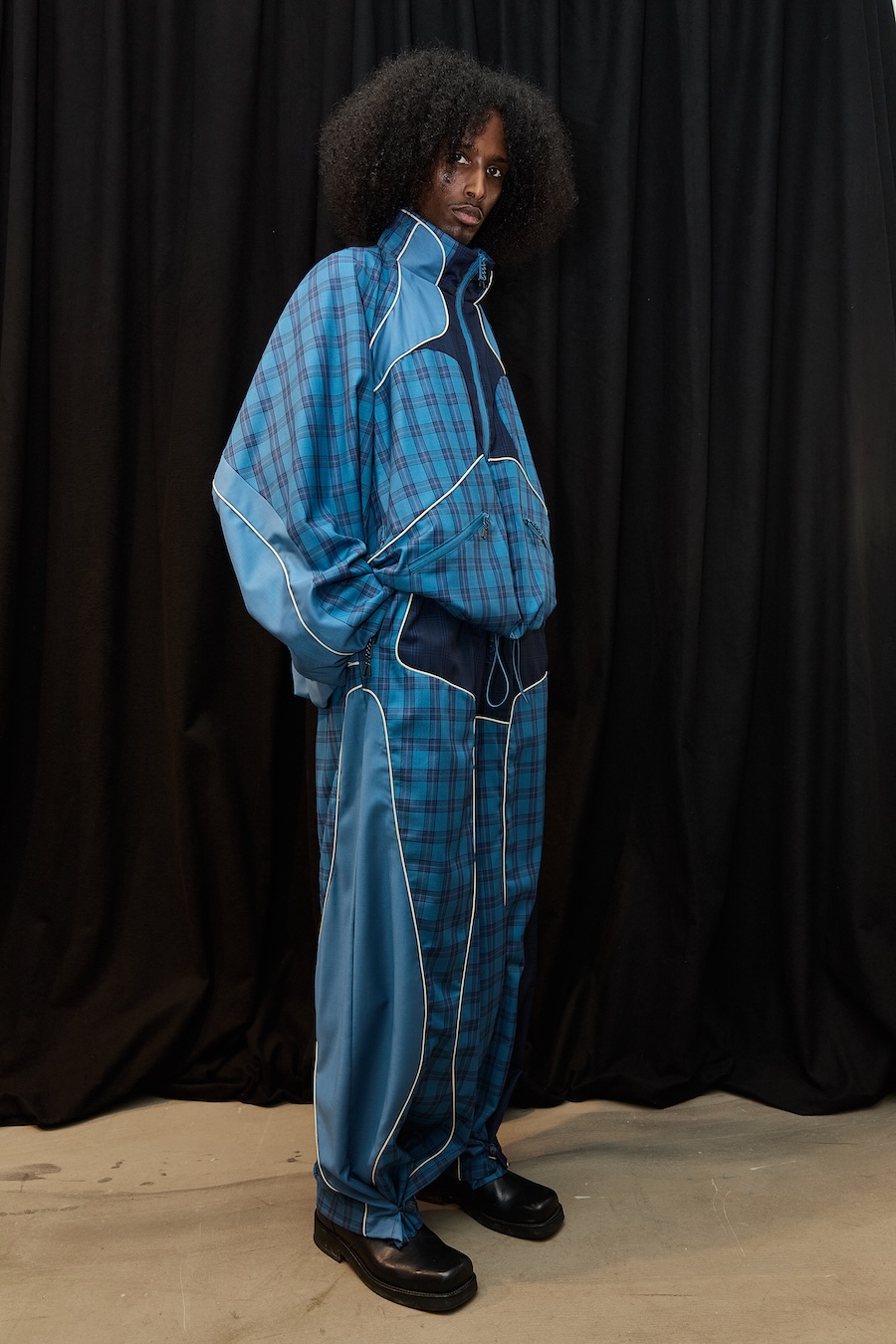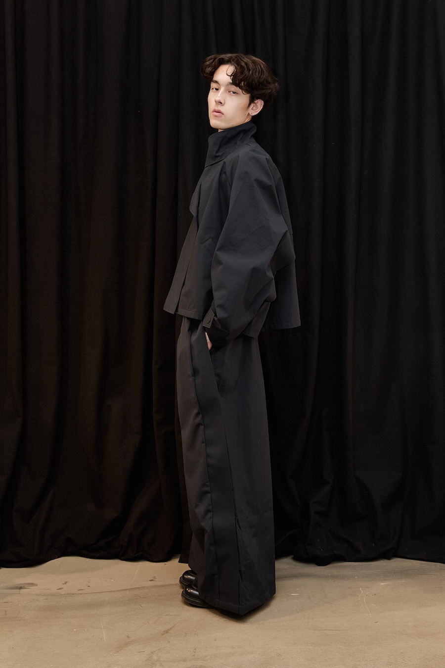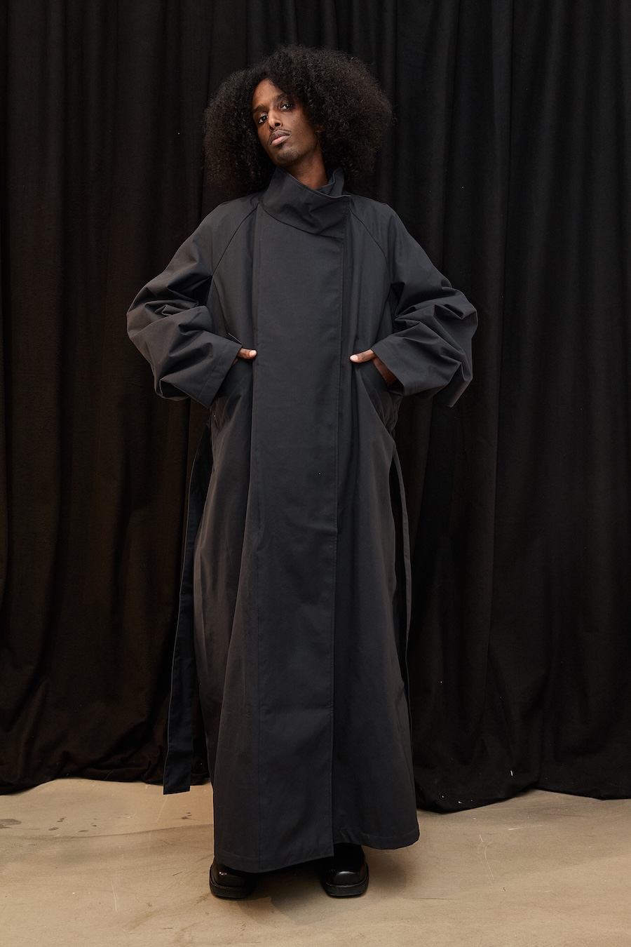 It’s what I would call ‘form over face’. There are no artworks; the fabrics and lines come through clearly. I’ve worked with organic, curved cutlines. I’m not a straight highway, not even in my quiet self. There’s more black than I would usually present, and I chose to embrace it by shooting against black, heavily draped curtains. I like it. It’s quiet but confident, somehow.
