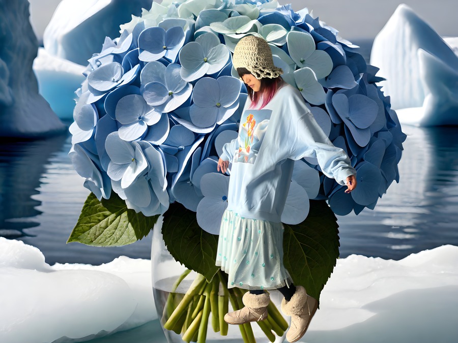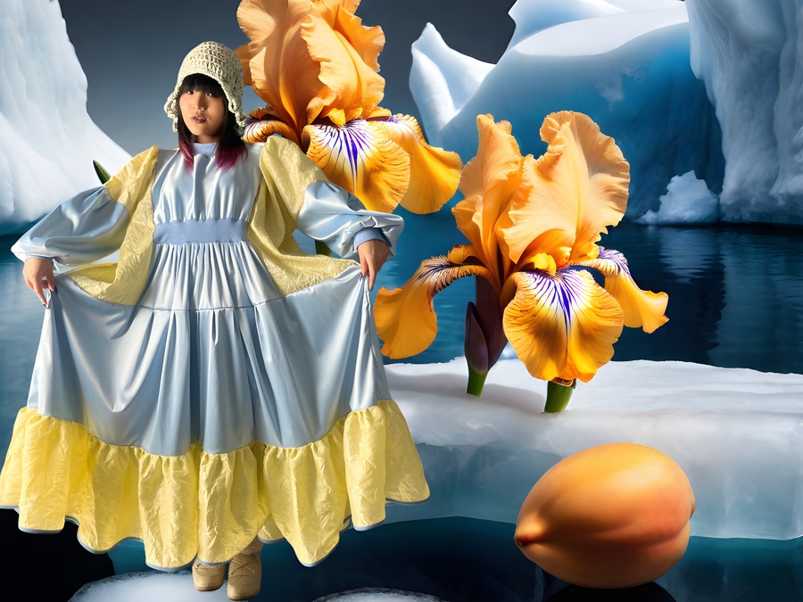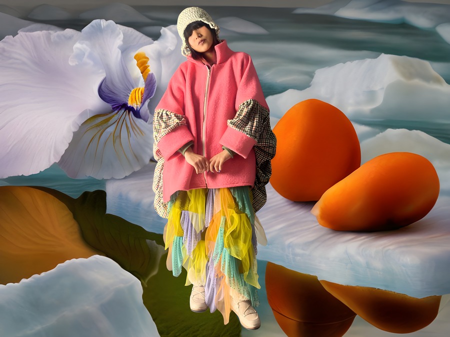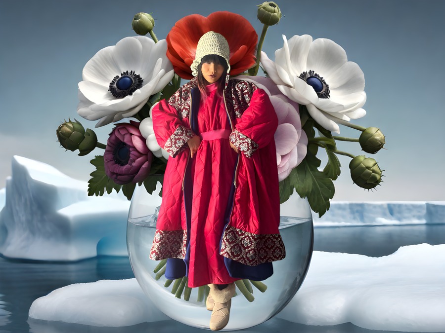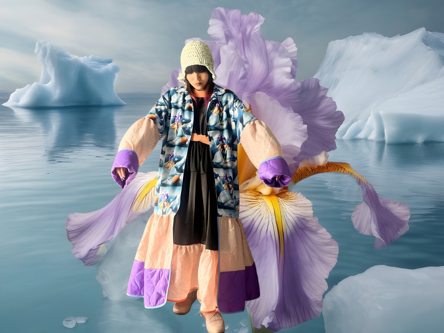 That’s why I imagined these Nature morte scenes set against an Antarctic landscape. It may not change the course of history, but it’s an invitation to slow down and take the time to look, to melt into the contemplation of the landscape. This is why the model offers a figure that harmonizes with Nature Mortre. Like a mise en abîme. It’s an invitation to be in harmony with Nature, and for me, this doesn’t mean the minimalism often advocated by fashion critics. I’m not interested in uniforms, even if they’re made of organic cotton and recycled. I find it dangerous and highly stressful. The designs in this collection are inspired by the flowers in the various scenes. The designs in this collection are inspired by the flowers in the various scenes. I find nature an organic source of inspiration.