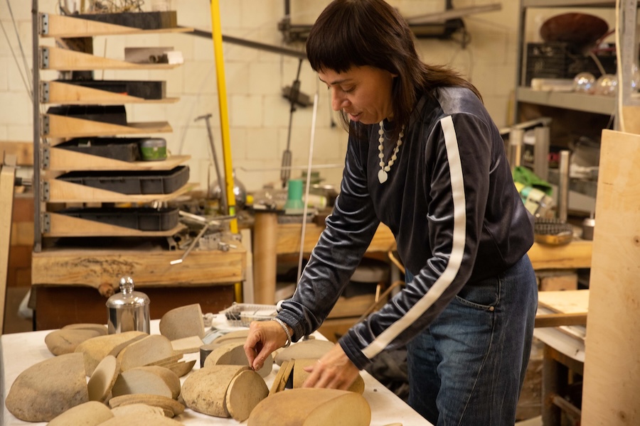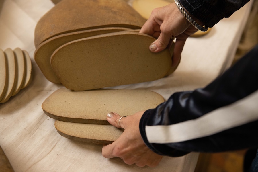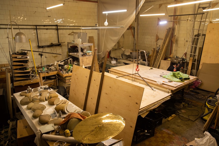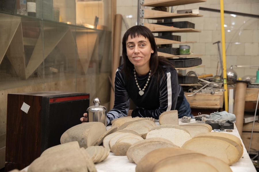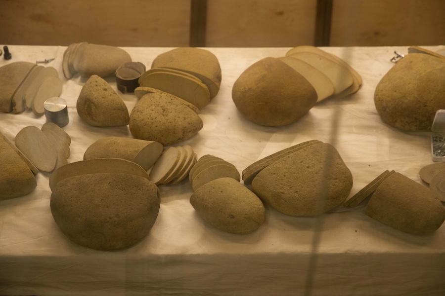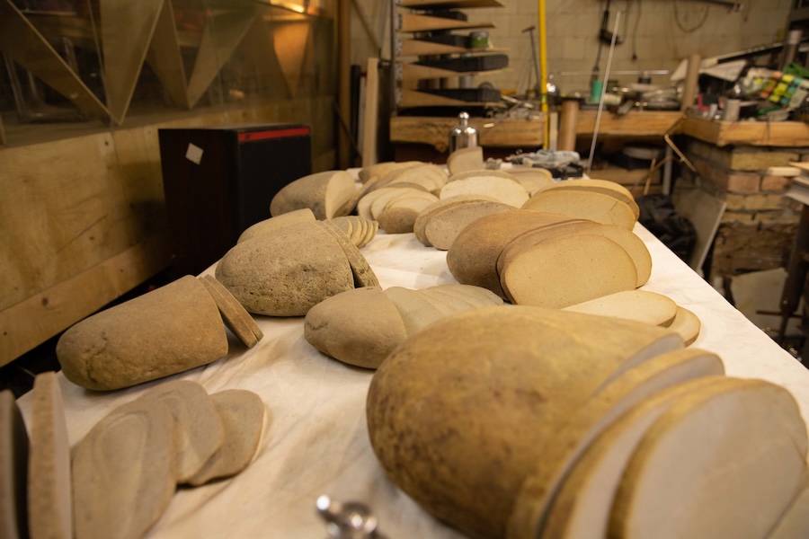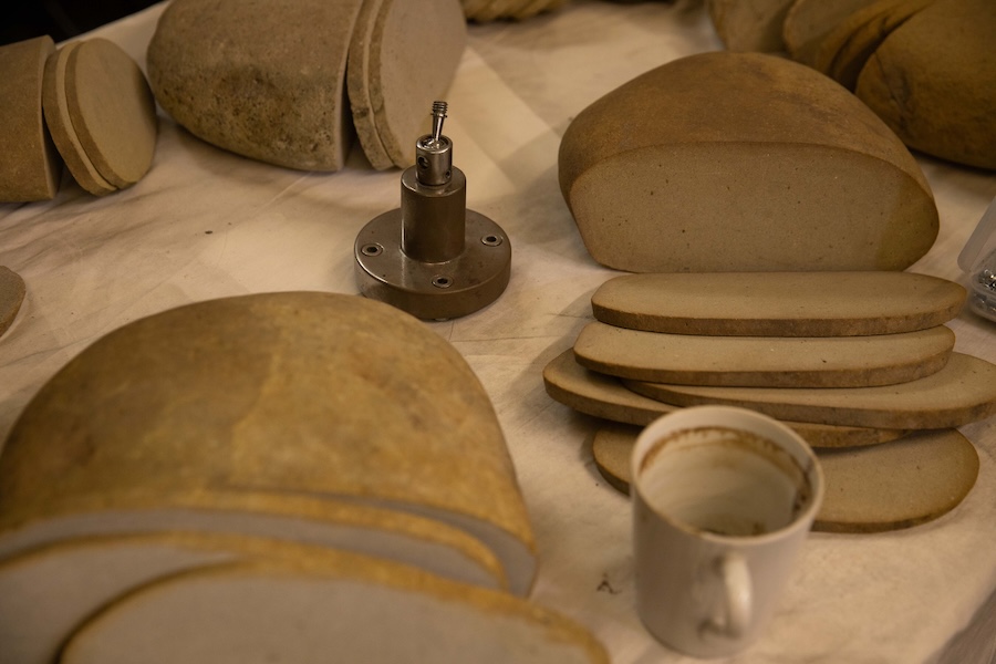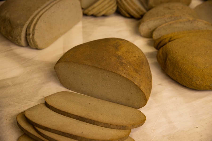 In the first days, we cooked with firewood. Later, we got a fridge, an electric stove, bought some things, set up the internet, and arranged our living space. The “Palyanytsia” project came about because there was a mountain stream near the village, and on the riverbank, we found smooth stones. While walking there, we found a stone that resembled bread and decided that it was “palyanytsia.” At that moment, in the first month of the war, the word “palyanytsia” was used as a password to identify Russian saboteurs, as they couldn’t pronounce it correctly. This word became mythologised as a password, a symbol of our resilience. We took the stone, bought an angle grinder at the nearest hardware store, got a stone disc, and started cutting to see how it would look. And we cut it. Currently, there have already been more than 40 exhibitions worldwide with this project.