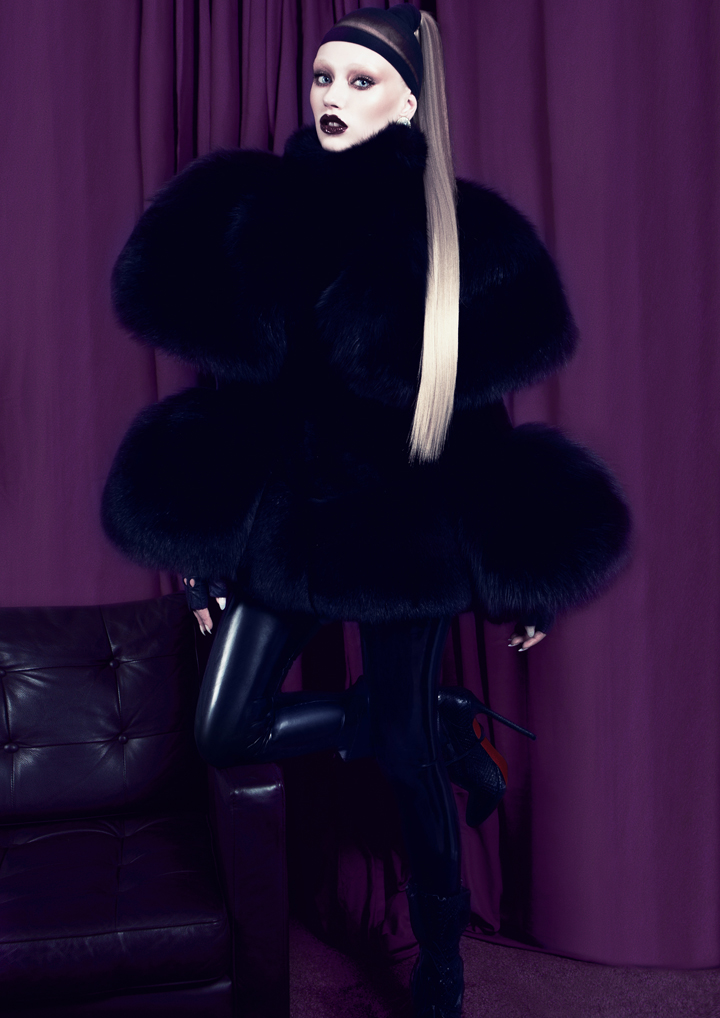 Dress: Meadham Kirchhoff / Fur Stole: Sorapol / Shoes: Gianmarco Lorenzi / Leather Collar: Tamzin Lillywhite / All Jewelry: Circo