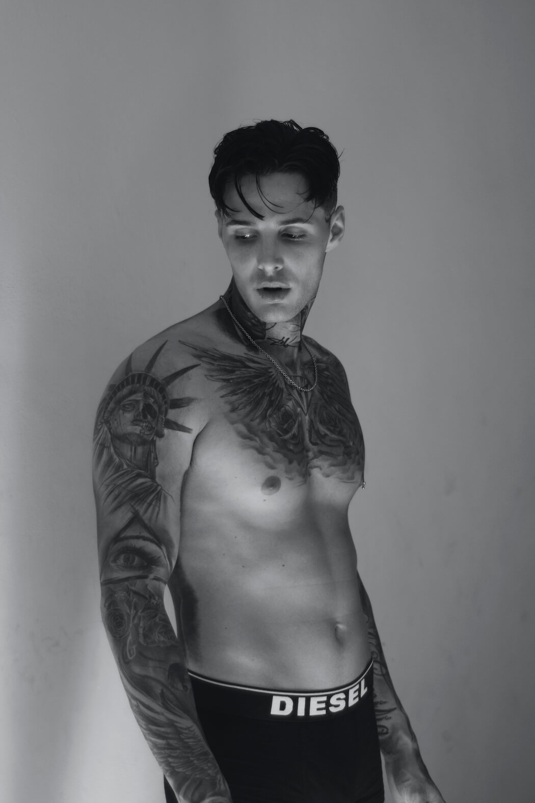 A KALTBLUT exclusive. Photography by Harvey Borja Lesmes. Model is Renzo Perrone. Brands are Moschino, Diesel, Calvin Klein and Roberto Cavalli.