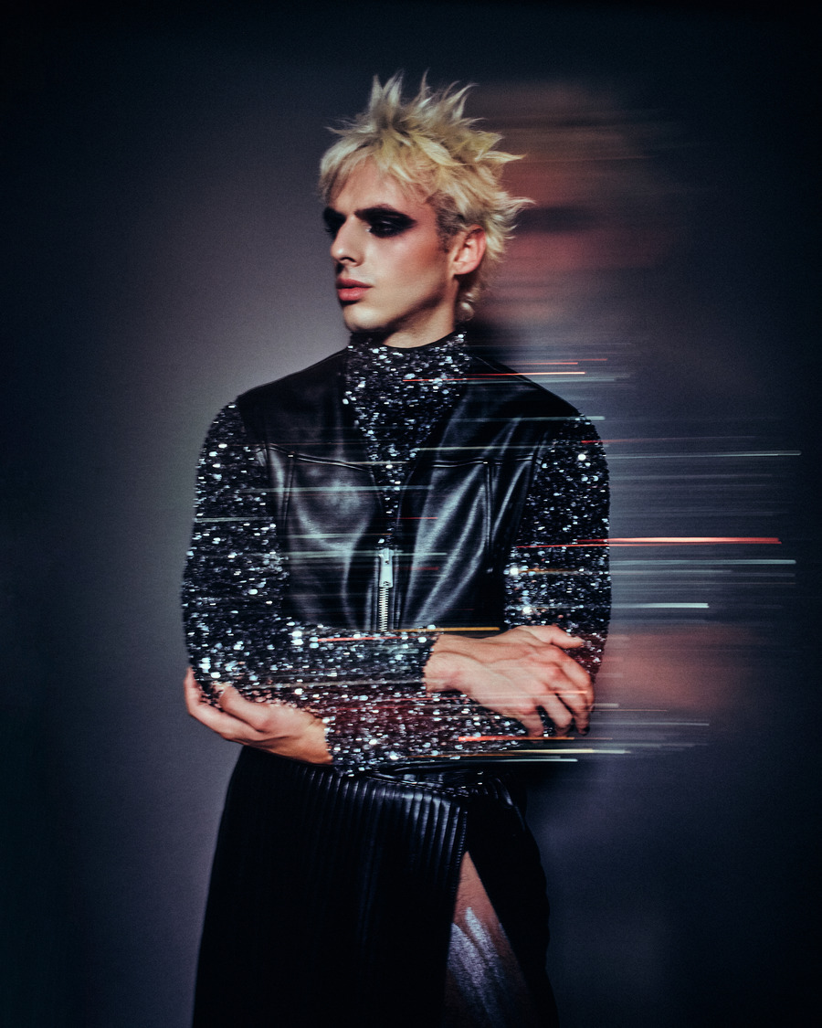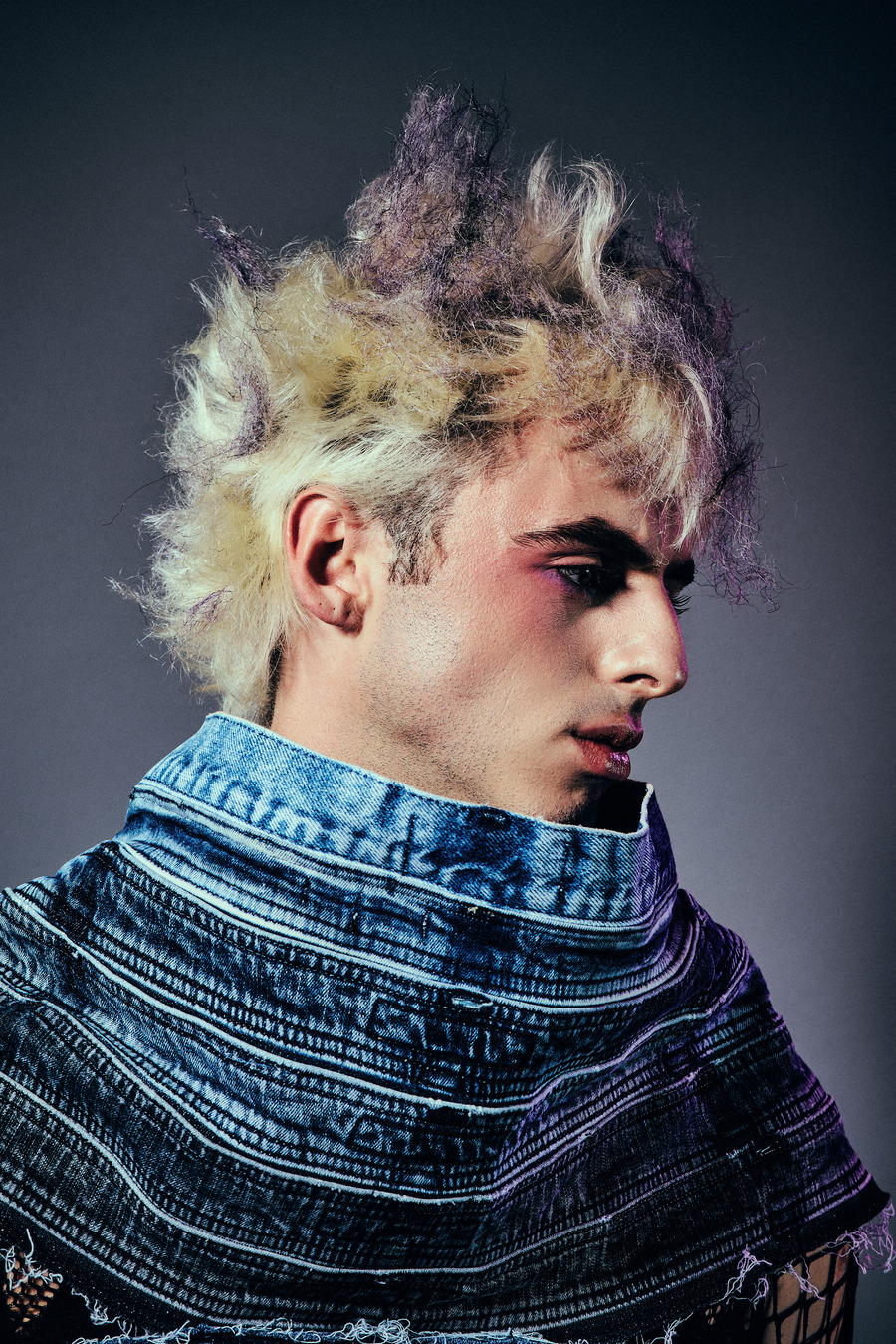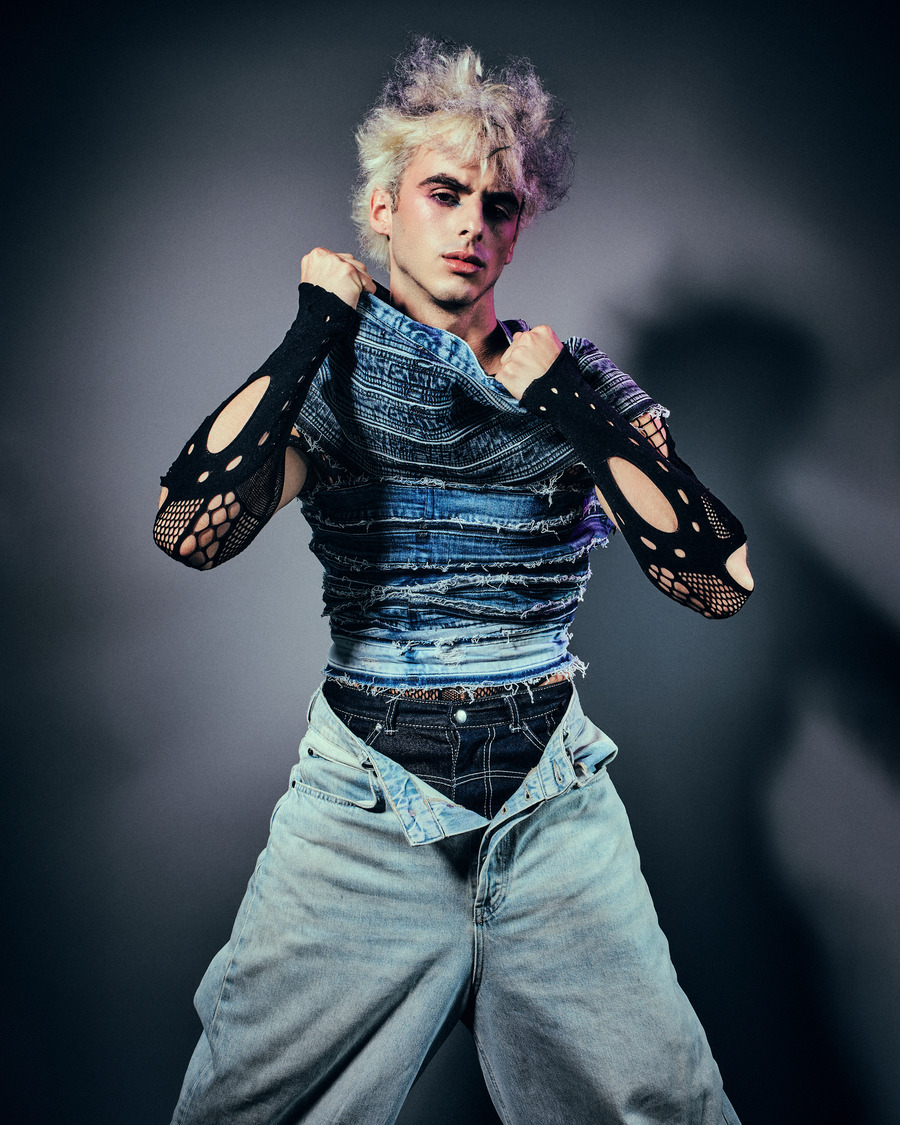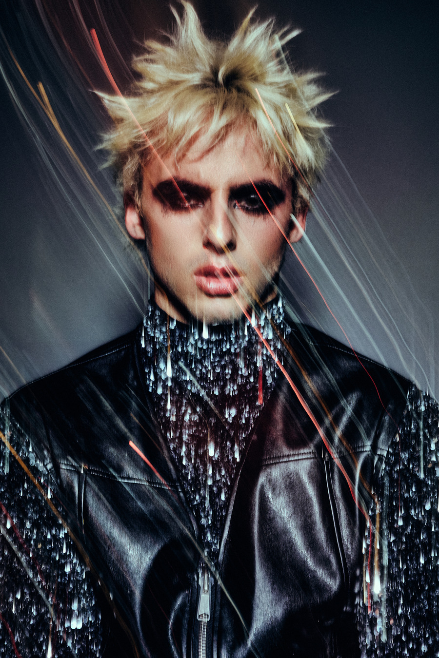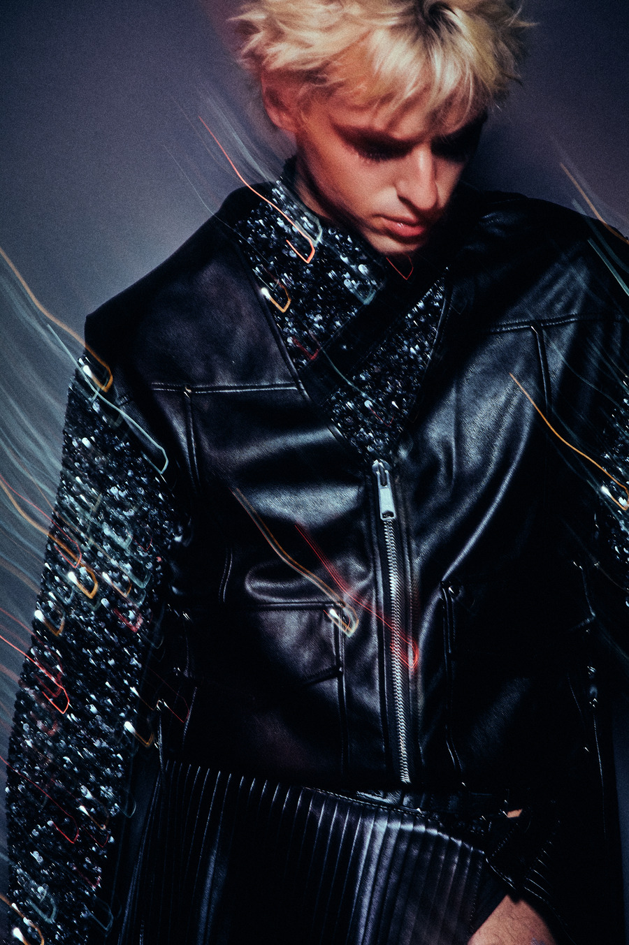 This editorial delves into the complex facets of human personality, exploring themes such as gender identity, desire, madness, and self-love. These questions form the foundation of the subject’s transformations, embodying an internal conflict between light and shadow, strength and fragility. The constructed outfits, made of leather, denim and metal, symbolize resilience and vulnerability. The character’s fluid identity blurs the boundaries between masculine and feminine, illustrating a constant quest for self-reinvention. Inspired by the worlds of Tim Burton, David Fincher, and the Wachowski sisters, this project examines the limits between reality and imagination, reflecting on the fluidity of being.