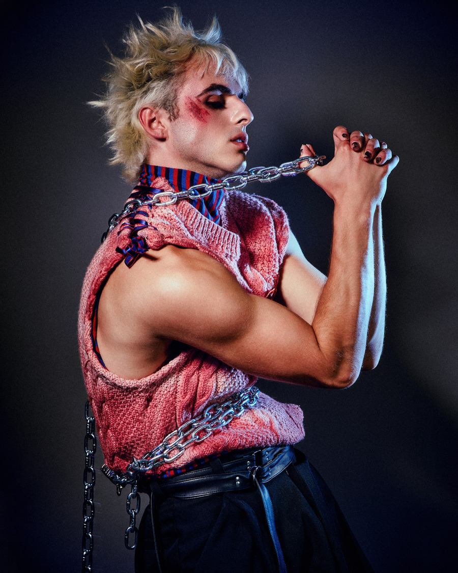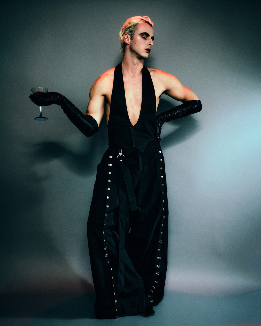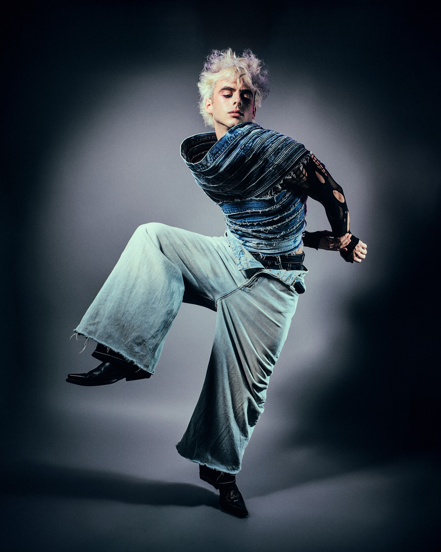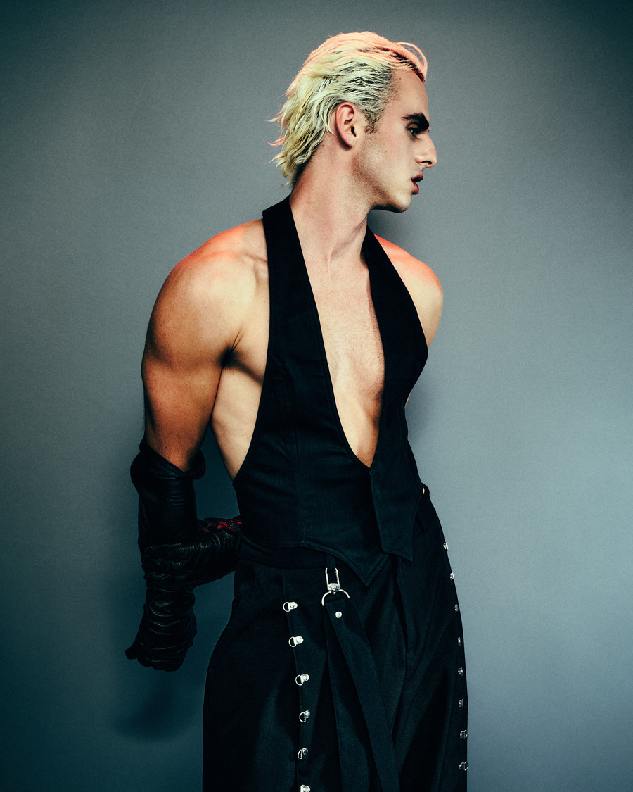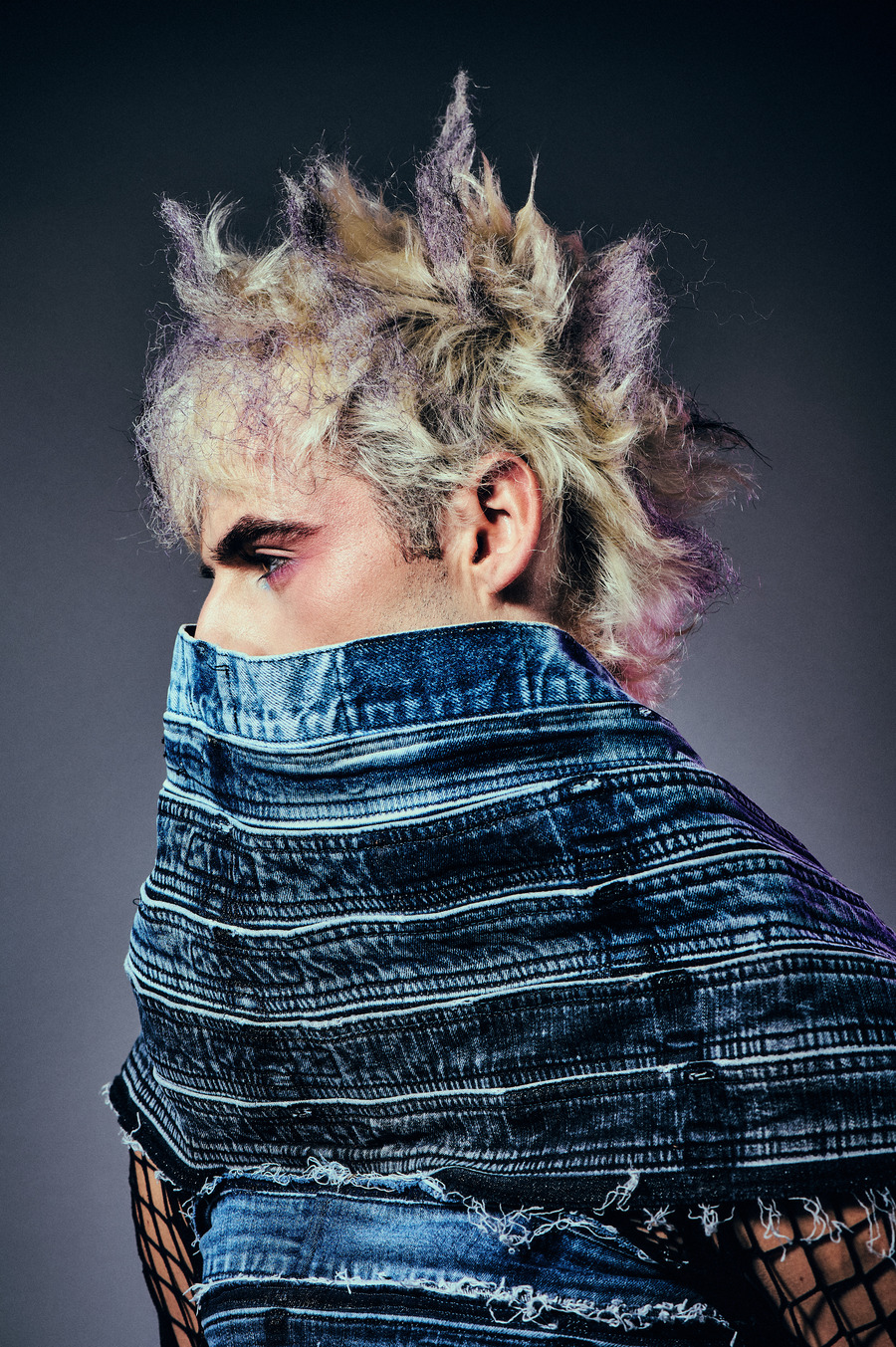 This editorial delves into the complex facets of human personality, exploring themes such as gender identity, desire, madness, and self-love. These questions form the foundation of the subject’s transformations, embodying an internal conflict between light and shadow, strength and fragility. The constructed outfits, made of leather, denim and metal, symbolize resilience and vulnerability. The character’s fluid identity blurs the boundaries between masculine and feminine, illustrating a constant quest for self-reinvention. Inspired by the worlds of Tim Burton, David Fincher, and the Wachowski sisters, this project examines the limits between reality and imagination, reflecting on the fluidity of being.