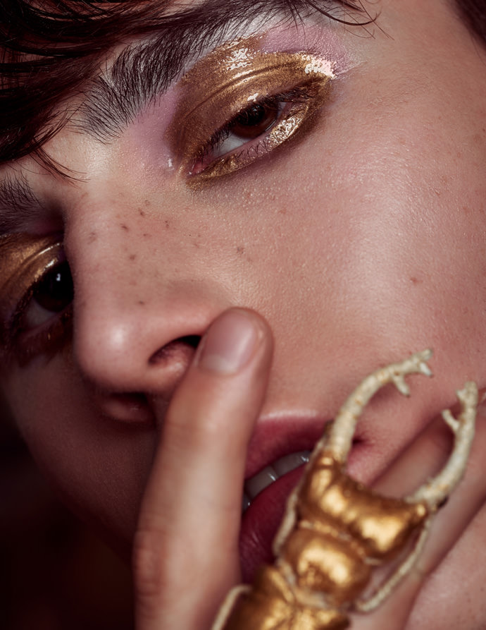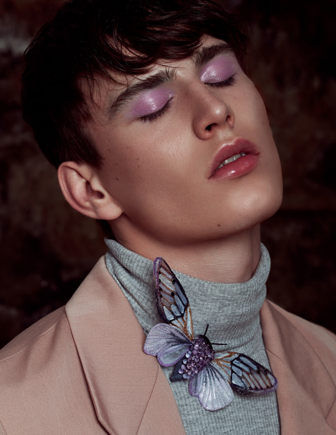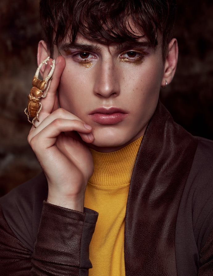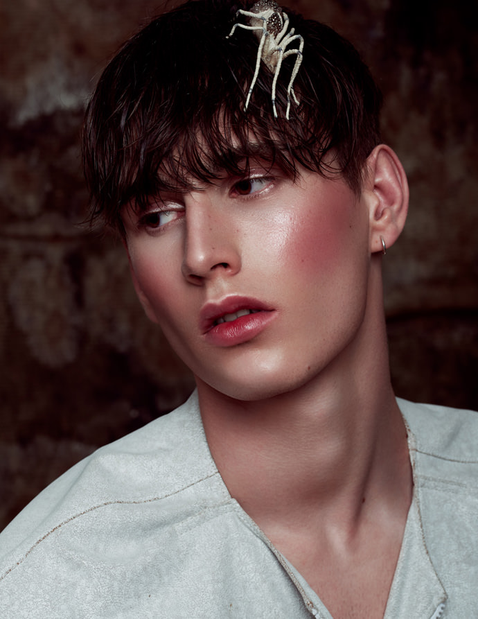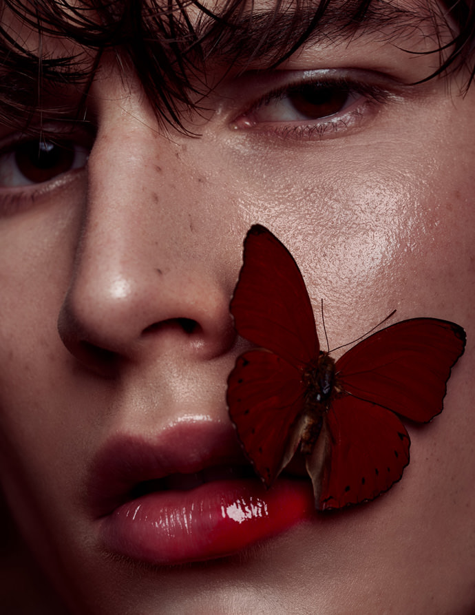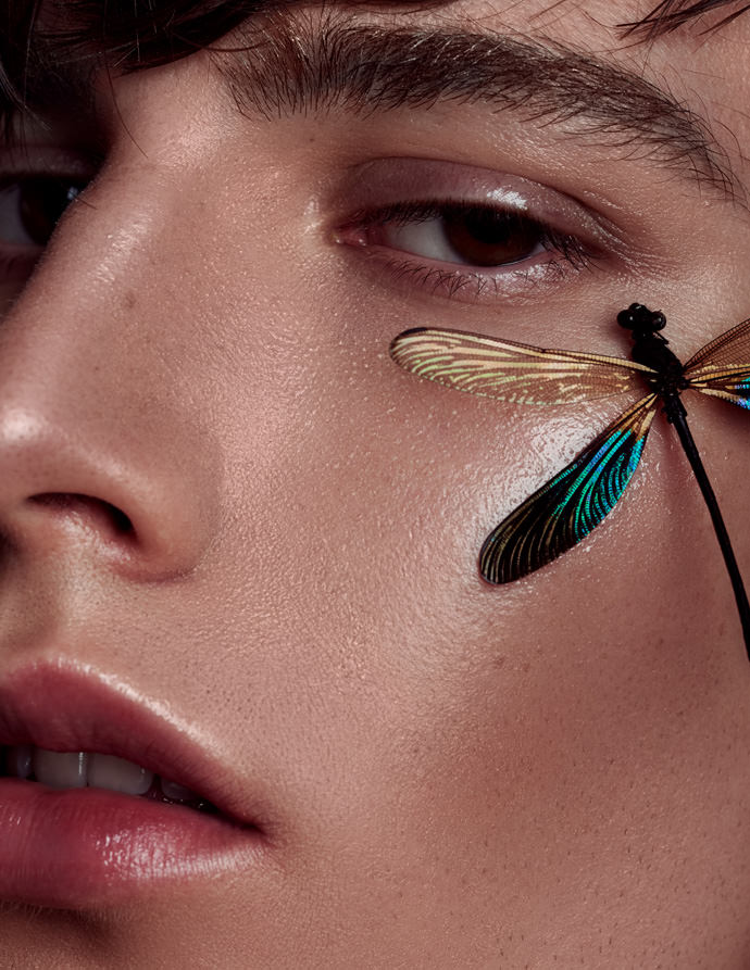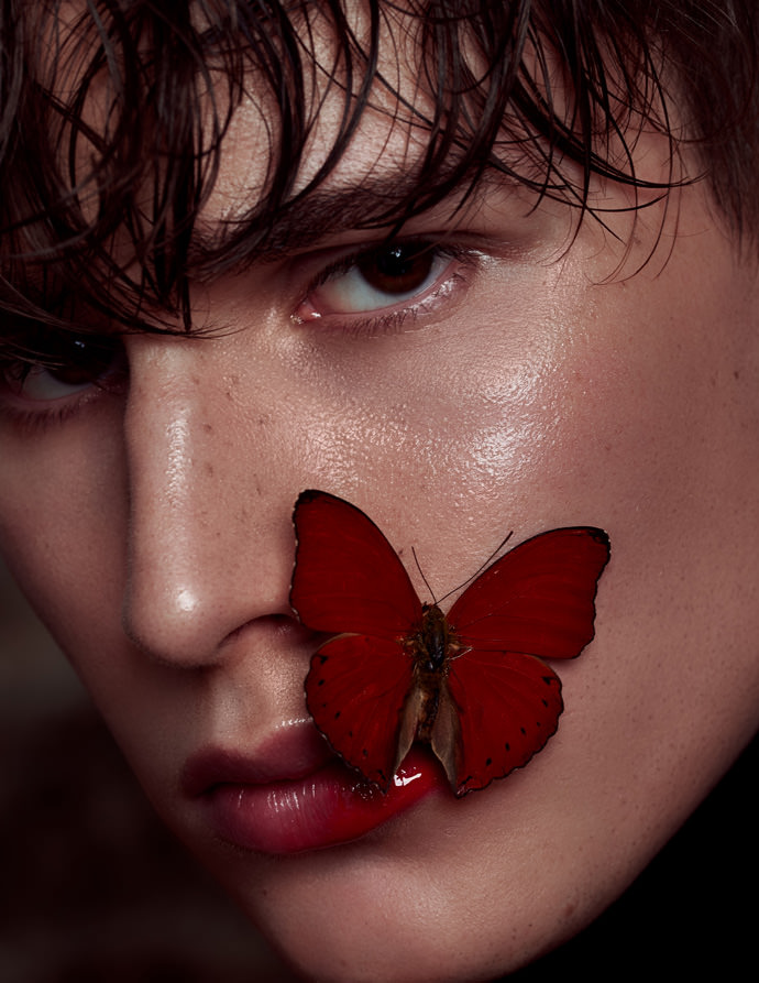 Since beauty photography means usually shooting beautiful female models with clear skin and a soft, innocent look, the concept was to create a more unusual beauty editorial. The angular face of the male model in a dark light mood mixed with the fragility of the insects results a great contrast.