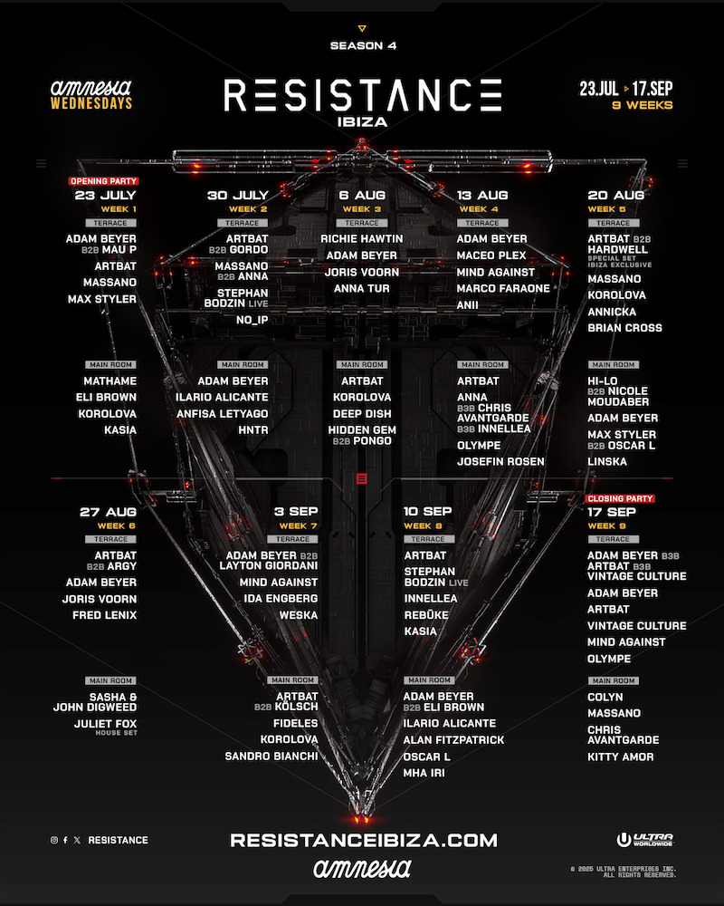 Explore the full program, lock in your tickets, and get tuned for the season at resistanceibiza.com