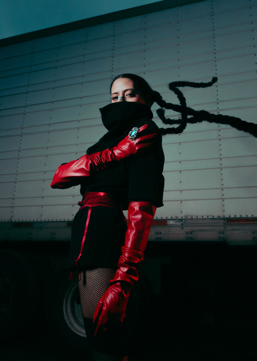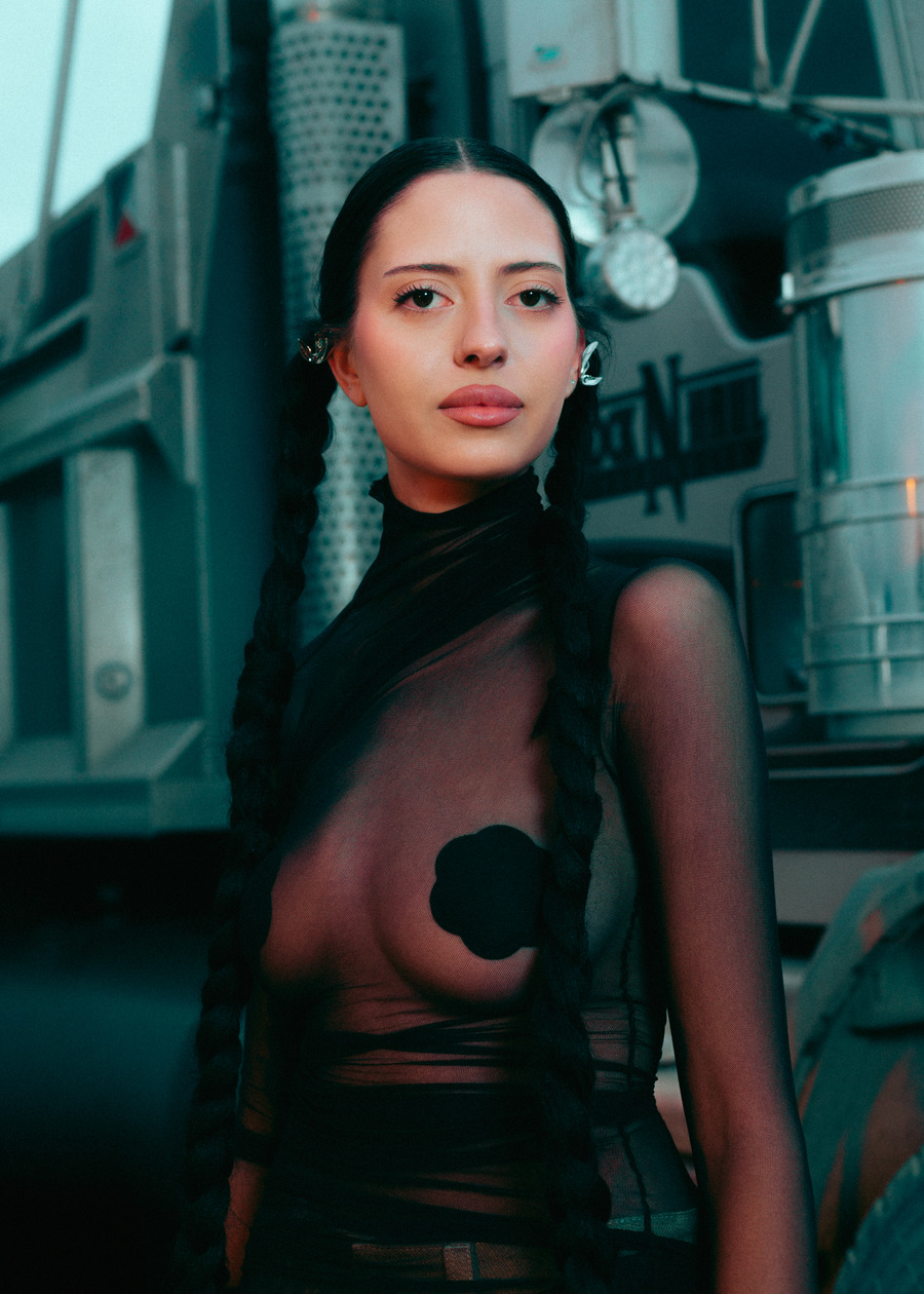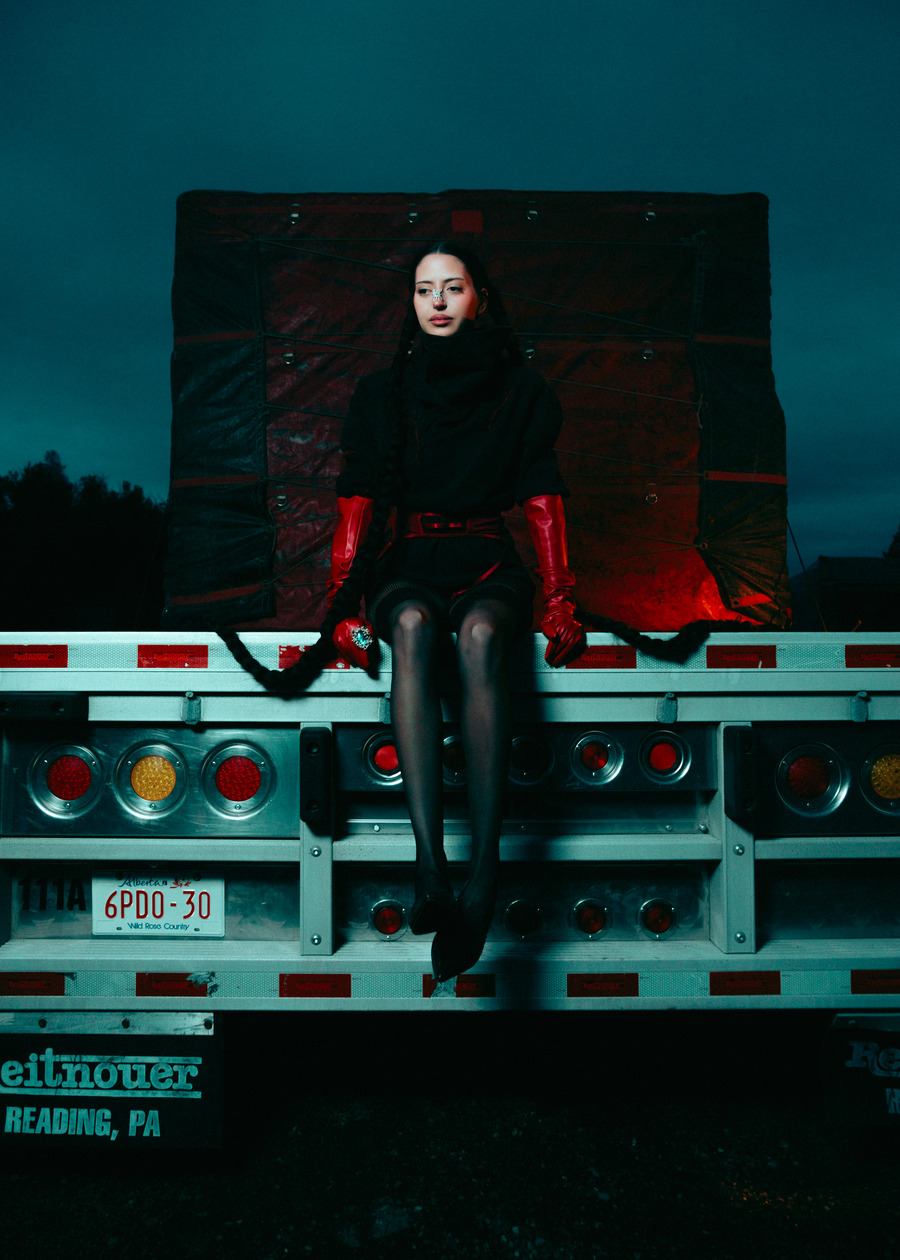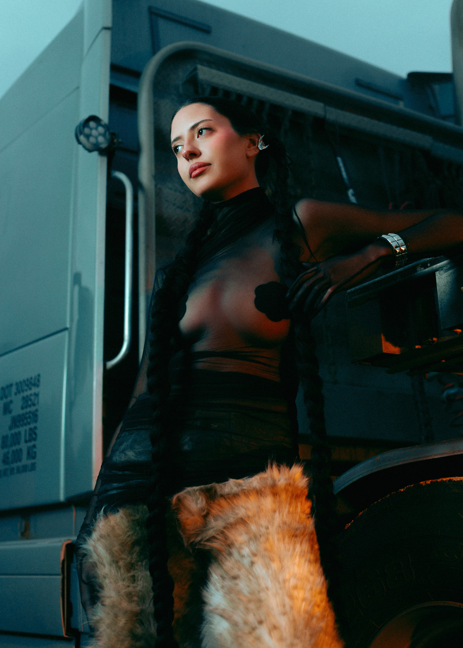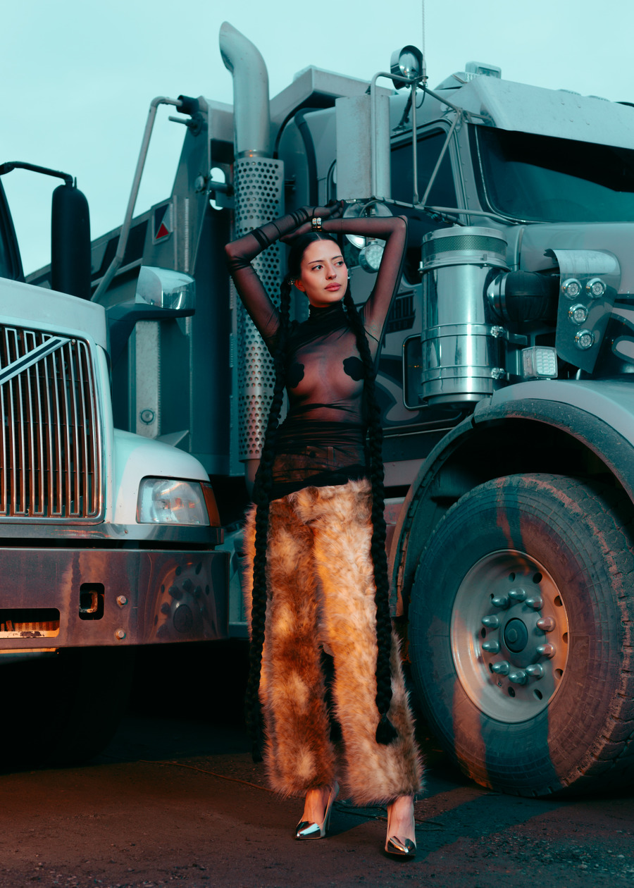 A KALTBLUT exclusive. The model is Jenica Daniels. Photography by Tatum Maclean. Layla Desjardins is a stylist and art director with a background in visual communications. Her latest work, Inter State is an editorial that reimagines the mystique of roadside Americana. Towering industrial trucks, twisted metal, and chain-link fences set an eerie, cinematic tone, complemented by designs from Rick Owens, Ann Demeulemeester, Paula Canovas del Vas, and Post Archive Faction. Hair by Ashley De Souza. Makeup by Jenica Daniels.