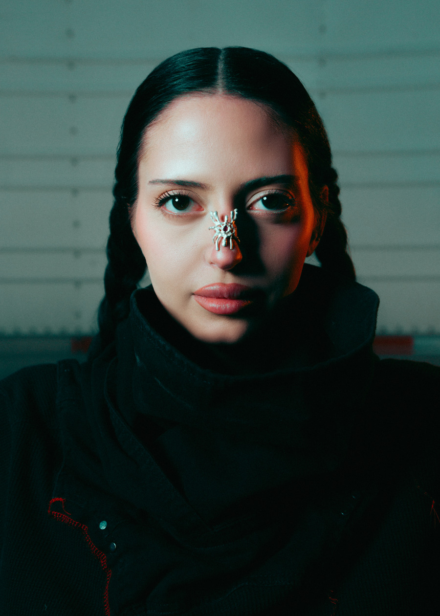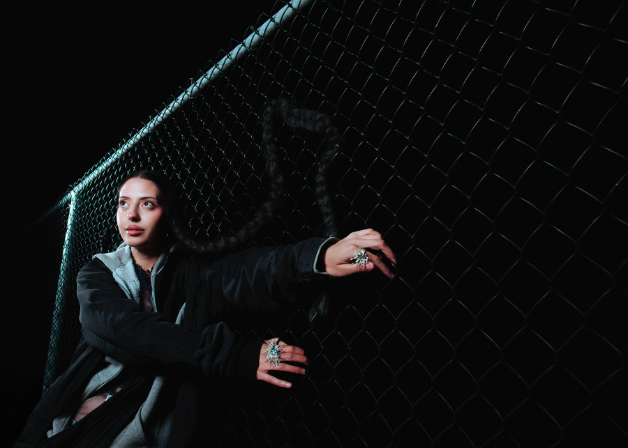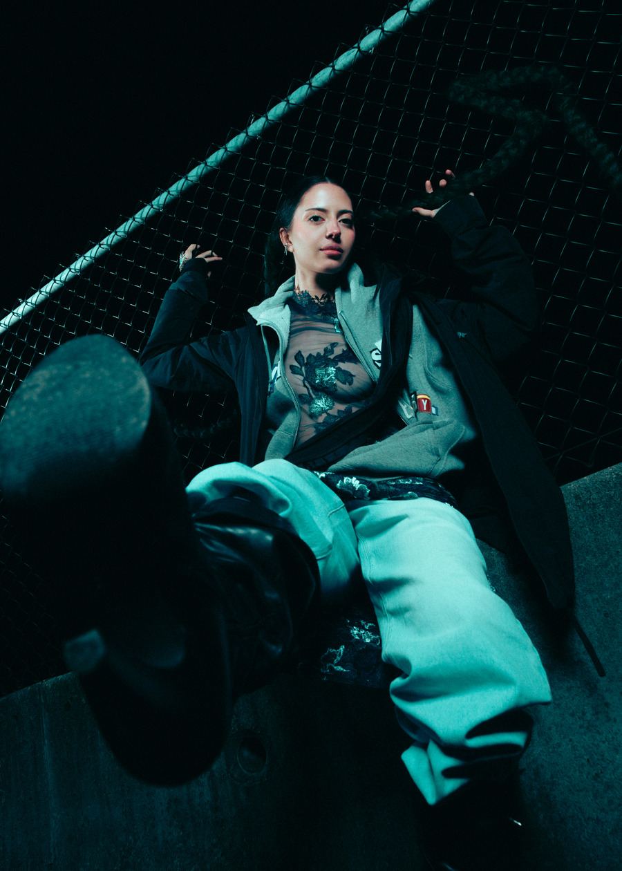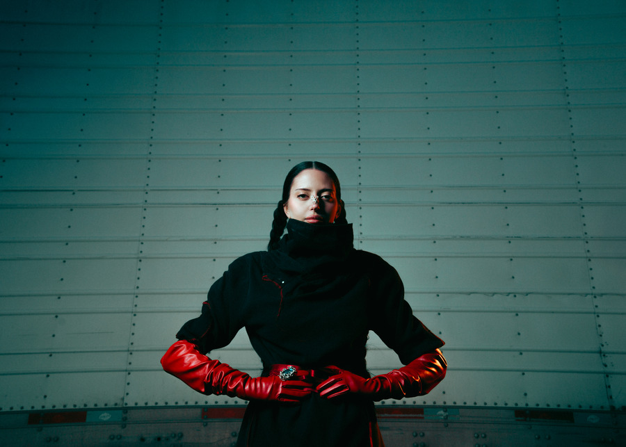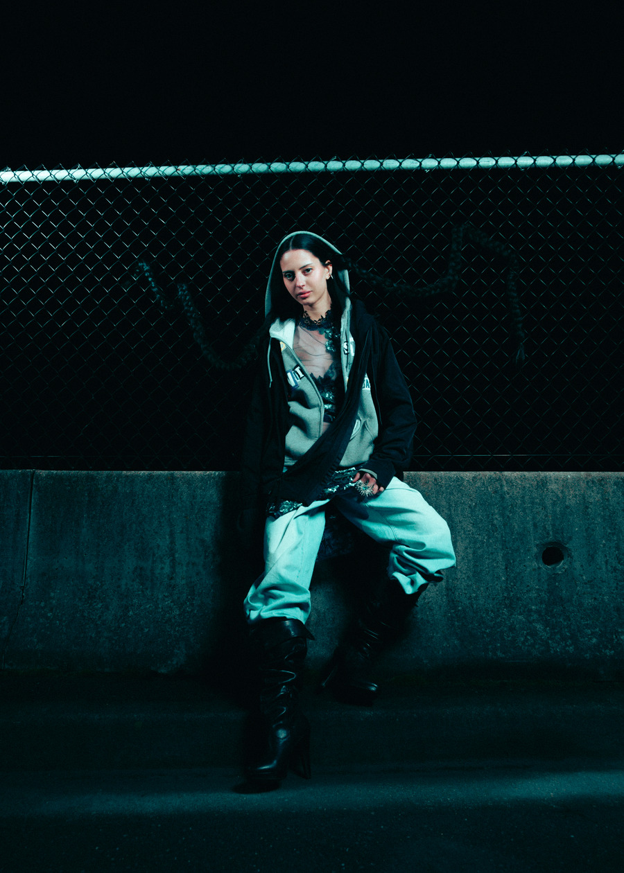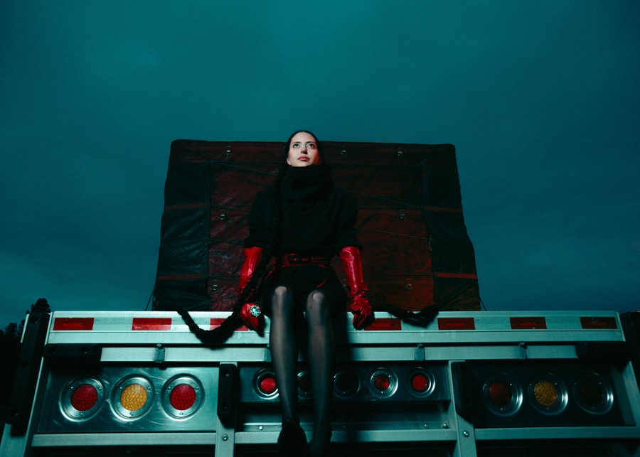 A KALTBLUT exclusive. The model is Jenica Daniels. Photography by Tatum Maclean. Layla Desjardins is a stylist and art director with a background in visual communications. Her latest work, Inter State is an editorial that reimagines the mystique of roadside Americana. Towering industrial trucks, twisted metal, and chain-link fences set an eerie, cinematic tone, complemented by designs from Rick Owens, Ann Demeulemeester, Paula Canovas del Vas, and Post Archive Faction. Hair by Ashley De Souza. Makeup by Jenica Daniels.